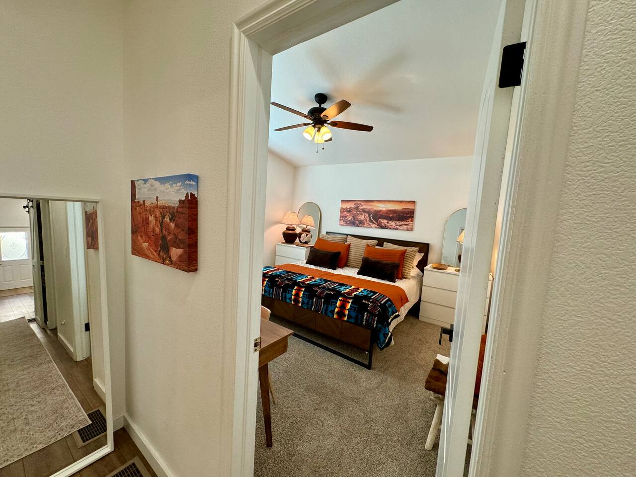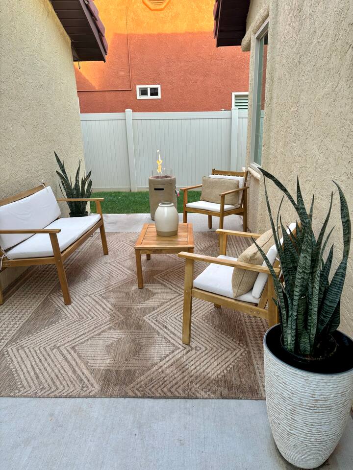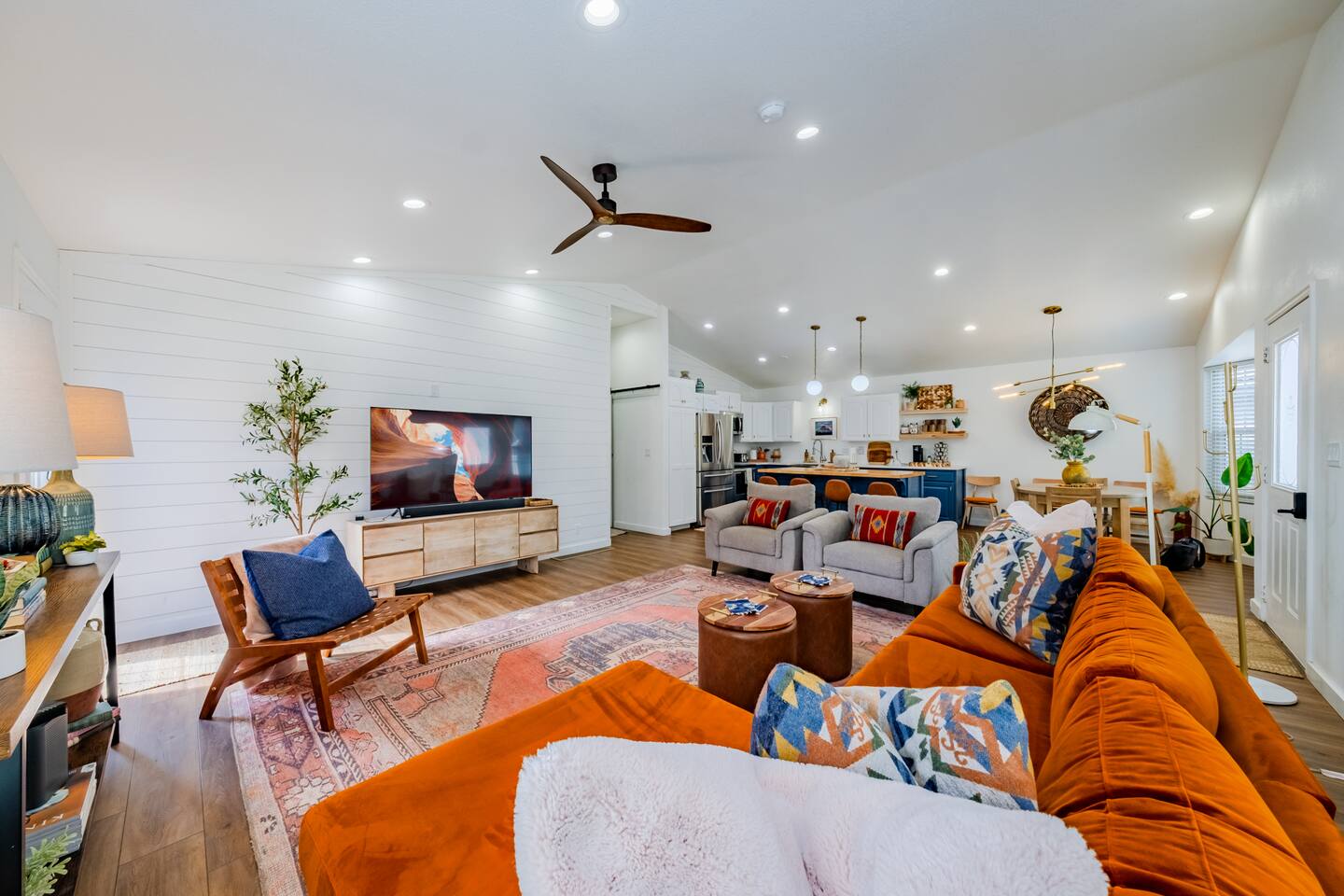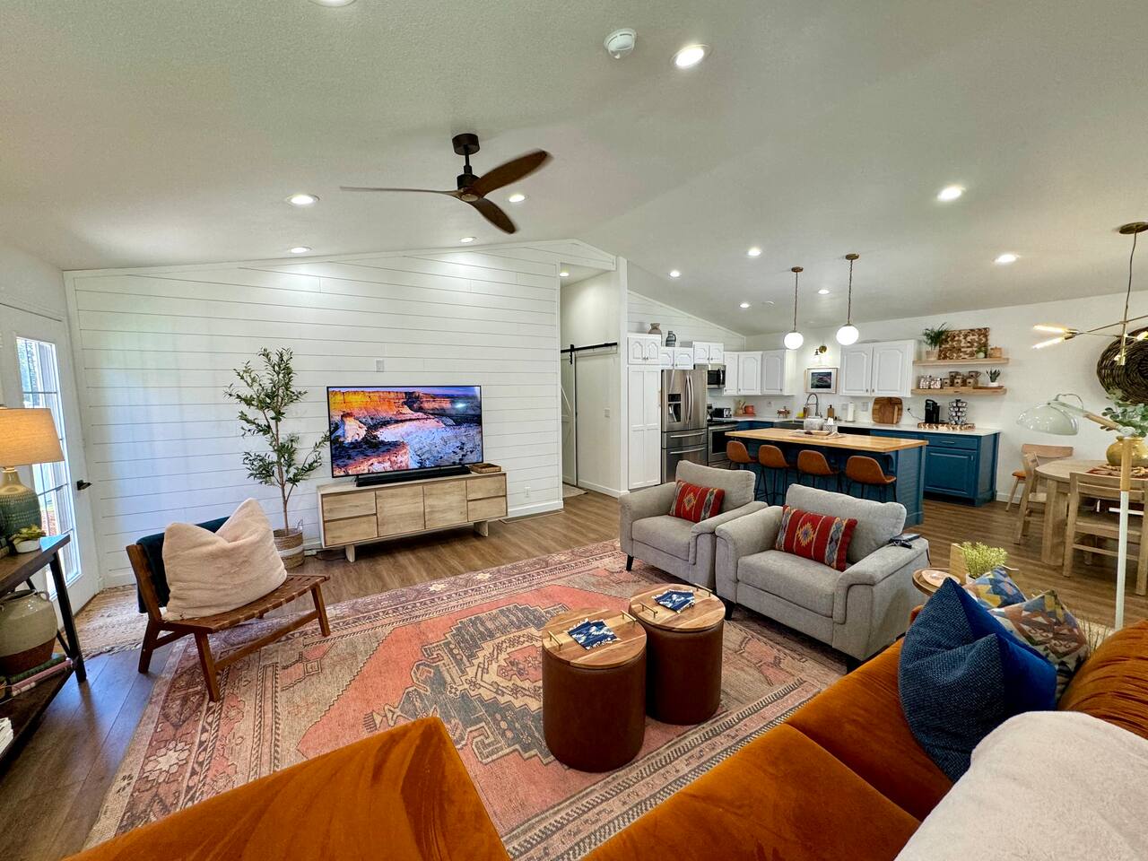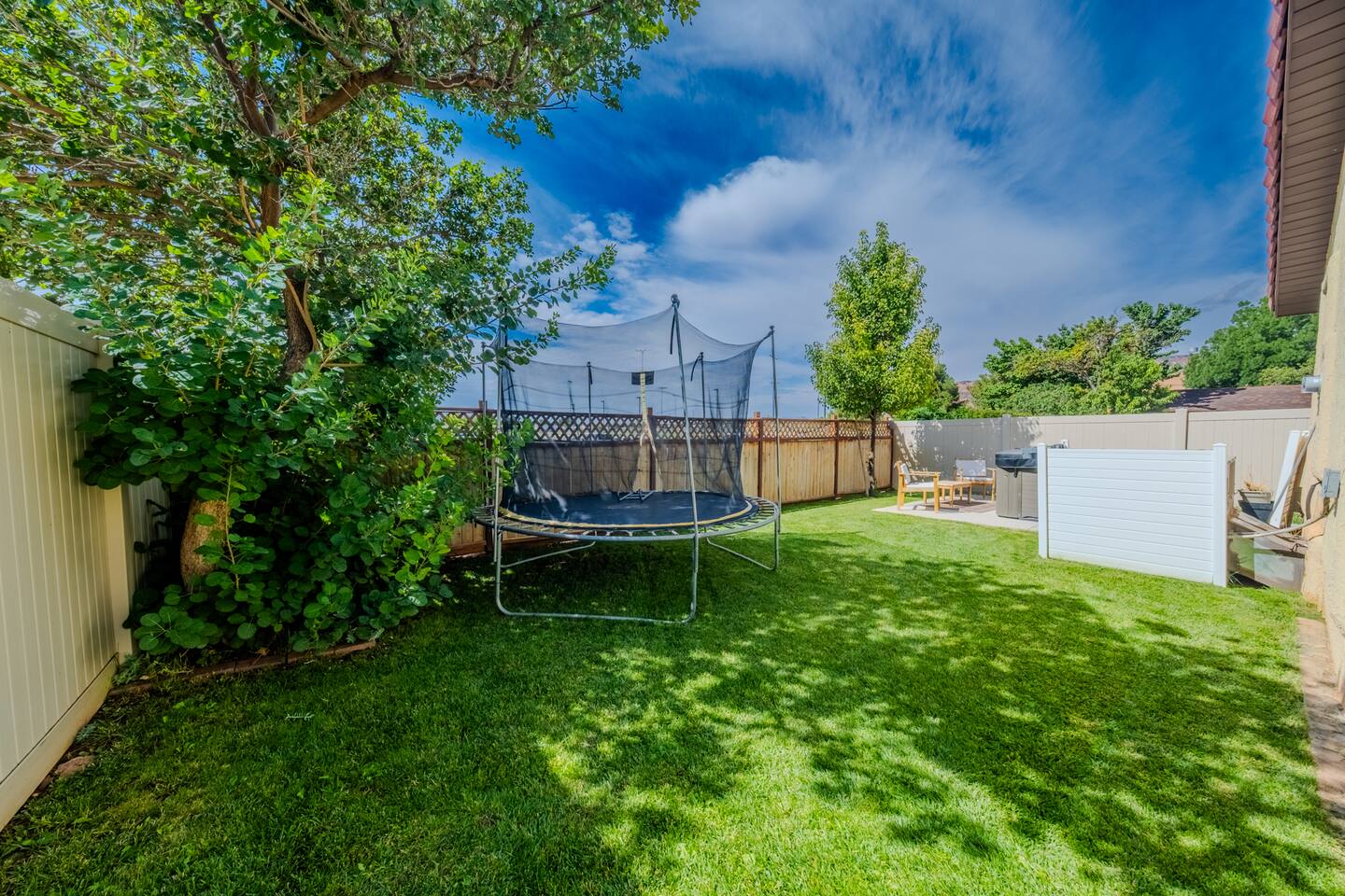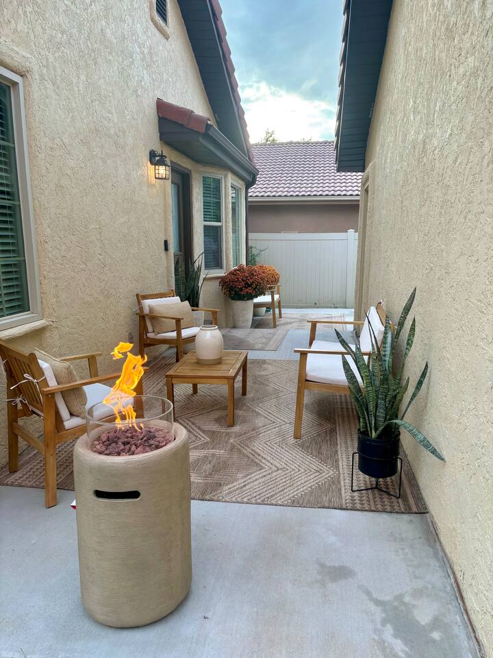 When you walk through the gate to the home, you are greeted with a charming patio and propane fire. As you step through the front door, you'll find a large combined dining, living, and kitchen area. The living area features a large HD TV, perfect for movie nights. The kitchen is fully stocked with all essentials, ensuring you have everything you need for a comfortable stay. The home features a stylish and rustic Southern charm theme. There's even a dedicated coffee area with everything you need to make your favorite brews. Down the hallway, you will find a laundry room that is fully stocked and ready for use. There's a full bathroom equipped with bath soaps for your convenience. Next, you'll discover the master bedroom with an ensuite bathroom. This cozy space is beautifully decorated, ensuring a comfortable and stylish retreat. Across the hall, you'll find the other two bedrooms. The first features unique and comfortable twin-over-twin bunk beds, a cozy seating area, and a lovely view of the backyard. The second bedroom offers a queen-size bed, closet doors that are full-size mirrors, and beautiful art that adds a touch of elegance to the room. The backyard is a serene space, perfect for relaxation and outdoor activities. It features a well-maintained lawn, a patio area with comfortable seating, and a barbecue grill for outdoor dining. The space is beautifully landscaped with a variety of plants and flowers, creating a peaceful and inviting atmosphere. There's also a garden with delicious tomatoes that guests are welcome to pick if they are ripe. For some fun, there's a trampoline with a safety net for added security. To top it all off, there's a private spa for ultimate relaxation. This charming and cozy property offers a perfect blend of rustic Southern charm and modern amenities. Nestled near Zion, Bryce Canyon, and many other incredible outdoor adventures that Kanab has to offer, it promises an unforgettable experience. You definitely don't want to miss out on this place!