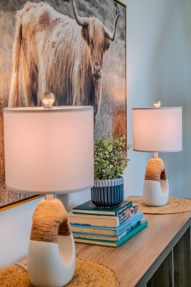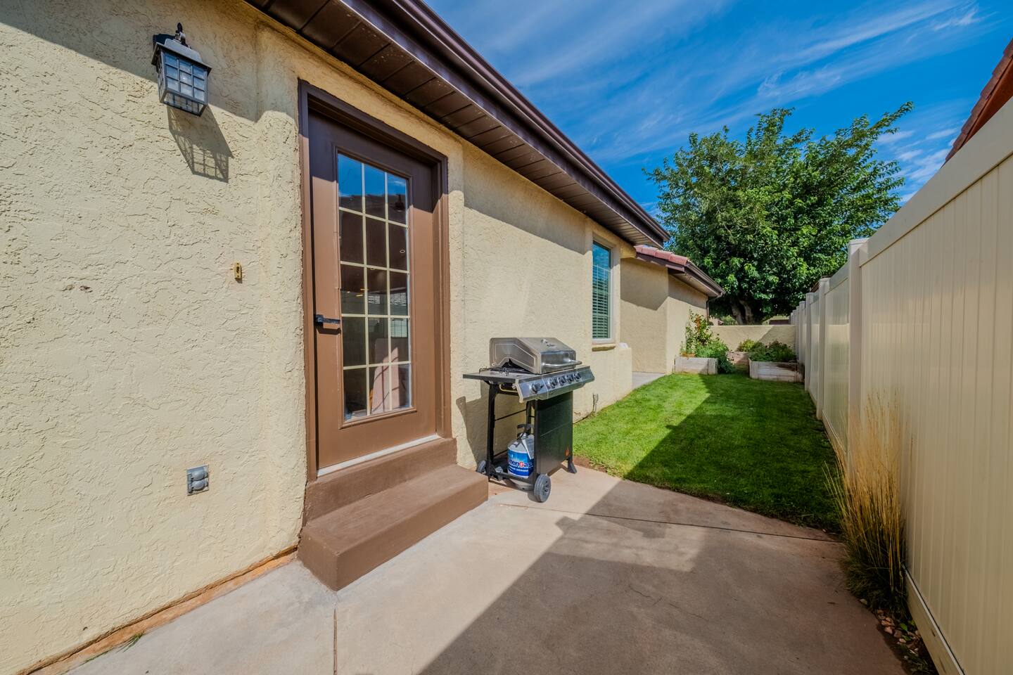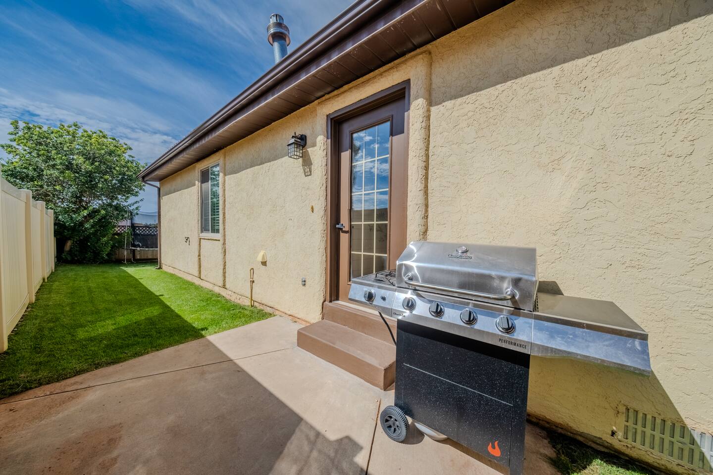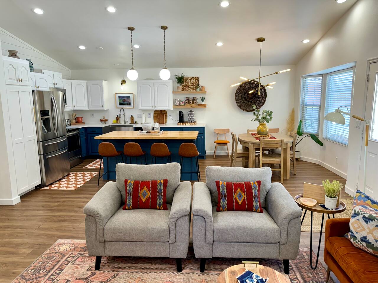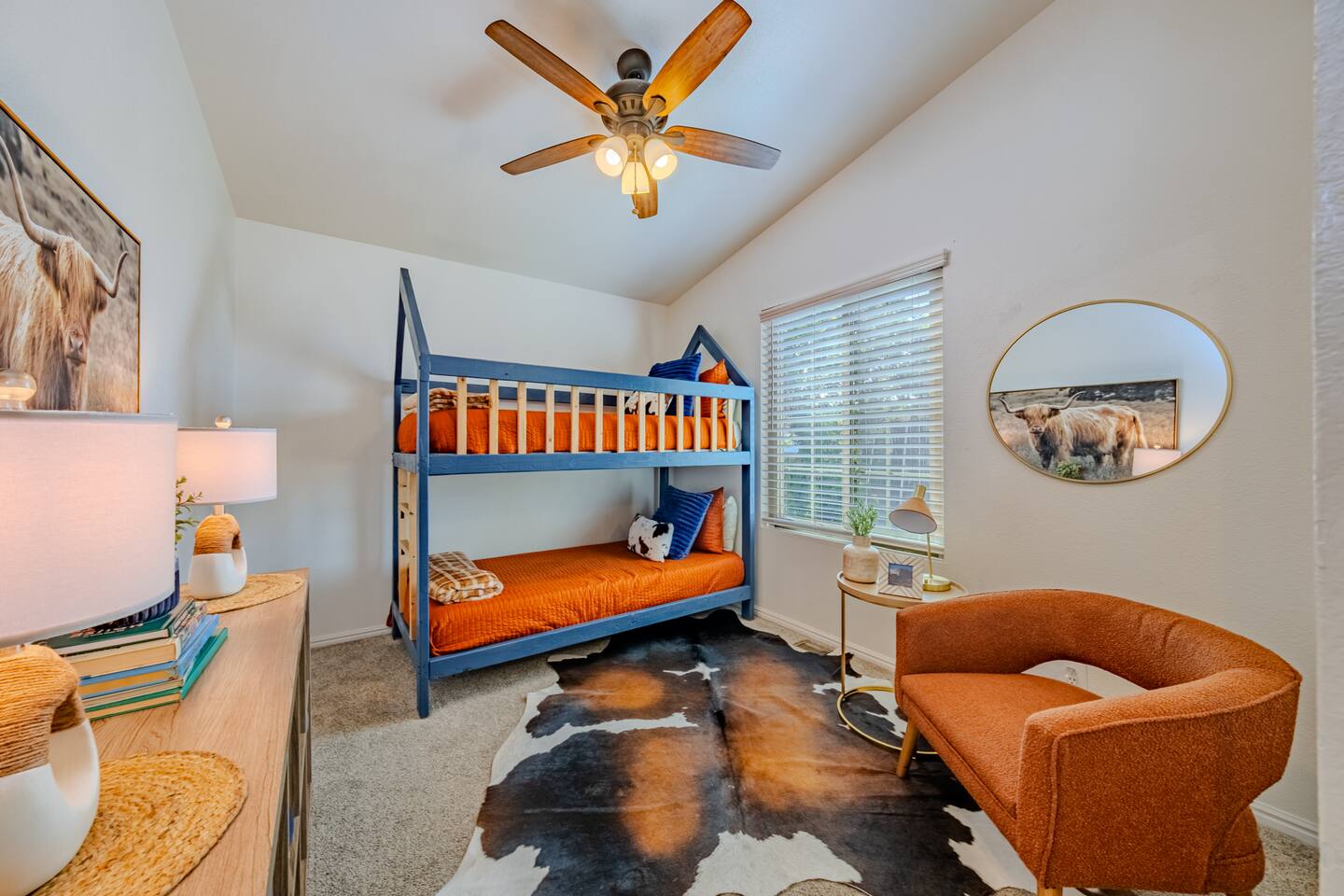 When you walk through the gate to the home, you are greeted with a charming patio and propane fire. As you step through the front door, you'll find a large combined dining, living, and kitchen area. The living area features a large HD TV, perfect for movie nights. The kitchen is fully stocked with all essentials, ensuring you have everything you need for a comfortable stay. The home features a stylish and rustic Southern charm theme. There's even a dedicated coffee area with everything you need to make your favorite brews. Down the hallway, you will find a laundry room that is fully stocked and ready for use. There's a full bathroom equipped with bath soaps for your convenience. Next, you'll discover the master bedroom with an ensuite bathroom. This cozy space is beautifully decorated, ensuring a comfortable and stylish retreat. Across the hall, you'll find the other two bedrooms. The first features unique and comfortable twin-over-twin bunk beds, a cozy seating area, and a lovely view of the backyard. The second bedroom offers a queen-size bed, closet doors that are full-size mirrors, and beautiful art that adds a touch of elegance to the room. The backyard is a serene space, perfect for relaxation and outdoor activities. It features a well-maintained lawn, a patio area with comfortable seating, and a barbecue grill for outdoor dining. The space is beautifully landscaped with a variety of plants and flowers, creating a peaceful and inviting atmosphere. There's also a garden with delicious tomatoes that guests are welcome to pick if they are ripe. For some fun, there's a trampoline with a safety net for added security. To top it all off, there's a private spa for ultimate relaxation. This charming and cozy property offers a perfect blend of rustic Southern charm and modern amenities. Nestled near Zion, Bryce Canyon, and many other incredible outdoor adventures that Kanab has to offer, it promises an unforgettable experience. You definitely don't want to miss out on this place!