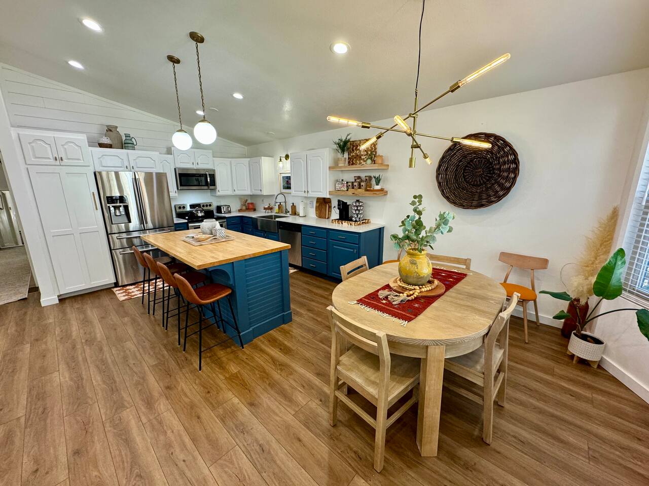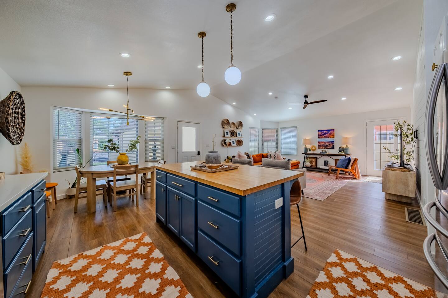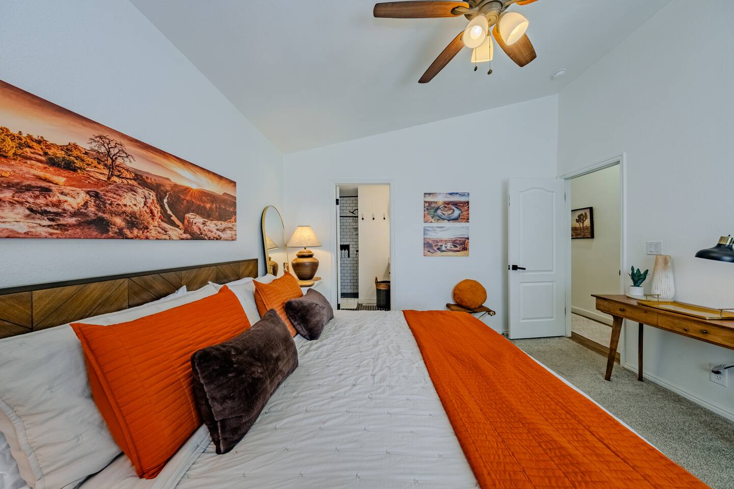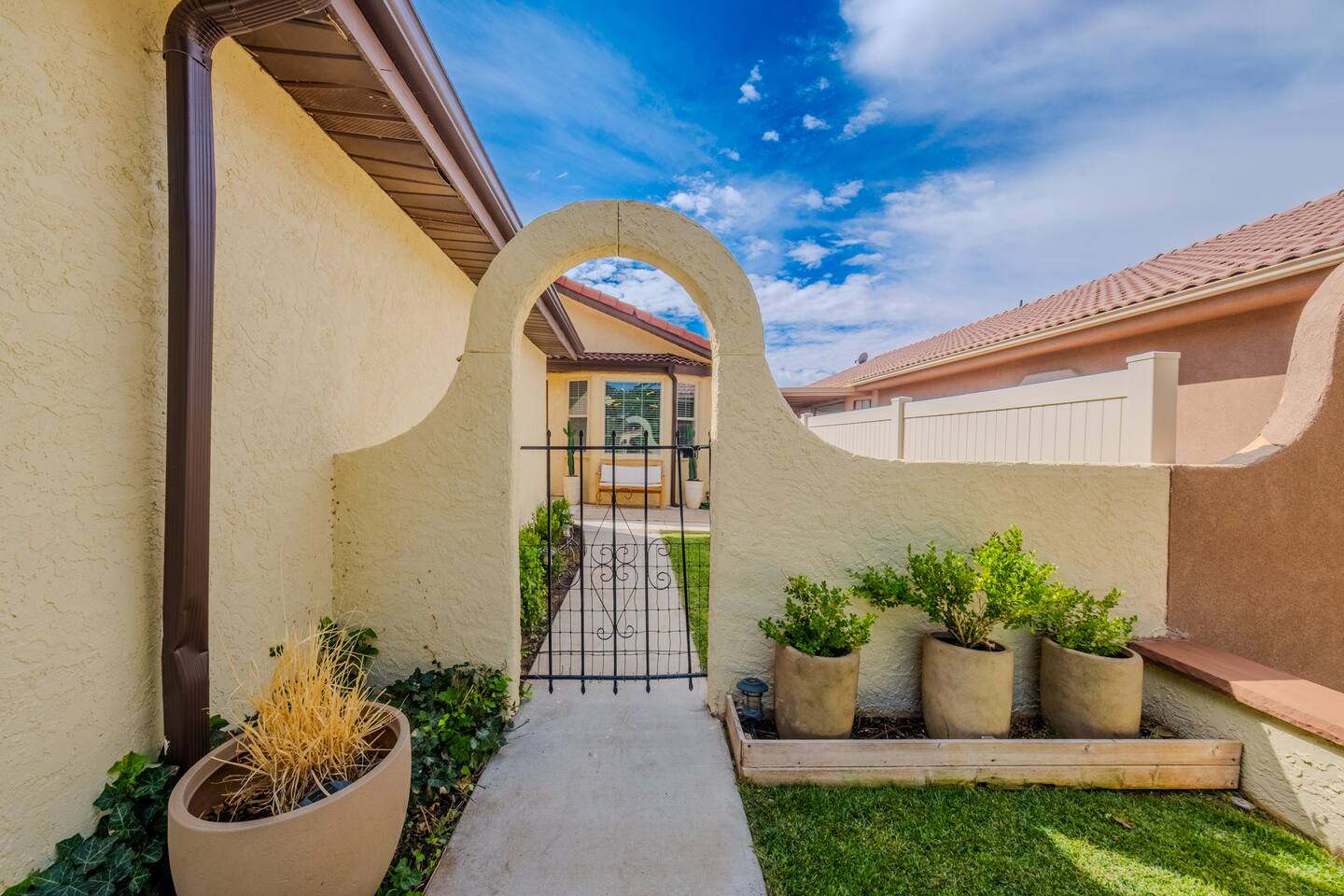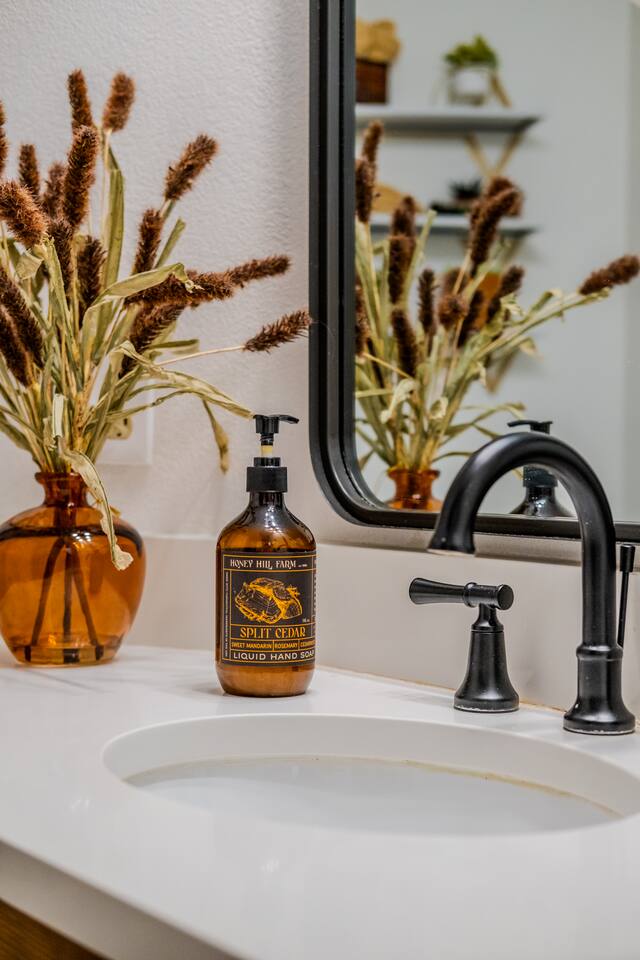 When you walk through the gate to the home, you are greeted with a charming patio and propane fire. As you step through the front door, you'll find a large combined dining, living, and kitchen area. The living area features a large HD TV, perfect for movie nights. The kitchen is fully stocked with all essentials, ensuring you have everything you need for a comfortable stay. The home features a stylish and rustic Southern charm theme. There's even a dedicated coffee area with everything you need to make your favorite brews. Down the hallway, you will find a laundry room that is fully stocked and ready for use. There's a full bathroom equipped with bath soaps for your convenience. Next, you'll discover the master bedroom with an ensuite bathroom. This cozy space is beautifully decorated, ensuring a comfortable and stylish retreat. Across the hall, you'll find the other two bedrooms. The first features unique and comfortable twin-over-twin bunk beds, a cozy seating area, and a lovely view of the backyard. The second bedroom offers a queen-size bed, closet doors that are full-size mirrors, and beautiful art that adds a touch of elegance to the room. The backyard is a serene space, perfect for relaxation and outdoor activities. It features a well-maintained lawn, a patio area with comfortable seating, and a barbecue grill for outdoor dining. The space is beautifully landscaped with a variety of plants and flowers, creating a peaceful and inviting atmosphere. There's also a garden with delicious tomatoes that guests are welcome to pick if they are ripe. For some fun, there's a trampoline with a safety net for added security. To top it all off, there's a private spa for ultimate relaxation. This charming and cozy property offers a perfect blend of rustic Southern charm and modern amenities. Nestled near Zion, Bryce Canyon, and many other incredible outdoor adventures that Kanab has to offer, it promises an unforgettable experience. You definitely don't want to miss out on this place!