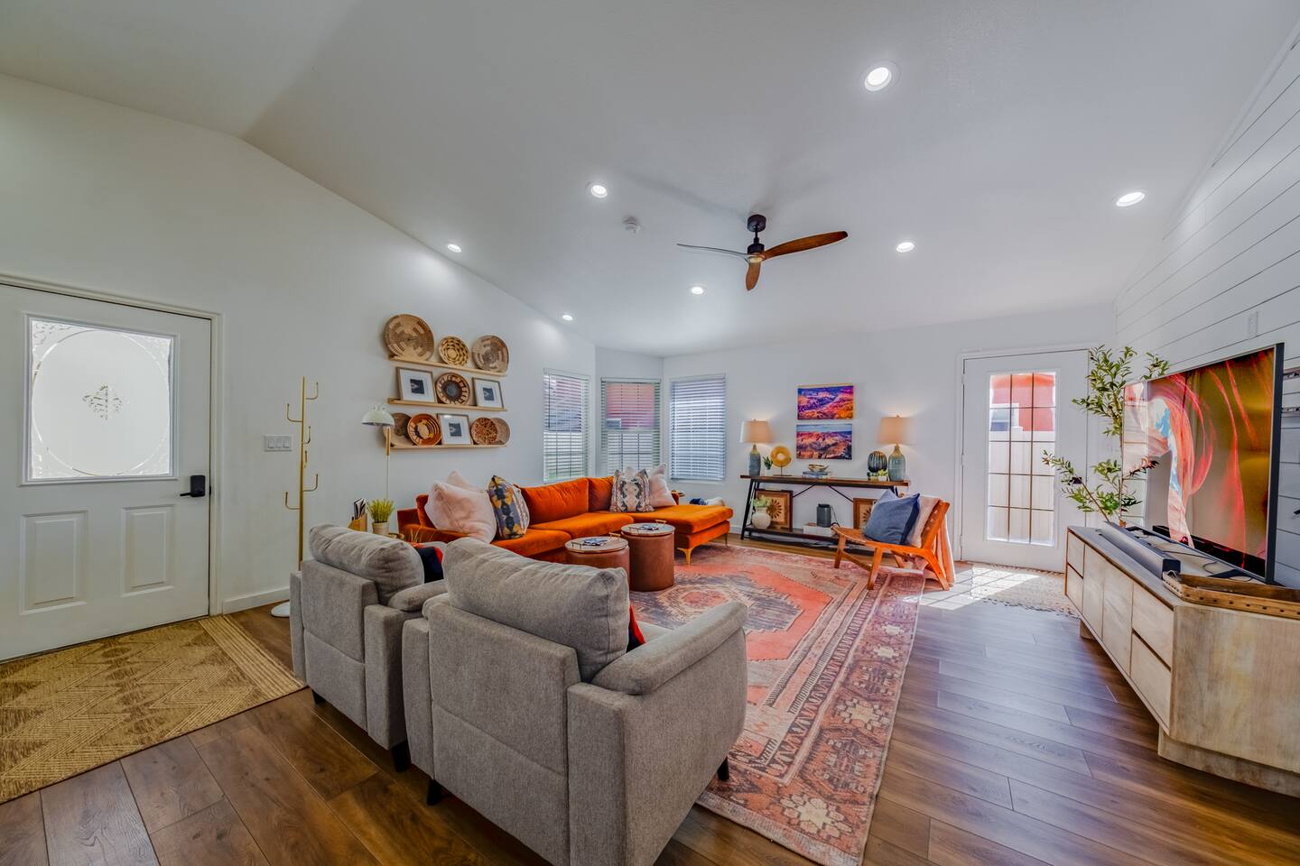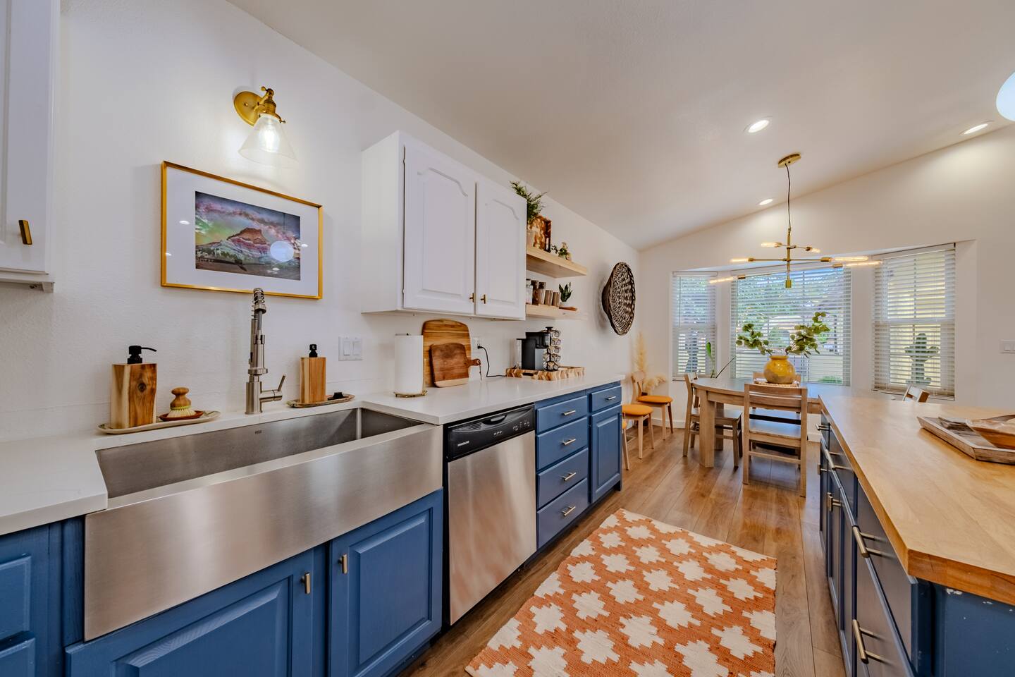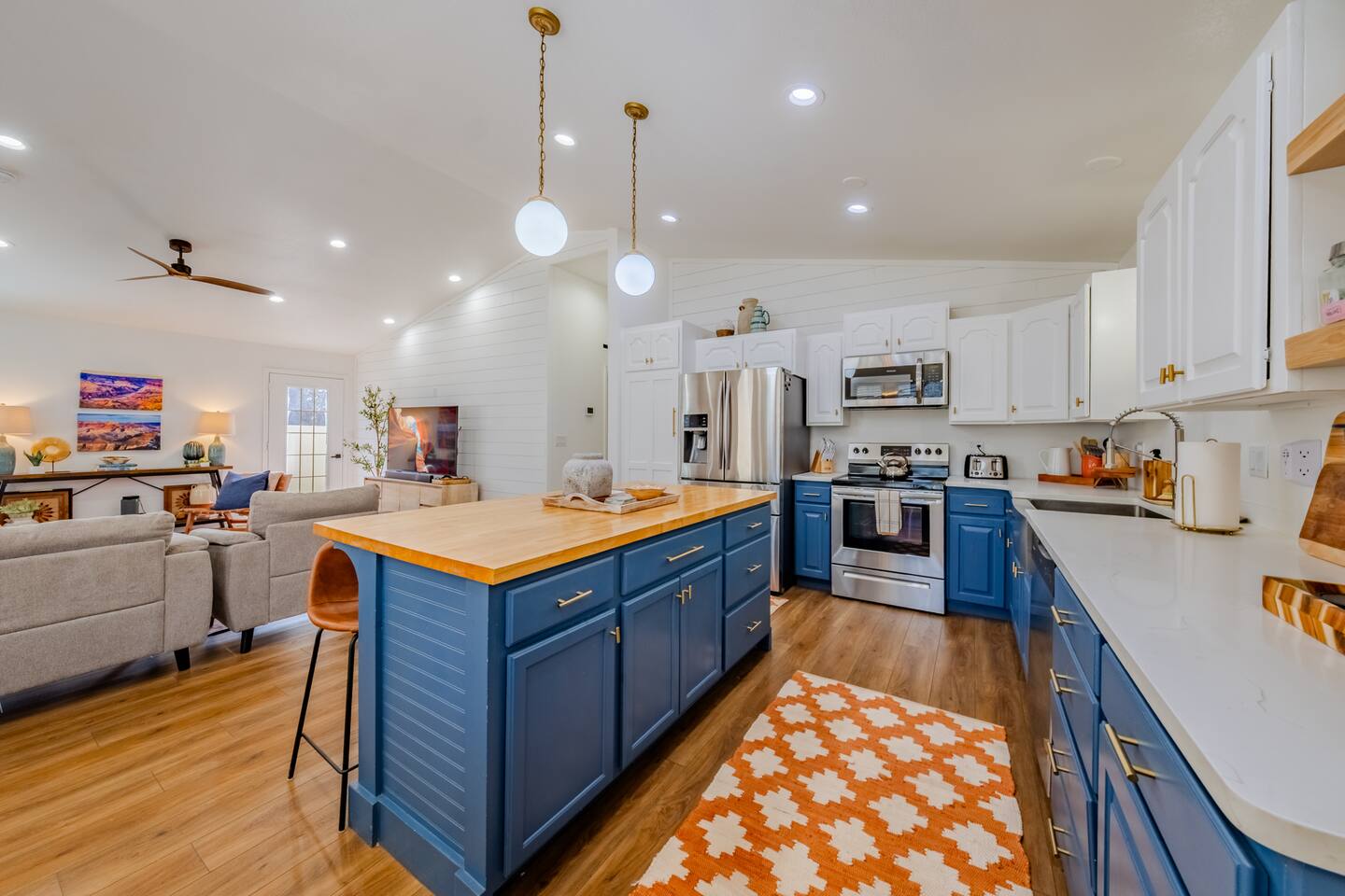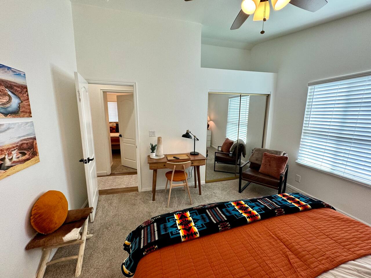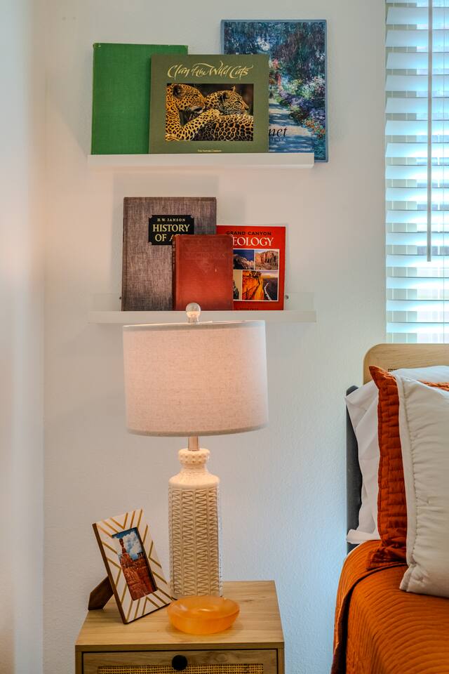 When you walk through the gate to the home, you are greeted with a charming patio and propane fire. As you step through the front door, you'll find a large combined dining, living, and kitchen area. The living area features a large HD TV, perfect for movie nights. The kitchen is fully stocked with all essentials, ensuring you have everything you need for a comfortable stay. The home features a stylish and rustic Southern charm theme. There's even a dedicated coffee area with everything you need to make your favorite brews. Down the hallway, you will find a laundry room that is fully stocked and ready for use. There's a full bathroom equipped with bath soaps for your convenience. Next, you'll discover the master bedroom with an ensuite bathroom. This cozy space is beautifully decorated, ensuring a comfortable and stylish retreat. Across the hall, you'll find the other two bedrooms. The first features unique and comfortable twin-over-twin bunk beds, a cozy seating area, and a lovely view of the backyard. The second bedroom offers a queen-size bed, closet doors that are full-size mirrors, and beautiful art that adds a touch of elegance to the room. The backyard is a serene space, perfect for relaxation and outdoor activities. It features a well-maintained lawn, a patio area with comfortable seating, and a barbecue grill for outdoor dining. The space is beautifully landscaped with a variety of plants and flowers, creating a peaceful and inviting atmosphere. There's also a garden with delicious tomatoes that guests are welcome to pick if they are ripe. For some fun, there's a trampoline with a safety net for added security. To top it all off, there's a private spa for ultimate relaxation. This charming and cozy property offers a perfect blend of rustic Southern charm and modern amenities. Nestled near Zion, Bryce Canyon, and many other incredible outdoor adventures that Kanab has to offer, it promises an unforgettable experience. You definitely don't want to miss out on this place!