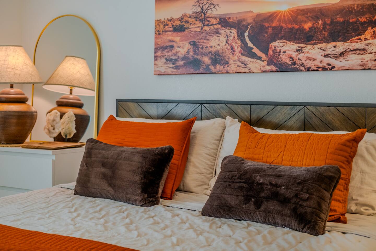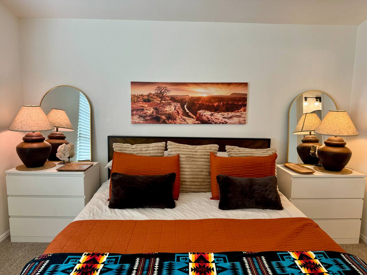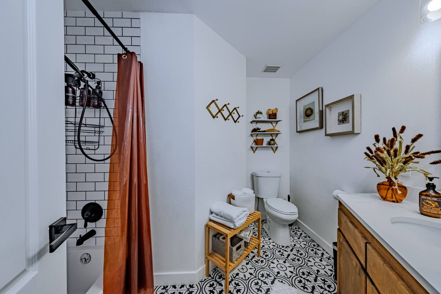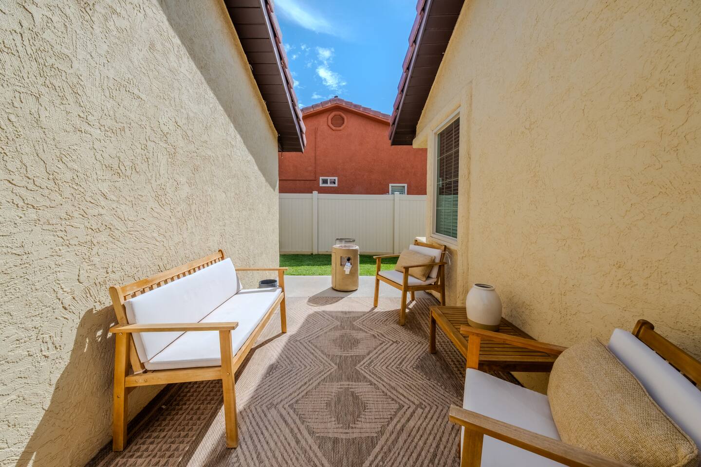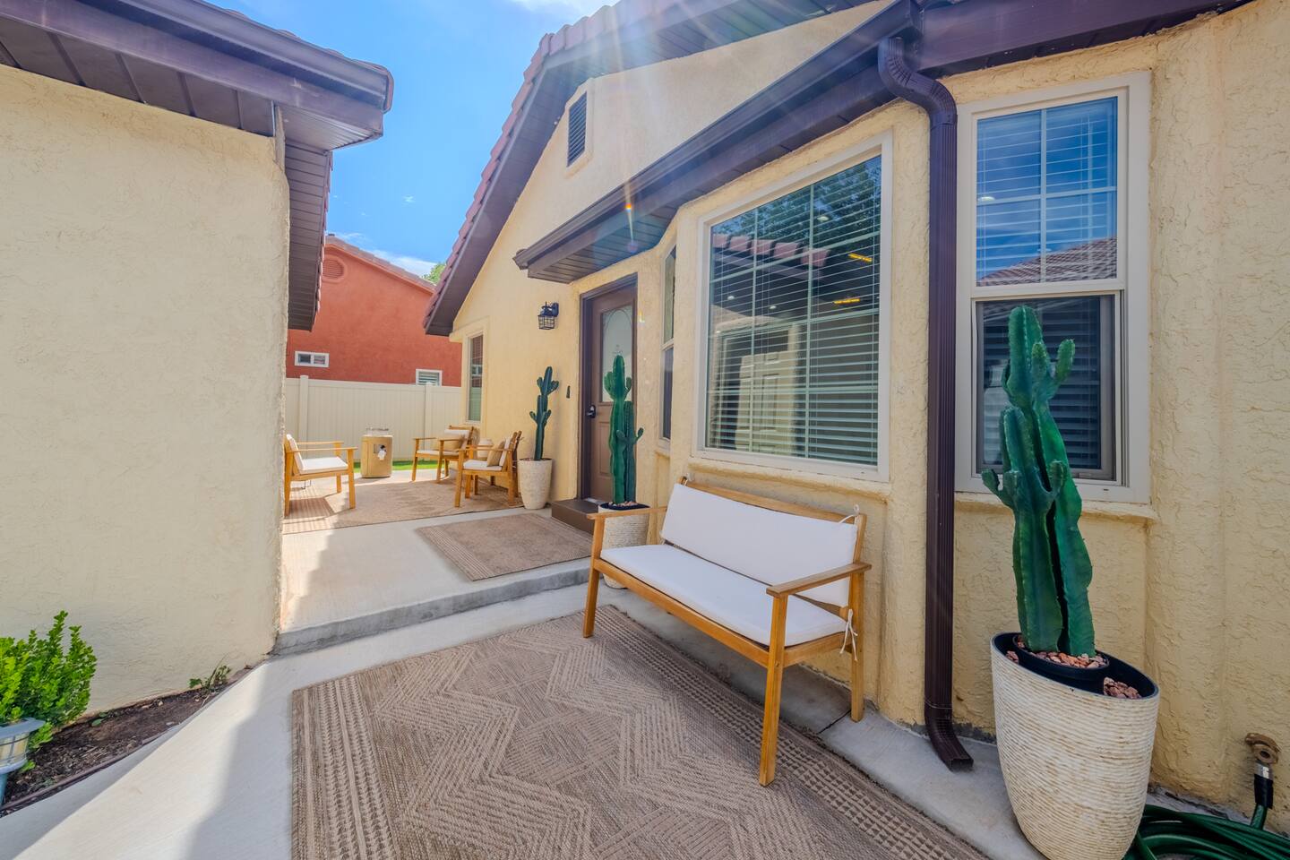 When you walk through the gate to the home, you are greeted with a charming patio and propane fire. As you step through the front door, you'll find a large combined dining, living, and kitchen area. The living area features a large HD TV, perfect for movie nights. The kitchen is fully stocked with all essentials, ensuring you have everything you need for a comfortable stay. The home features a stylish and rustic Southern charm theme. There's even a dedicated coffee area with everything you need to make your favorite brews. Down the hallway, you will find a laundry room that is fully stocked and ready for use. There's a full bathroom equipped with bath soaps for your convenience. Next, you'll discover the master bedroom with an ensuite bathroom. This cozy space is beautifully decorated, ensuring a comfortable and stylish retreat. Across the hall, you'll find the other two bedrooms. The first features unique and comfortable twin-over-twin bunk beds, a cozy seating area, and a lovely view of the backyard. The second bedroom offers a queen-size bed, closet doors that are full-size mirrors, and beautiful art that adds a touch of elegance to the room. The backyard is a serene space, perfect for relaxation and outdoor activities. It features a well-maintained lawn, a patio area with comfortable seating, and a barbecue grill for outdoor dining. The space is beautifully landscaped with a variety of plants and flowers, creating a peaceful and inviting atmosphere. There's also a garden with delicious tomatoes that guests are welcome to pick if they are ripe. For some fun, there's a trampoline with a safety net for added security. To top it all off, there's a private spa for ultimate relaxation. This charming and cozy property offers a perfect blend of rustic Southern charm and modern amenities. Nestled near Zion, Bryce Canyon, and many other incredible outdoor adventures that Kanab has to offer, it promises an unforgettable experience. You definitely don't want to miss out on this place!