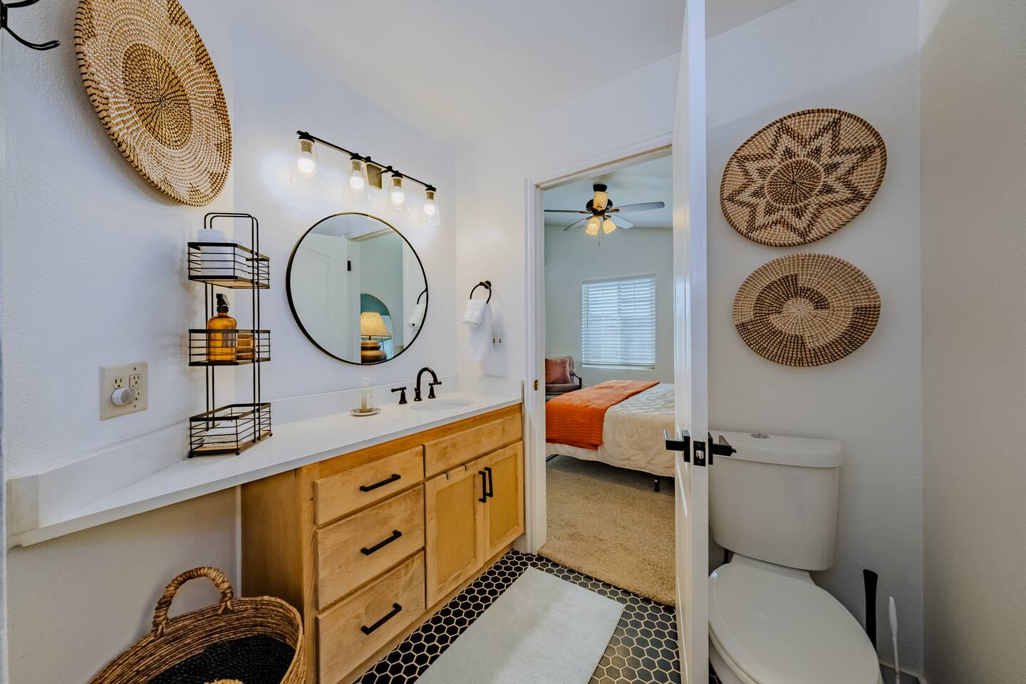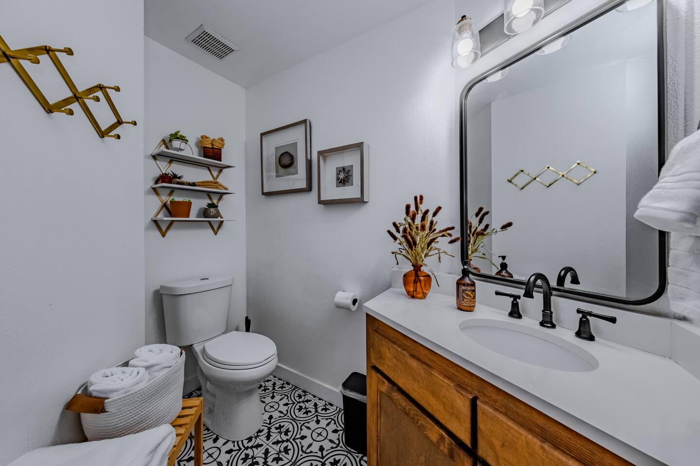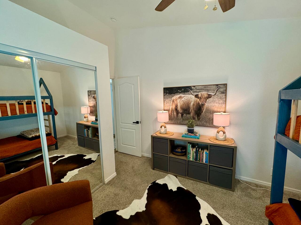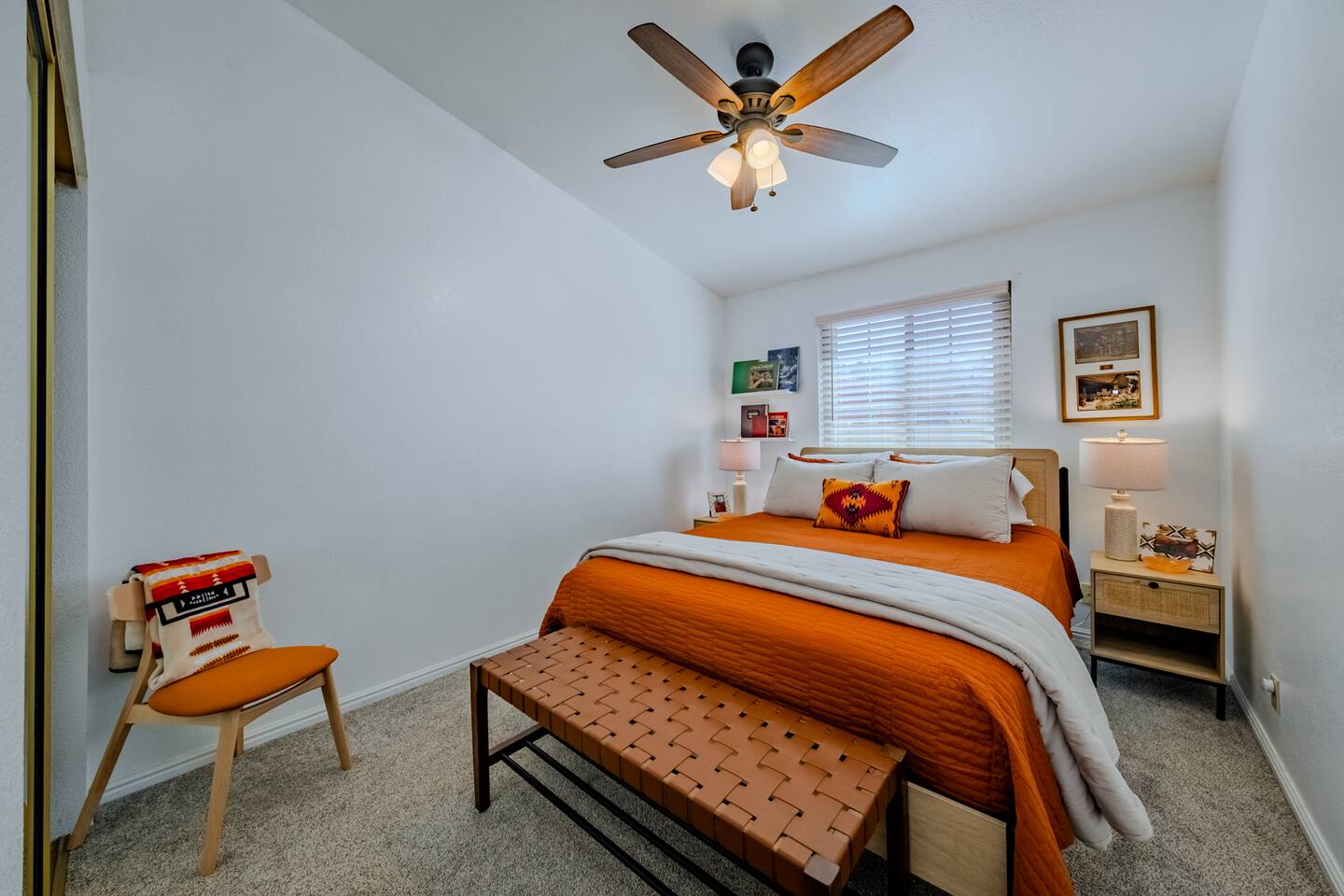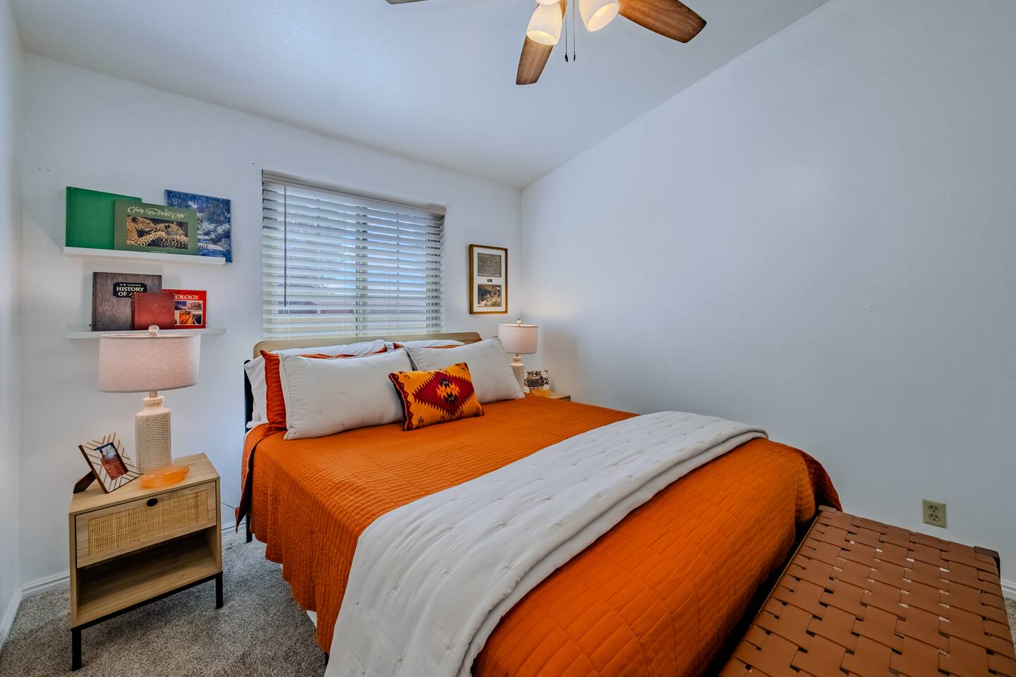 When you walk through the gate to the home, you are greeted with a charming patio and propane fire. As you step through the front door, you'll find a large combined dining, living, and kitchen area. The living area features a large HD TV, perfect for movie nights. The kitchen is fully stocked with all essentials, ensuring you have everything you need for a comfortable stay. The home features a stylish and rustic Southern charm theme. There's even a dedicated coffee area with everything you need to make your favorite brews. Down the hallway, you will find a laundry room that is fully stocked and ready for use. There's a full bathroom equipped with bath soaps for your convenience. Next, you'll discover the master bedroom with an ensuite bathroom. This cozy space is beautifully decorated, ensuring a comfortable and stylish retreat. Across the hall, you'll find the other two bedrooms. The first features unique and comfortable twin-over-twin bunk beds, a cozy seating area, and a lovely view of the backyard. The second bedroom offers a queen-size bed, closet doors that are full-size mirrors, and beautiful art that adds a touch of elegance to the room. The backyard is a serene space, perfect for relaxation and outdoor activities. It features a well-maintained lawn, a patio area with comfortable seating, and a barbecue grill for outdoor dining. The space is beautifully landscaped with a variety of plants and flowers, creating a peaceful and inviting atmosphere. There's also a garden with delicious tomatoes that guests are welcome to pick if they are ripe. For some fun, there's a trampoline with a safety net for added security. To top it all off, there's a private spa for ultimate relaxation. This charming and cozy property offers a perfect blend of rustic Southern charm and modern amenities. Nestled near Zion, Bryce Canyon, and many other incredible outdoor adventures that Kanab has to offer, it promises an unforgettable experience. You definitely don't want to miss out on this place!