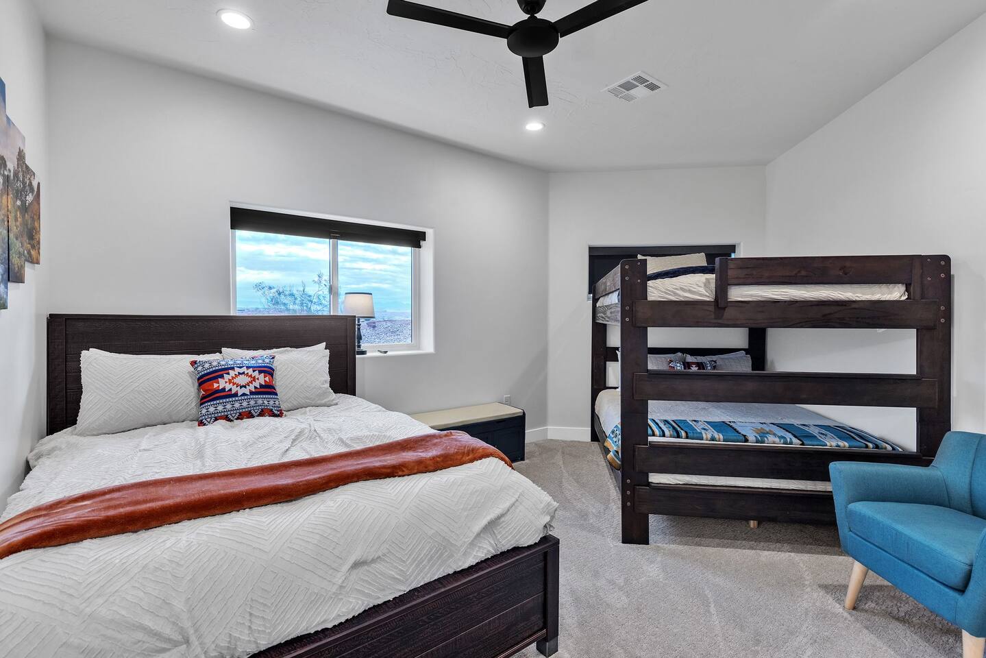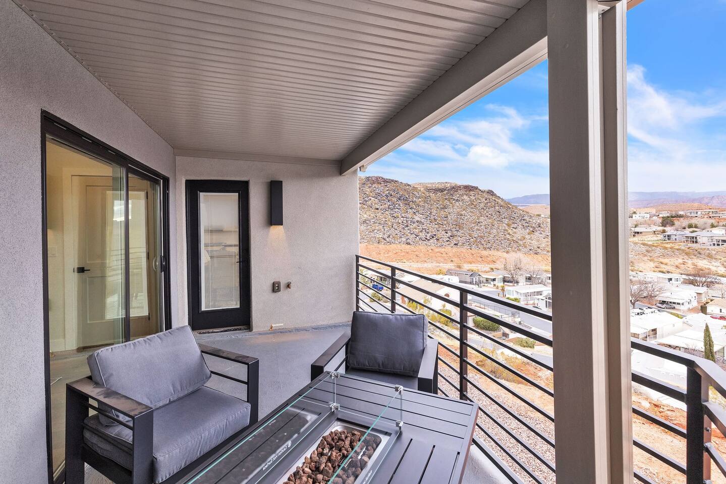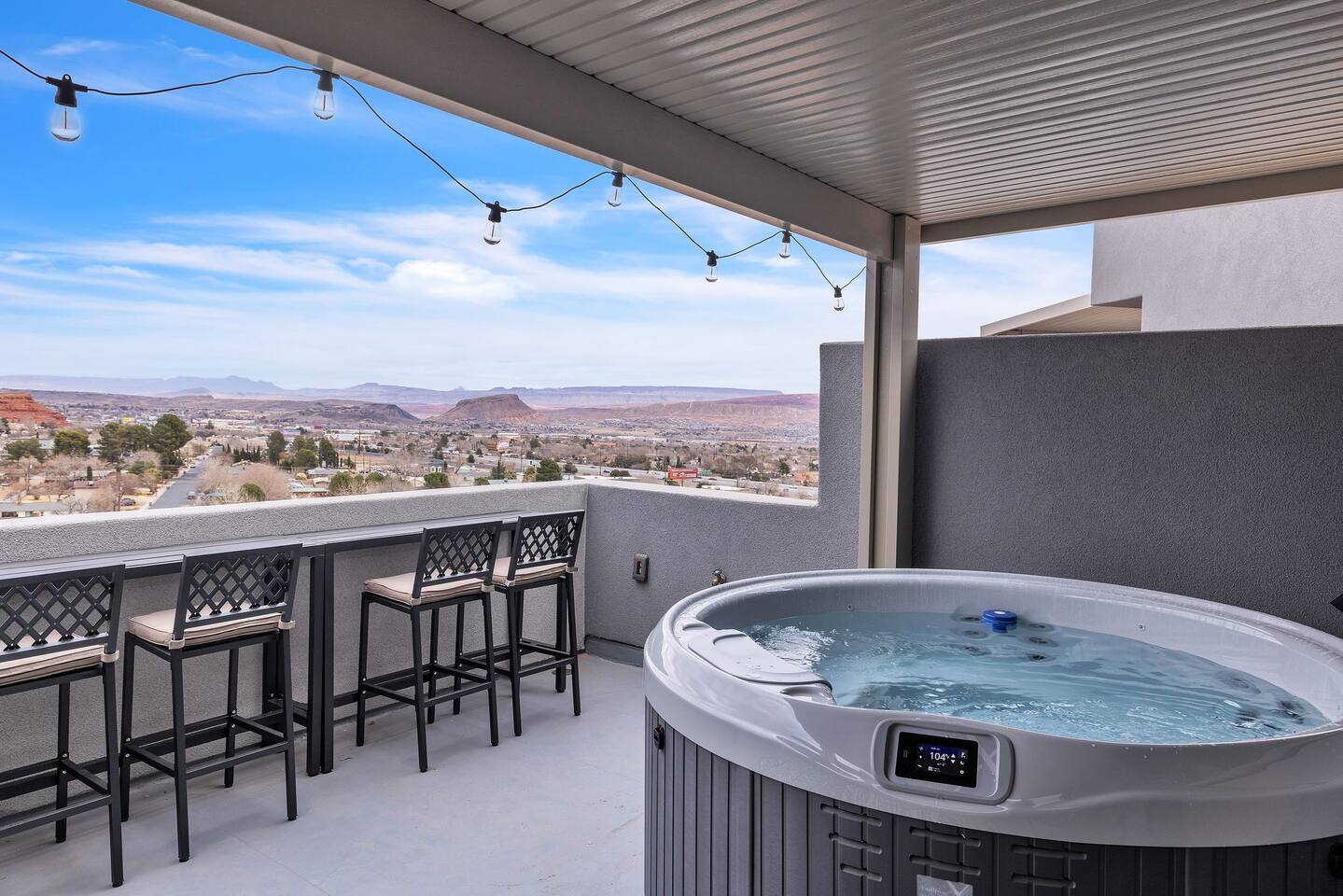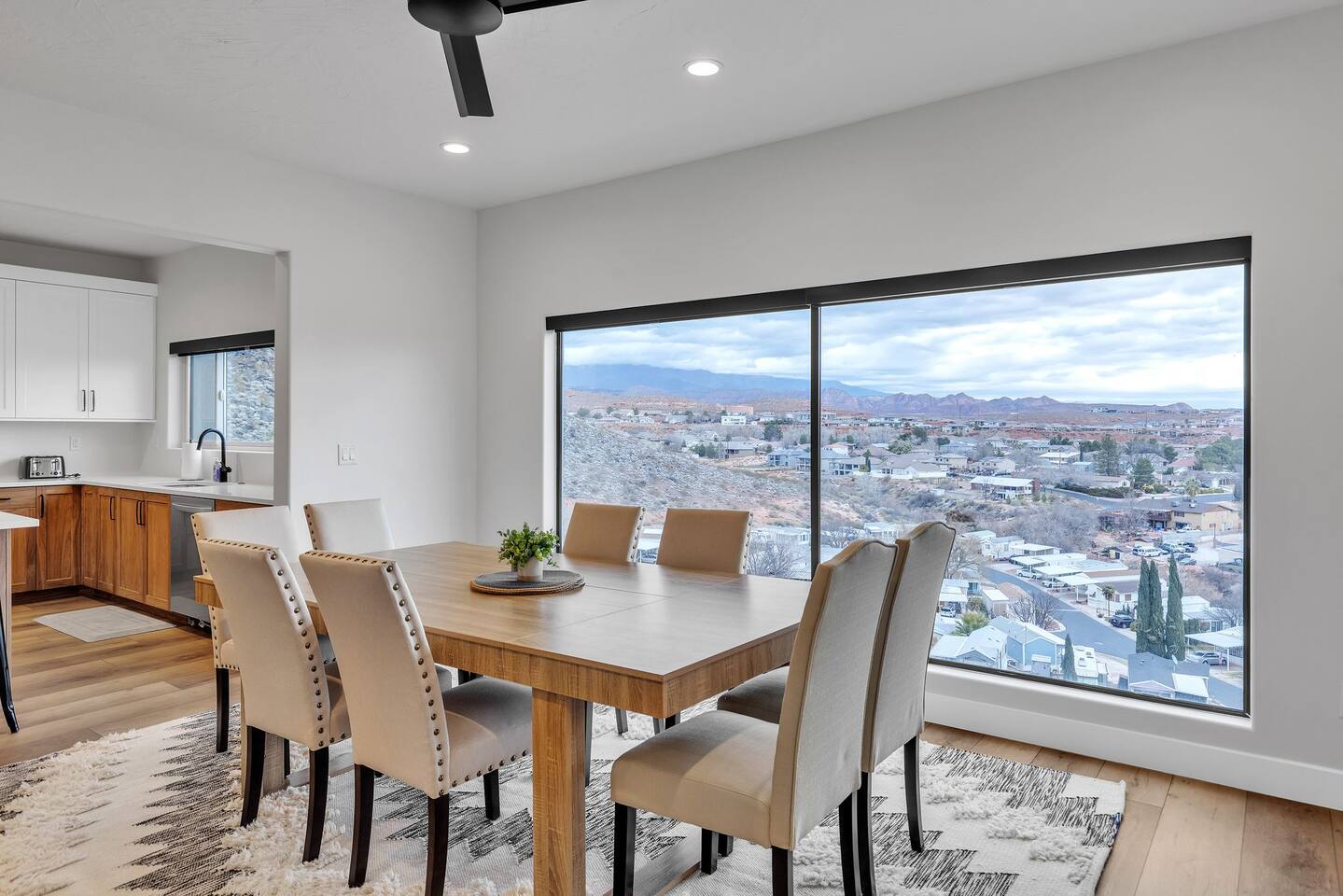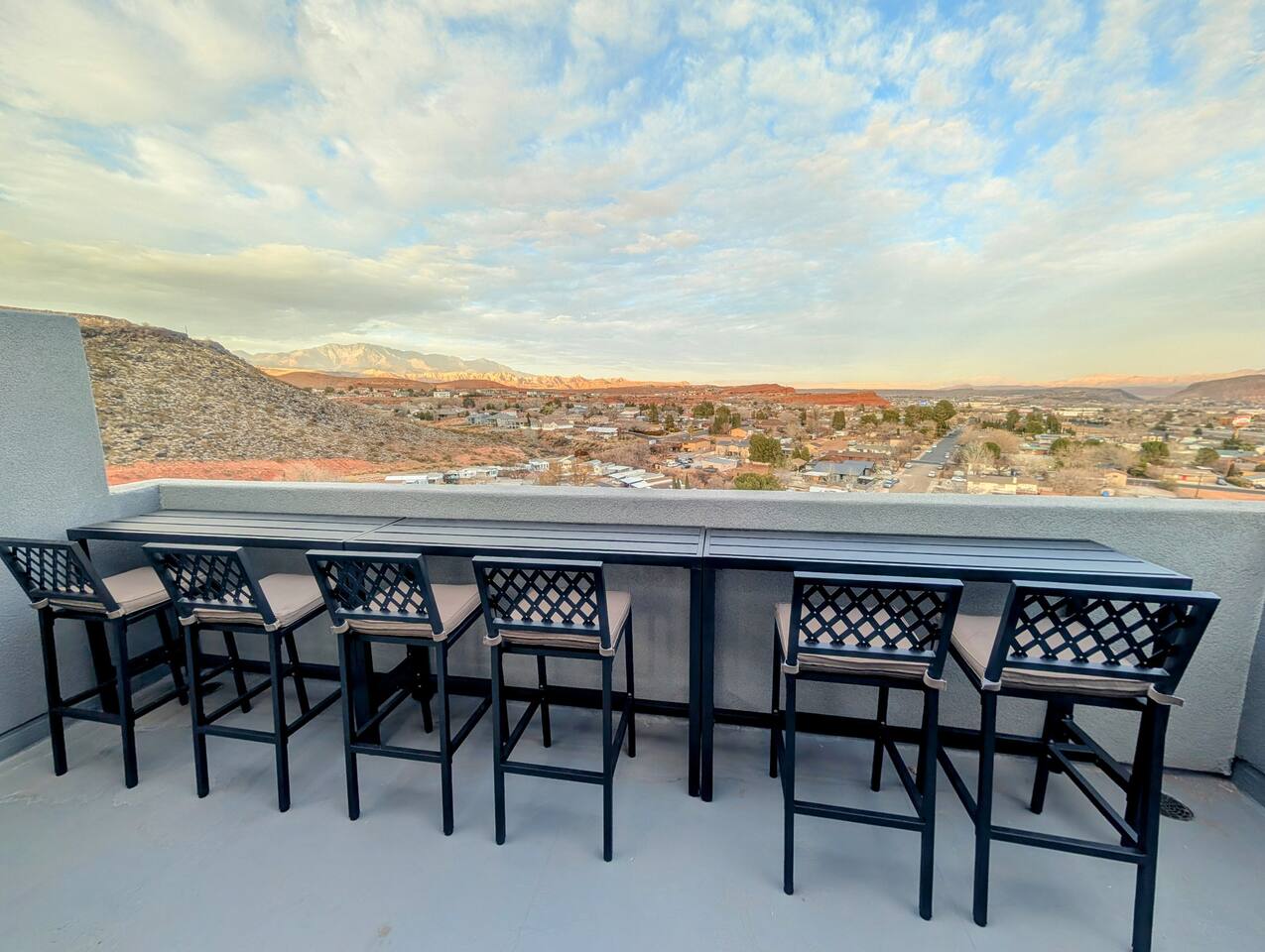 Step into the first floor, where a cozy seating area invites you to relax. You’ll find a fully stocked laundry room and the spacious bunk room with ensuite bathroom. This bunk room features three queen-size beds, a stunning photo of Zion National Park, and a large HD TV. Plus, the adult queen-over-queen bunk beds are rated for 400 lbs, making it perfect for everyone. Enjoy the beautiful view of the Pine Valley Mountains from this comfy space! Plus, there is an EV charger for those with electric vehicles. On the second floor, you’ll find a spacious combined kitchen and dining area that’s perfect for family gatherings. The kitchen is fully stocked with all the essentials, plus a blender, crockpot, and waffle iron! With seating for 8 at the dining table and 3 bar stools at the island counter, you can host everyone comfortably. The dining area features a stunning floor-to-ceiling window that offers an incredible view. Step out onto the balcony, where you can enjoy seating for 5 around a large fire table. Next, there’s the king-size master bedroom with an ensuite bathroom, and all bathrooms come stocked with bath soaps and plush towels. You’ll also find a third queen-size bedroom with its own ensuite bathroom, showcasing unique southwest art. As you head up to the third floor, you’ll pass a nice desk area with fast Wi-Fi for getting work done, along with a convenient half bathroom. The third floor features a large plush sectional and a big HD TV, perfect for movie nights. Step onto the rooftop patio to find a relaxing spa. Enjoy seating for 6 that overlooks the Pine Valley Mountains, Zion National Park in the distance, and the rest of St. George. The city lights and the stars are truly something special to see from this space. While you might hear the freeway in the distance, the stunning view definitely makes up for it. This charming townhome features a spacious dining area, fully stocked kitchen, and a large plush sectional perfect for relaxing. The rooftop patio is a highlight, boasting a hot tub with epic views of the Pine Valley Mountains, Zion National Park, and the city lights of St. George. The space comfortably sleeps up to 10 guests, ensuring it is ideal for families or groups. Enjoy movie nights on the big HD TV or unwind in the rooftop spa, making this townhome a perfect getaway. Book your stay today!