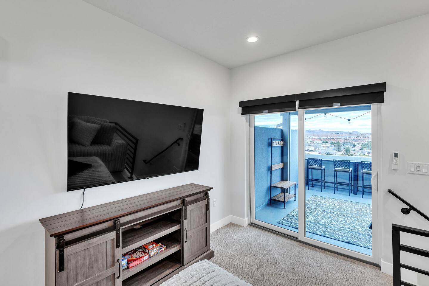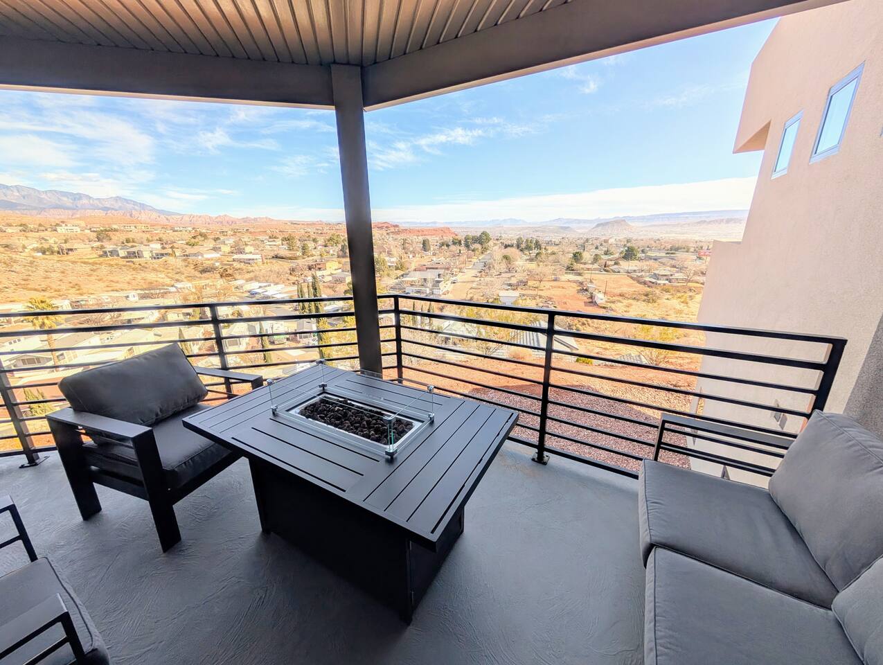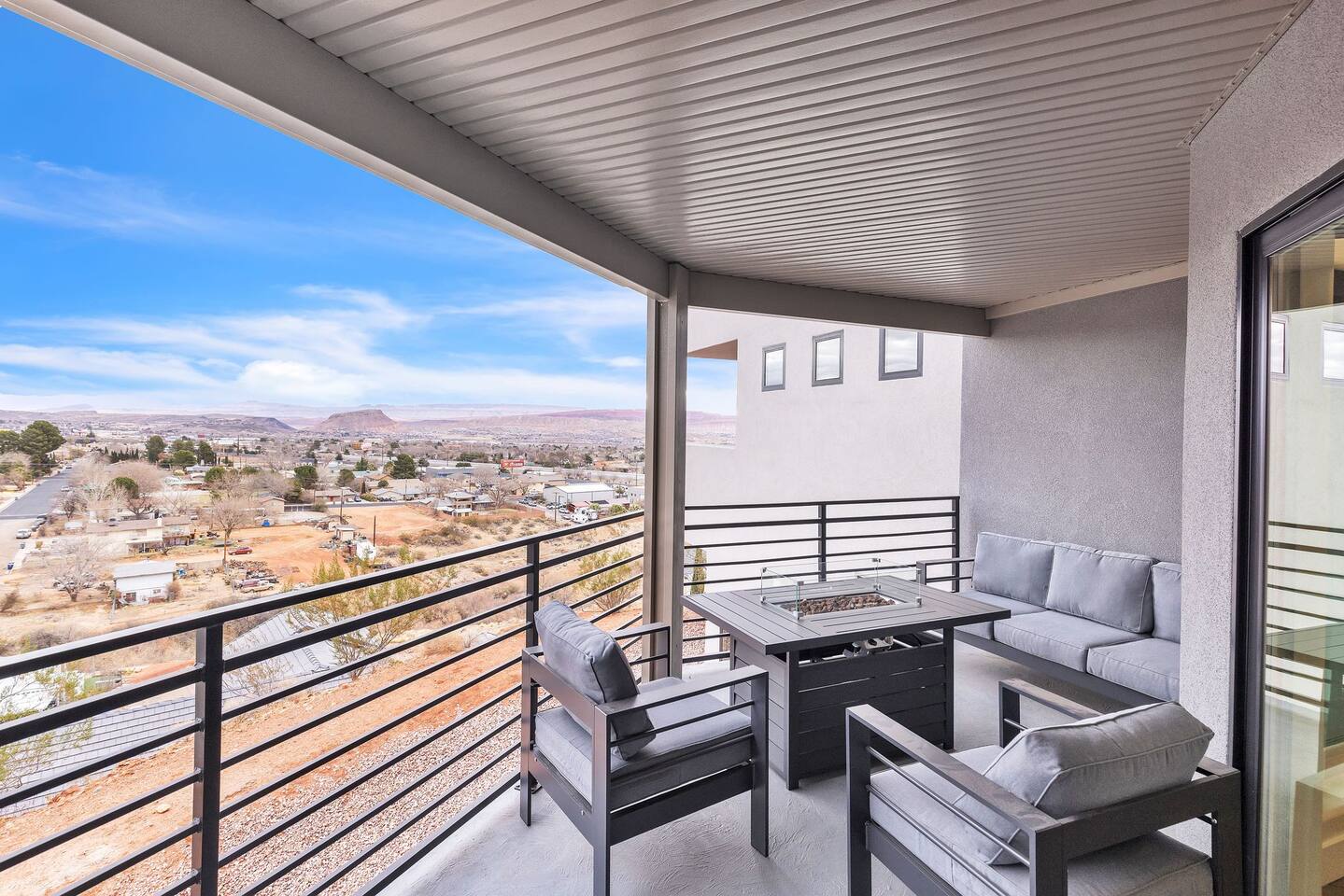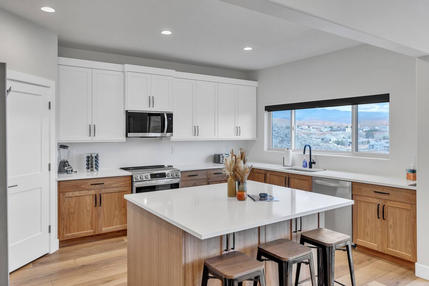 Step into the first floor, where a cozy seating area invites you to relax. You’ll find a fully stocked laundry room and the spacious bunk room with ensuite bathroom. This bunk room features three queen-size beds, a stunning photo of Zion National Park, and a large HD TV. Plus, the adult queen-over-queen bunk beds are rated for 400 lbs, making it perfect for everyone. Enjoy the beautiful view of the Pine Valley Mountains from this comfy space! Plus, there is an EV charger for those with electric vehicles. On the second floor, you’ll find a spacious combined kitchen and dining area that’s perfect for family gatherings. The kitchen is fully stocked with all the essentials, plus a blender, crockpot, and waffle iron! With seating for 8 at the dining table and 3 bar stools at the island counter, you can host everyone comfortably. The dining area features a stunning floor-to-ceiling window that offers an incredible view. Step out onto the balcony, where you can enjoy seating for 5 around a large fire table. Next, there’s the king-size master bedroom with an ensuite bathroom, and all bathrooms come stocked with bath soaps and plush towels. You’ll also find a third queen-size bedroom with its own ensuite bathroom, showcasing unique southwest art. As you head up to the third floor, you’ll pass a nice desk area with fast Wi-Fi for getting work done, along with a convenient half bathroom. The third floor features a large plush sectional and a big HD TV, perfect for movie nights. Step onto the rooftop patio to find a relaxing spa. Enjoy seating for 6 that overlooks the Pine Valley Mountains, Zion National Park in the distance, and the rest of St. George. The city lights and the stars are truly something special to see from this space. While you might hear the freeway in the distance, the stunning view definitely makes up for it. This charming townhome features a spacious dining area, fully stocked kitchen, and a large plush sectional perfect for relaxing. The rooftop patio is a highlight, boasting a hot tub with epic views of the Pine Valley Mountains, Zion National Park, and the city lights of St. George. The space comfortably sleeps up to 10 guests, ensuring it is ideal for families or groups. Enjoy movie nights on the big HD TV or unwind in the rooftop spa, making this townhome a perfect getaway. Book your stay today!