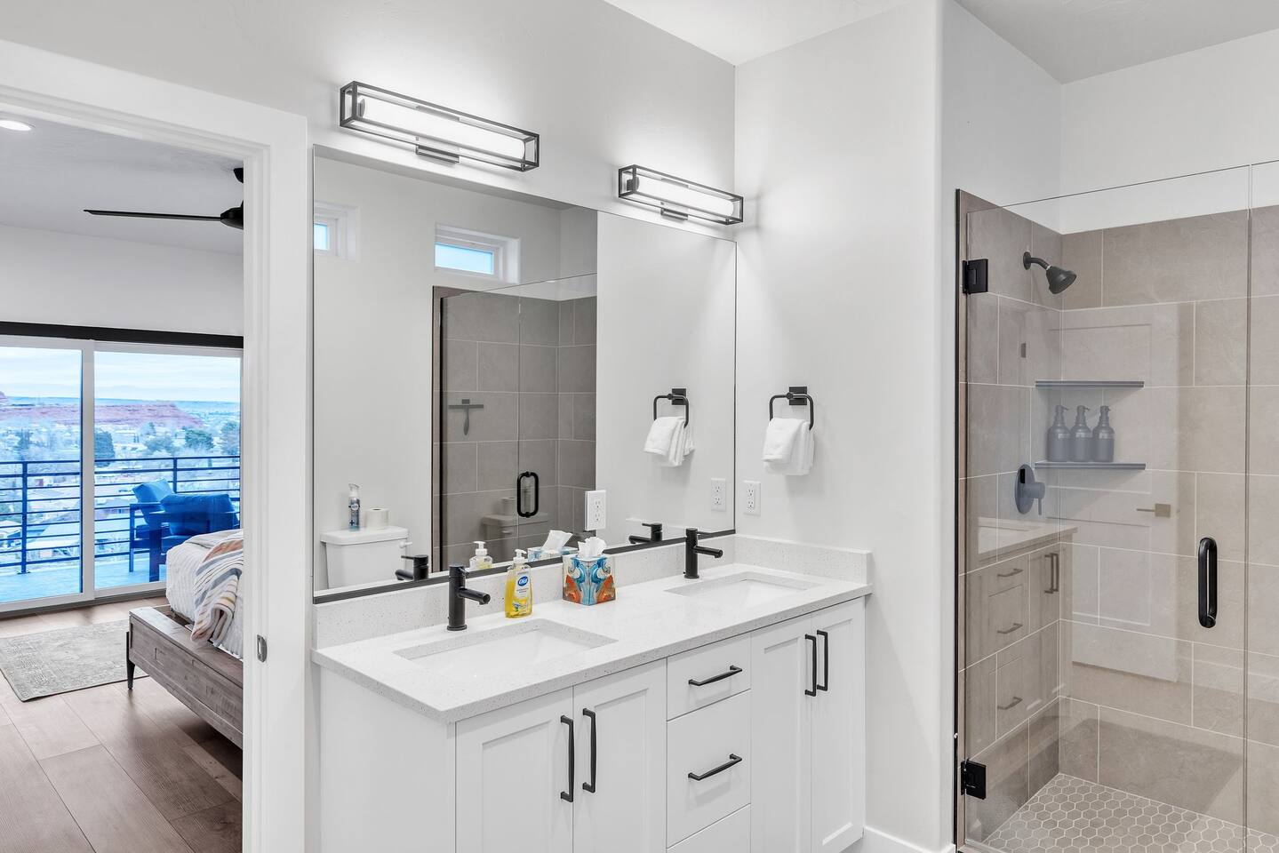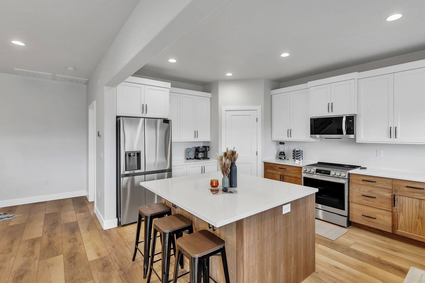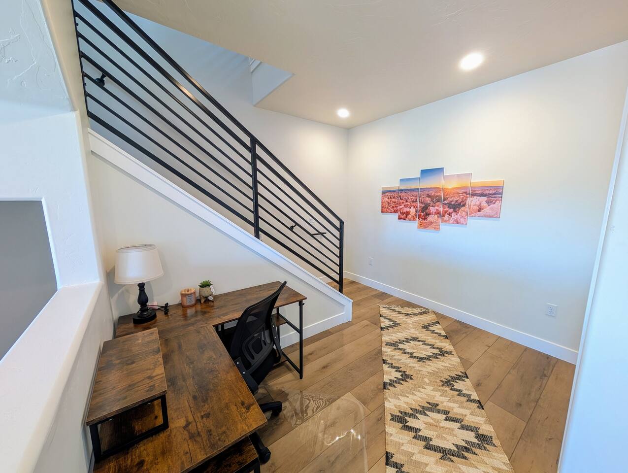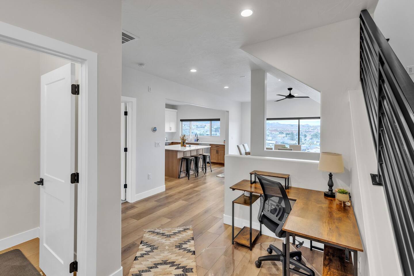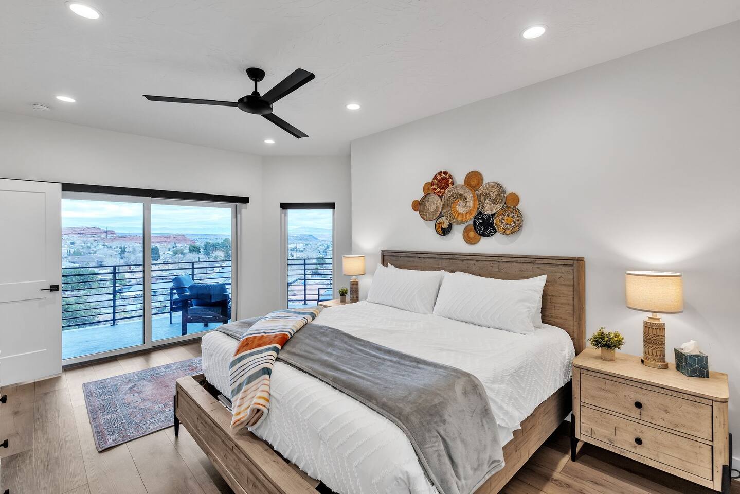 Step into the first floor, where a cozy seating area invites you to relax. You’ll find a fully stocked laundry room and the spacious bunk room with ensuite bathroom. This bunk room features three queen-size beds, a stunning photo of Zion National Park, and a large HD TV. Plus, the adult queen-over-queen bunk beds are rated for 400 lbs, making it perfect for everyone. Enjoy the beautiful view of the Pine Valley Mountains from this comfy space! Plus, there is an EV charger for those with electric vehicles. On the second floor, you’ll find a spacious combined kitchen and dining area that’s perfect for family gatherings. The kitchen is fully stocked with all the essentials, plus a blender, crockpot, and waffle iron! With seating for 8 at the dining table and 3 bar stools at the island counter, you can host everyone comfortably. The dining area features a stunning floor-to-ceiling window that offers an incredible view. Step out onto the balcony, where you can enjoy seating for 5 around a large fire table. Next, there’s the king-size master bedroom with an ensuite bathroom, and all bathrooms come stocked with bath soaps and plush towels. You’ll also find a third queen-size bedroom with its own ensuite bathroom, showcasing unique southwest art. As you head up to the third floor, you’ll pass a nice desk area with fast Wi-Fi for getting work done, along with a convenient half bathroom. The third floor features a large plush sectional and a big HD TV, perfect for movie nights. Step onto the rooftop patio to find a relaxing spa. Enjoy seating for 6 that overlooks the Pine Valley Mountains, Zion National Park in the distance, and the rest of St. George. The city lights and the stars are truly something special to see from this space. While you might hear the freeway in the distance, the stunning view definitely makes up for it. This charming townhome features a spacious dining area, fully stocked kitchen, and a large plush sectional perfect for relaxing. The rooftop patio is a highlight, boasting a hot tub with epic views of the Pine Valley Mountains, Zion National Park, and the city lights of St. George. The space comfortably sleeps up to 10 guests, ensuring it is ideal for families or groups. Enjoy movie nights on the big HD TV or unwind in the rooftop spa, making this townhome a perfect getaway. Book your stay today!