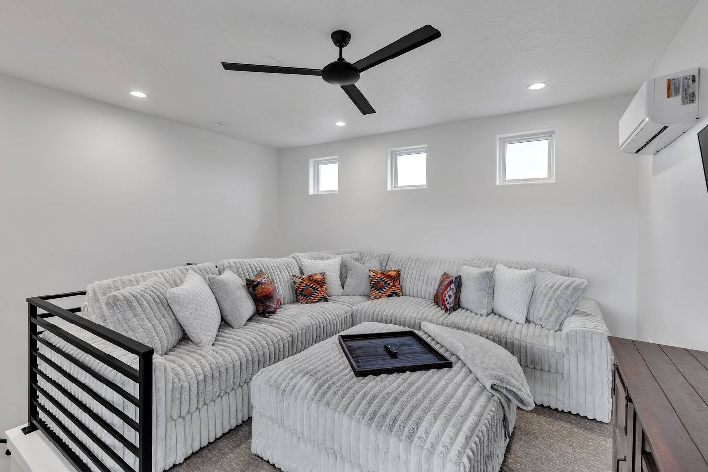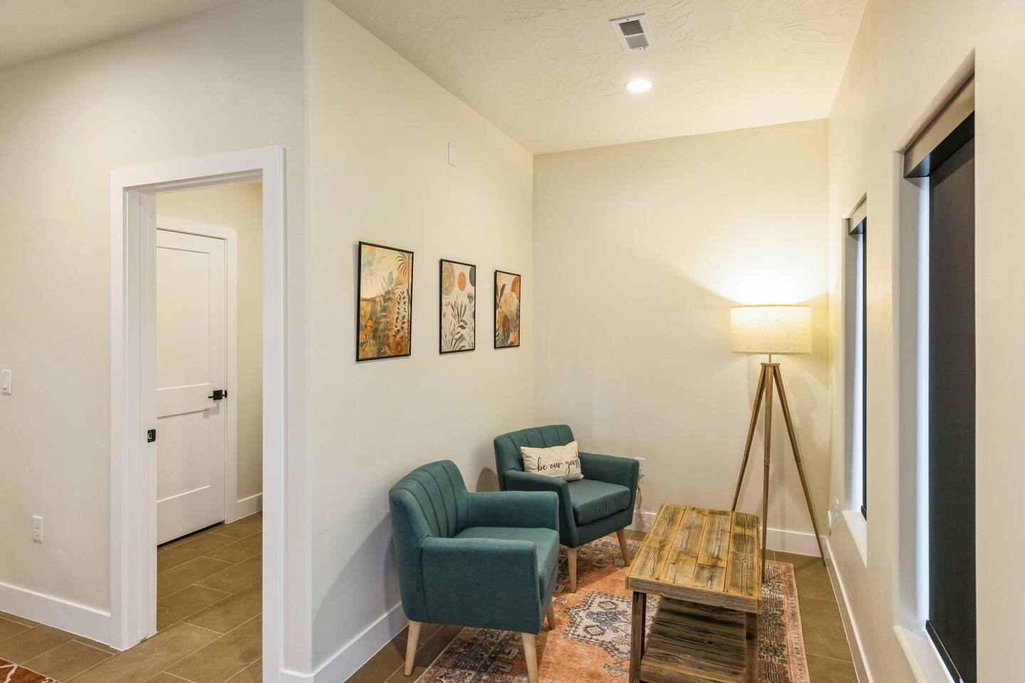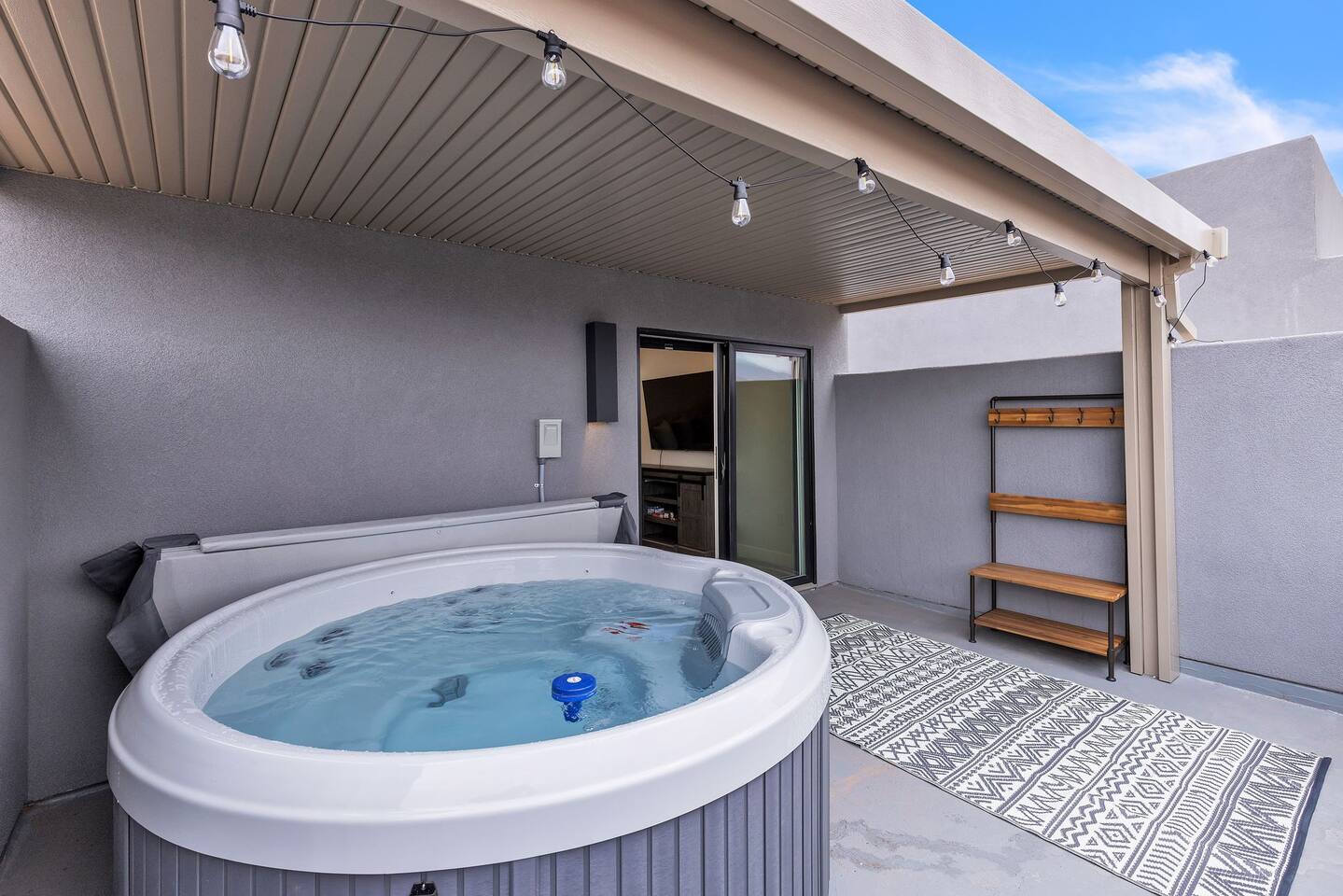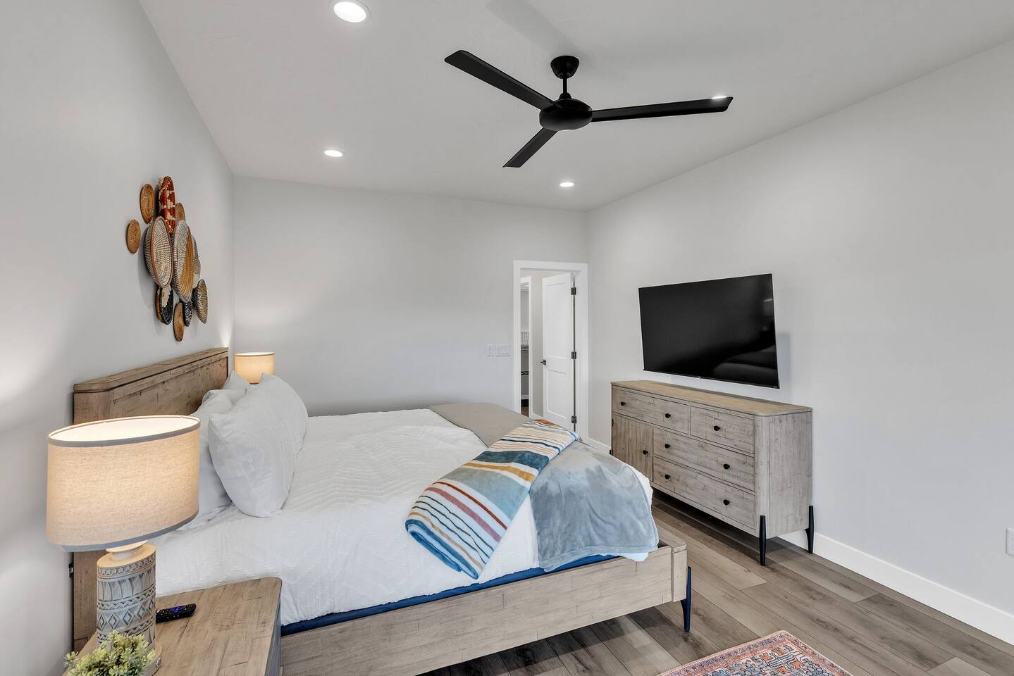 Step into the first floor, where a cozy seating area invites you to relax. You’ll find a fully stocked laundry room and the spacious bunk room with ensuite bathroom. This bunk room features three queen-size beds, a stunning photo of Zion National Park, and a large HD TV. Plus, the adult queen-over-queen bunk beds are rated for 400 lbs, making it perfect for everyone. Enjoy the beautiful view of the Pine Valley Mountains from this comfy space! Plus, there is an EV charger for those with electric vehicles. On the second floor, you’ll find a spacious combined kitchen and dining area that’s perfect for family gatherings. The kitchen is fully stocked with all the essentials, plus a blender, crockpot, and waffle iron! With seating for 8 at the dining table and 3 bar stools at the island counter, you can host everyone comfortably. The dining area features a stunning floor-to-ceiling window that offers an incredible view. Step out onto the balcony, where you can enjoy seating for 5 around a large fire table. Next, there’s the king-size master bedroom with an ensuite bathroom, and all bathrooms come stocked with bath soaps and plush towels. You’ll also find a third queen-size bedroom with its own ensuite bathroom, showcasing unique southwest art. As you head up to the third floor, you’ll pass a nice desk area with fast Wi-Fi for getting work done, along with a convenient half bathroom. The third floor features a large plush sectional and a big HD TV, perfect for movie nights. Step onto the rooftop patio to find a relaxing spa. Enjoy seating for 6 that overlooks the Pine Valley Mountains, Zion National Park in the distance, and the rest of St. George. The city lights and the stars are truly something special to see from this space. While you might hear the freeway in the distance, the stunning view definitely makes up for it. This charming townhome features a spacious dining area, fully stocked kitchen, and a large plush sectional perfect for relaxing. The rooftop patio is a highlight, boasting a hot tub with epic views of the Pine Valley Mountains, Zion National Park, and the city lights of St. George. The space comfortably sleeps up to 10 guests, ensuring it is ideal for families or groups. Enjoy movie nights on the big HD TV or unwind in the rooftop spa, making this townhome a perfect getaway. Book your stay today!