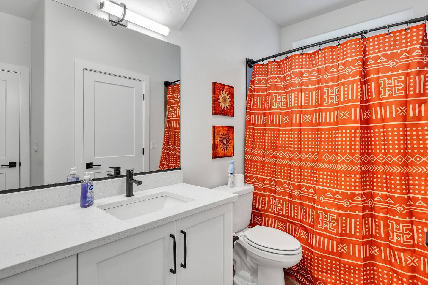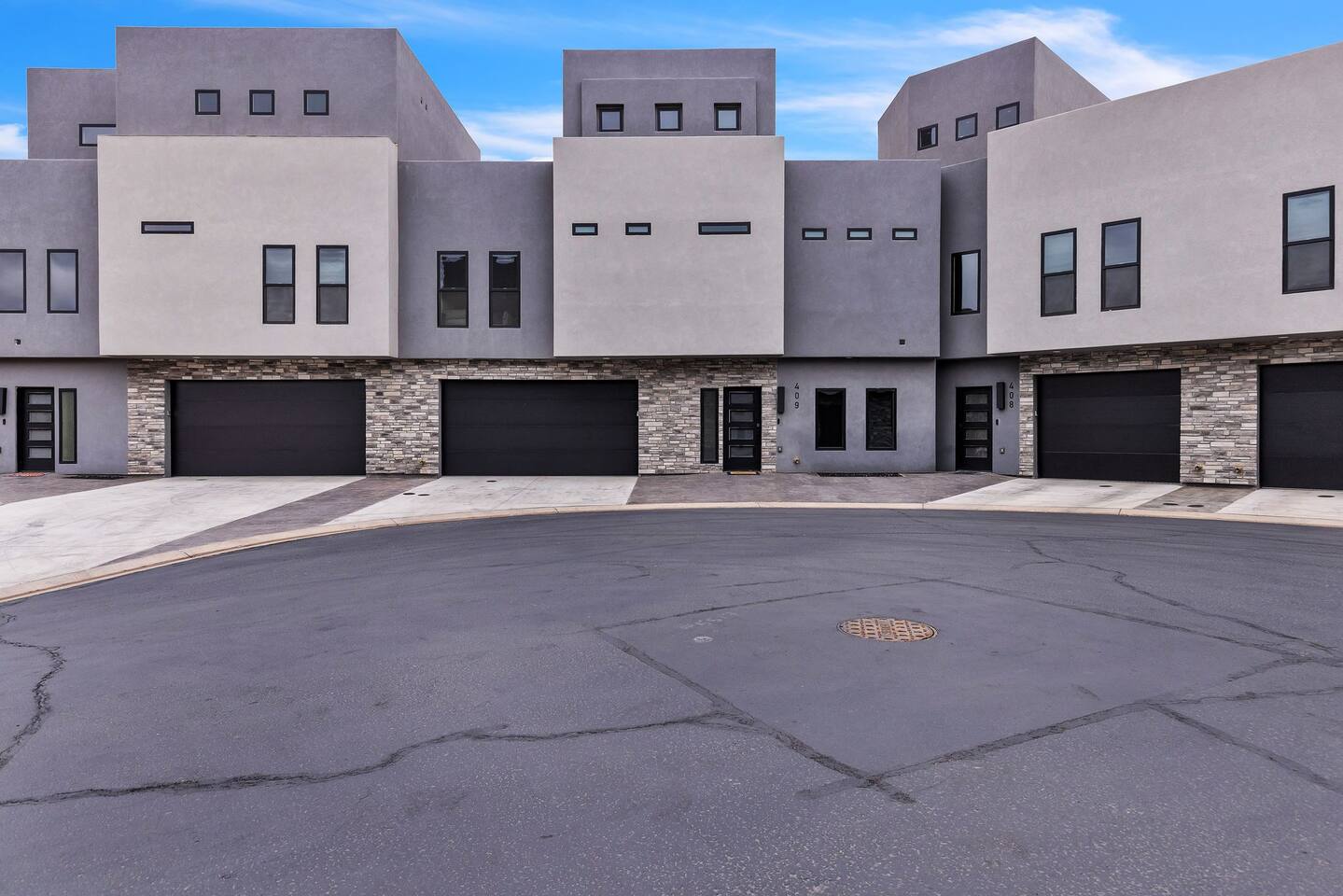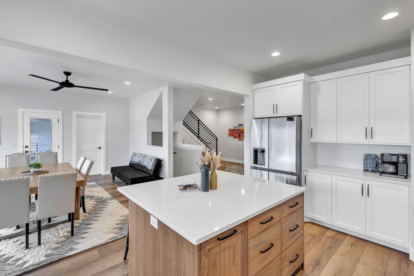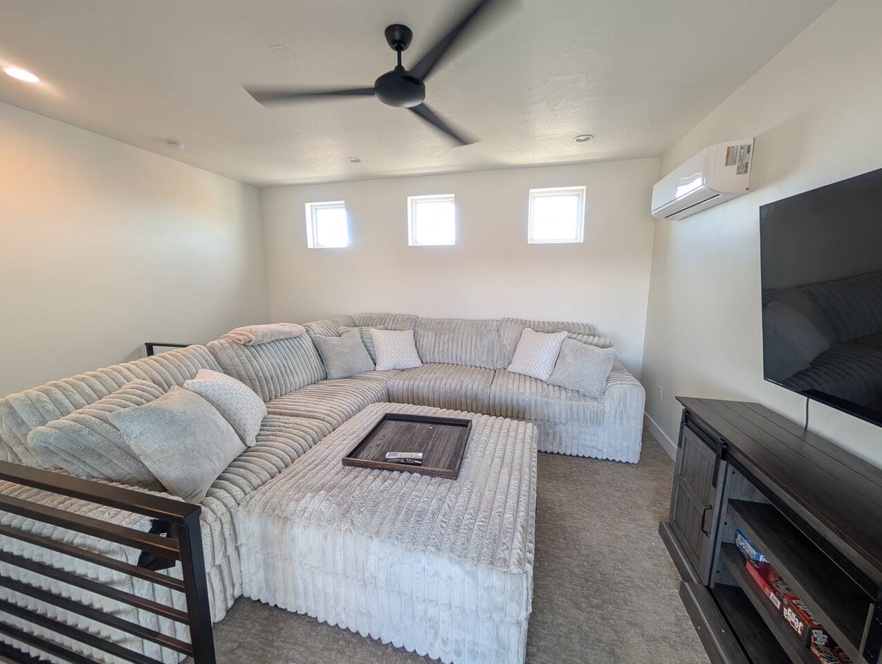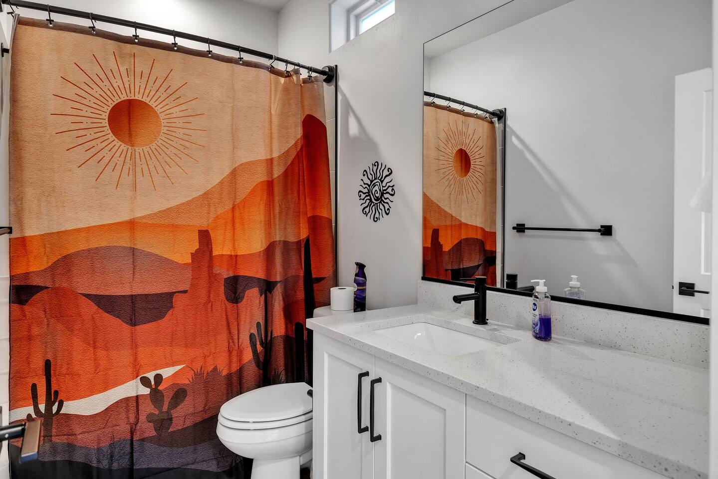 Step into the first floor, where a cozy seating area invites you to relax. You’ll find a fully stocked laundry room and the spacious bunk room with ensuite bathroom. This bunk room features three queen-size beds, a stunning photo of Zion National Park, and a large HD TV. Plus, the adult queen-over-queen bunk beds are rated for 400 lbs, making it perfect for everyone. Enjoy the beautiful view of the Pine Valley Mountains from this comfy space! Plus, there is an EV charger for those with electric vehicles. On the second floor, you’ll find a spacious combined kitchen and dining area that’s perfect for family gatherings. The kitchen is fully stocked with all the essentials, plus a blender, crockpot, and waffle iron! With seating for 8 at the dining table and 3 bar stools at the island counter, you can host everyone comfortably. The dining area features a stunning floor-to-ceiling window that offers an incredible view. Step out onto the balcony, where you can enjoy seating for 5 around a large fire table. Next, there’s the king-size master bedroom with an ensuite bathroom, and all bathrooms come stocked with bath soaps and plush towels. You’ll also find a third queen-size bedroom with its own ensuite bathroom, showcasing unique southwest art. As you head up to the third floor, you’ll pass a nice desk area with fast Wi-Fi for getting work done, along with a convenient half bathroom. The third floor features a large plush sectional and a big HD TV, perfect for movie nights. Step onto the rooftop patio to find a relaxing spa. Enjoy seating for 6 that overlooks the Pine Valley Mountains, Zion National Park in the distance, and the rest of St. George. The city lights and the stars are truly something special to see from this space. While you might hear the freeway in the distance, the stunning view definitely makes up for it. This charming townhome features a spacious dining area, fully stocked kitchen, and a large plush sectional perfect for relaxing. The rooftop patio is a highlight, boasting a hot tub with epic views of the Pine Valley Mountains, Zion National Park, and the city lights of St. George. The space comfortably sleeps up to 10 guests, ensuring it is ideal for families or groups. Enjoy movie nights on the big HD TV or unwind in the rooftop spa, making this townhome a perfect getaway. Book your stay today!