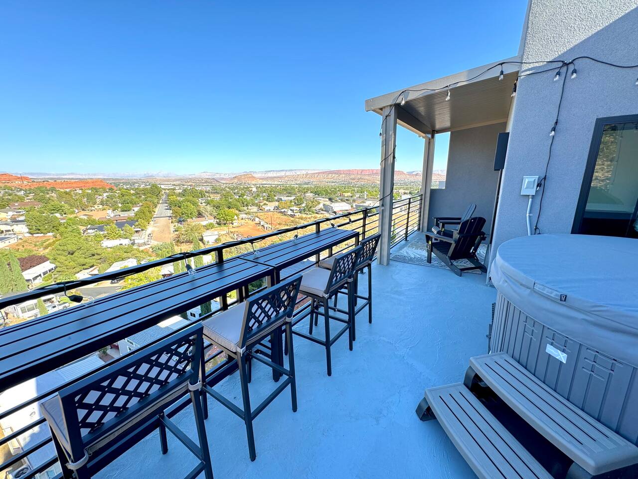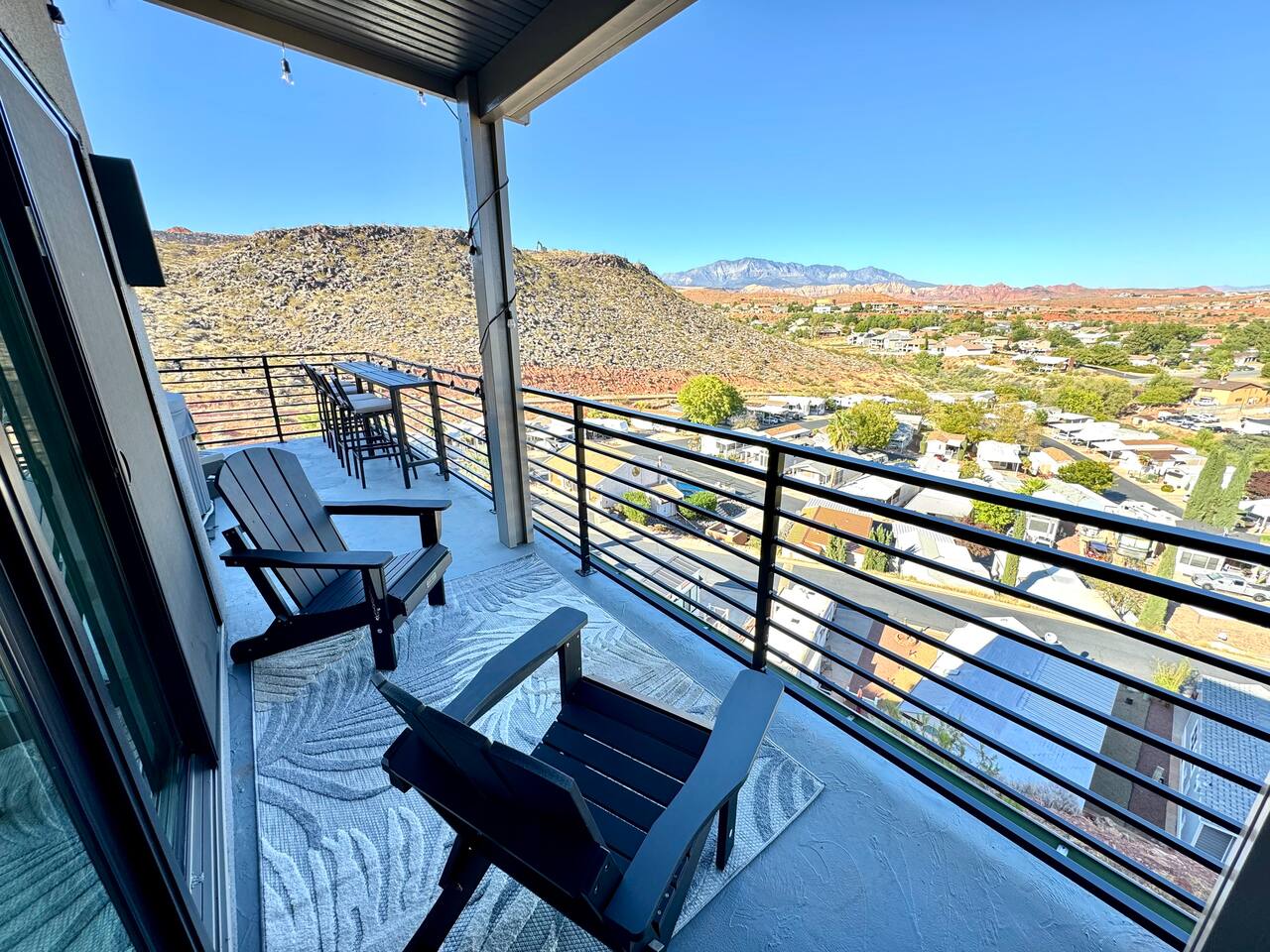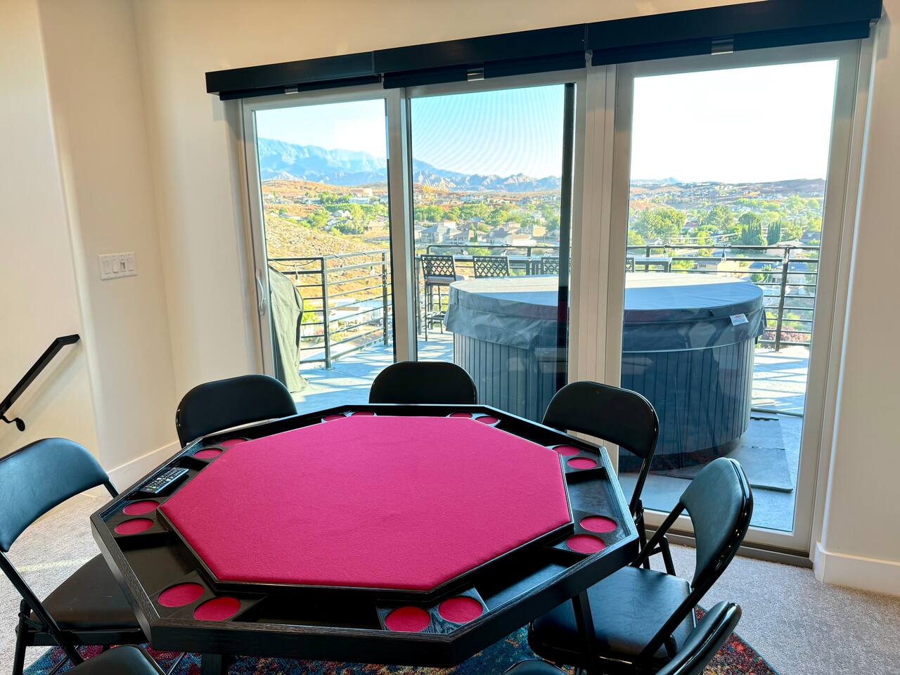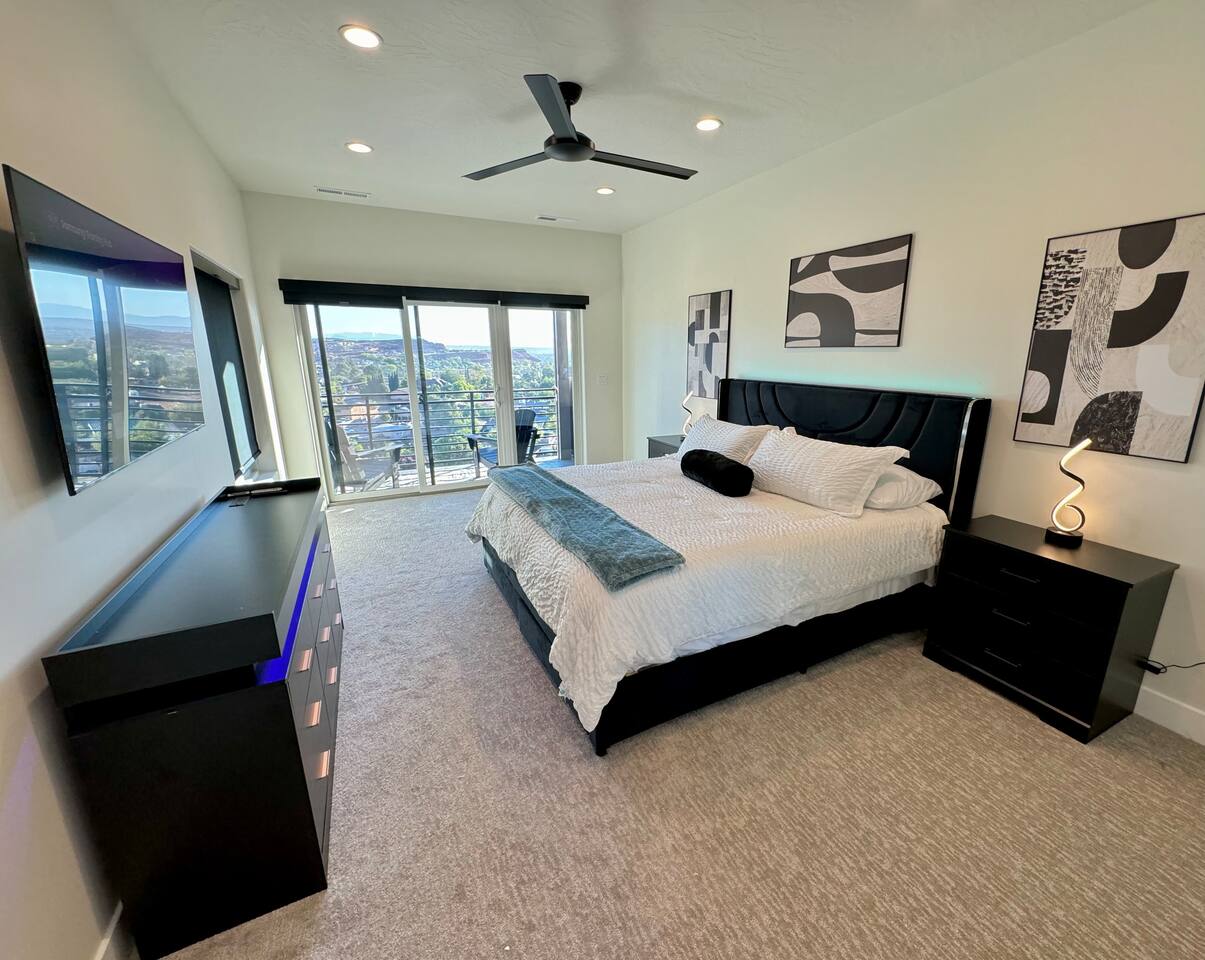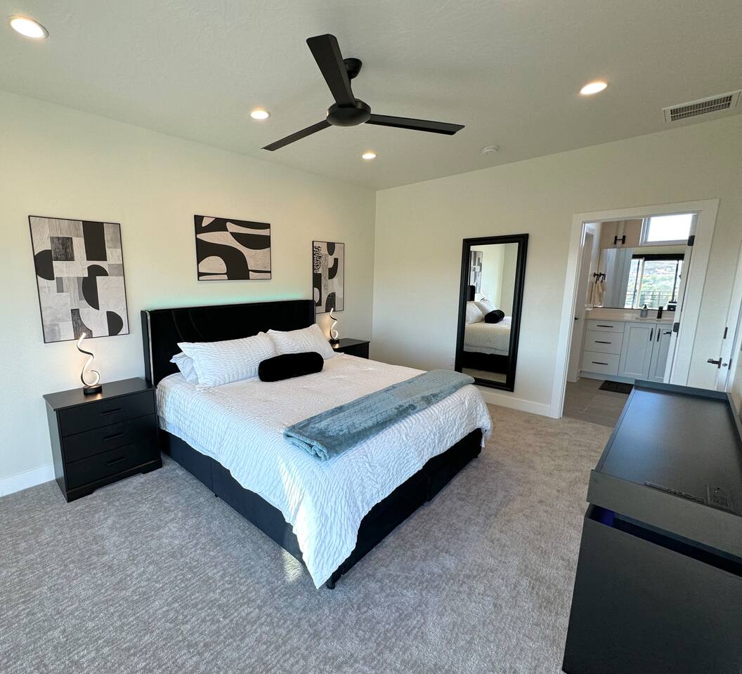 As you step into the first floor, you're greeted with stylish entry mats that set the tone for your stay. You'll find a fully stocked laundry room, making it easy to handle any washing needs during your visit. This floor also features a cozy bedroom with two queen beds, perfect for accommodating multiple guests comfortably. This bedroom has its own private bathroom for added convenience and privacy. The second floor boasts a spacious and combined kitchen, living, and dining area. The kitchen is fully equipped with all essentials, plus a blender, waffle iron, and crockpot. You'll also have your own personal Keurig coffee station. Enjoy your morning brew on the balcony overlooking the stunning Pine Valley Mountains. The living area features a huge modular couch that can be rearranged into one giant piece, like a bed. For your entertainment, there's a 120-inch projector screen that offers a home cinema experience, complete with extra cozy blankets and popcorn buckets. The dining area includes an 8-person counter-height table, perfect for meals and games. Off the living area, the balcony seats seven and features a fire table, making it the perfect spot to relax and unwind while enjoying the beautiful views. Additionally, the second floor includes a master bedroom with an ensuite bathroom, all designed in a modern boho theme, providing a luxurious and cozy atmosphere. On your way up to the third floor, you'll discover a cozy reading nook with deluxe chairs and abstract art above a personal work station, creating a perfect spot for relaxation or productivity. On the third floor, you'll find a game table that seats 8, perfect for game nights with friends and family. Play Texas Hold'em, Poker, Blackjack, Giant Jenga, or any other game you fancy. Plus, there's a large HD flat-screen TV and a mini bar stocked with everything you need for delicious cocktails and mocktails. It's a blast and promises a fun time for everyone! The rooftop patio is the perfect spot to unwind. It features a hot tub, bar height table overlooking the city, ideal for enjoying the view with friends or family and adirondack chairs are available for a relaxing and comfortable experience. Enjoy the serene atmosphere and take in the beautiful surroundings! The third master suite, conveniently located off the game area on the third floor, offers an incredible view from floor to ceiling windows. It features a luxurious modern theme, full-length mirror, and both the bed and dresser are enhanced with LED lighting to create a relaxing ambiance. The attached ensuite bathroom is well-appointed with double sinks, a walk-in closet, and a storage closet, ensuring ample space for all your needs. This stunning property is the perfect blend of luxury and comfort, offering spacious master suites, modern amenities, and breathtaking views. Whether you're relaxing in the game area, enjoying the deluxe bedrooms, or unwinding in the elegant ensuite bathrooms, every detail has been thoughtfully designed to provide an unforgettable stay. With a rooftop spa for ultimate relaxation and a home cinema for cozy movie nights, this getaway promises to be extraordinary. Book now and experience the ultimate retreat!