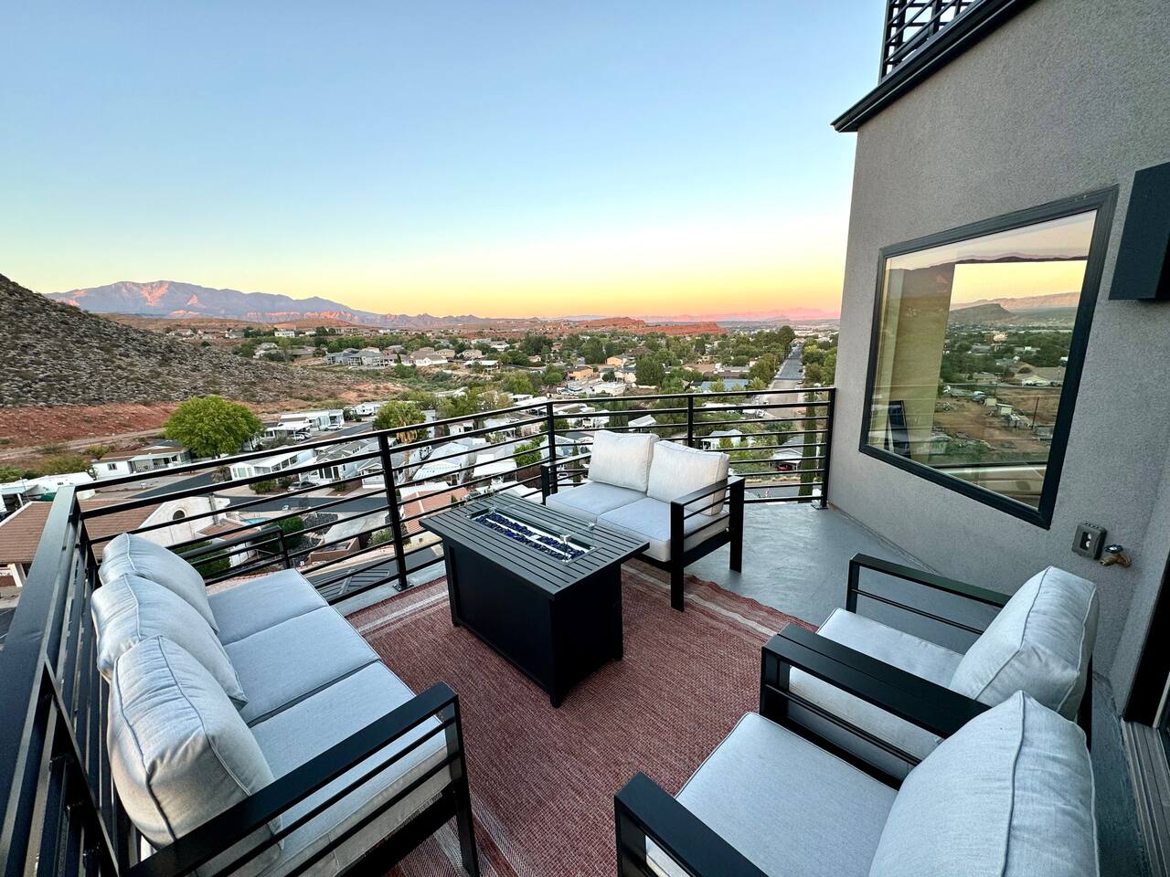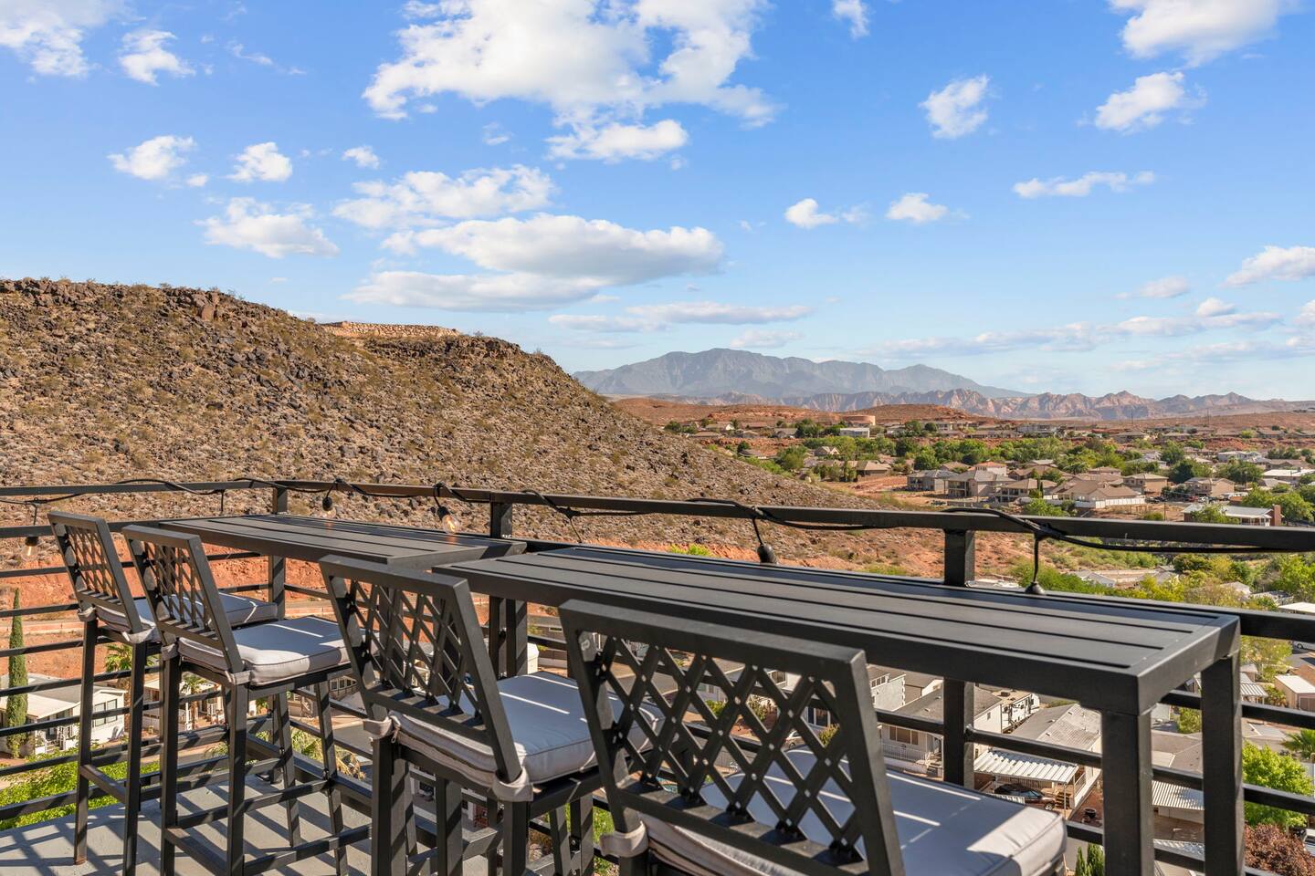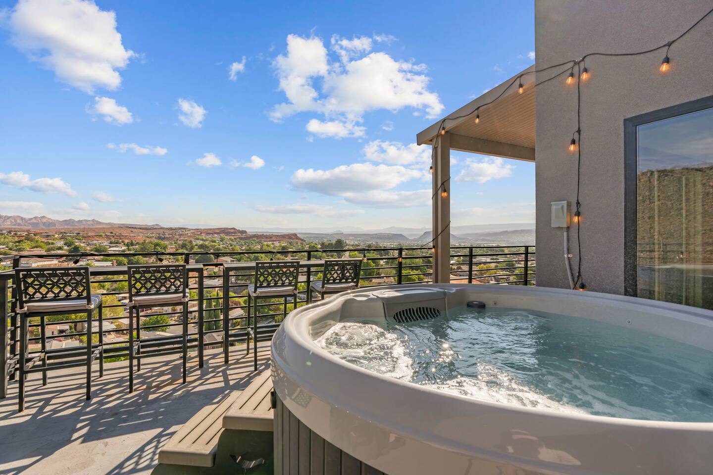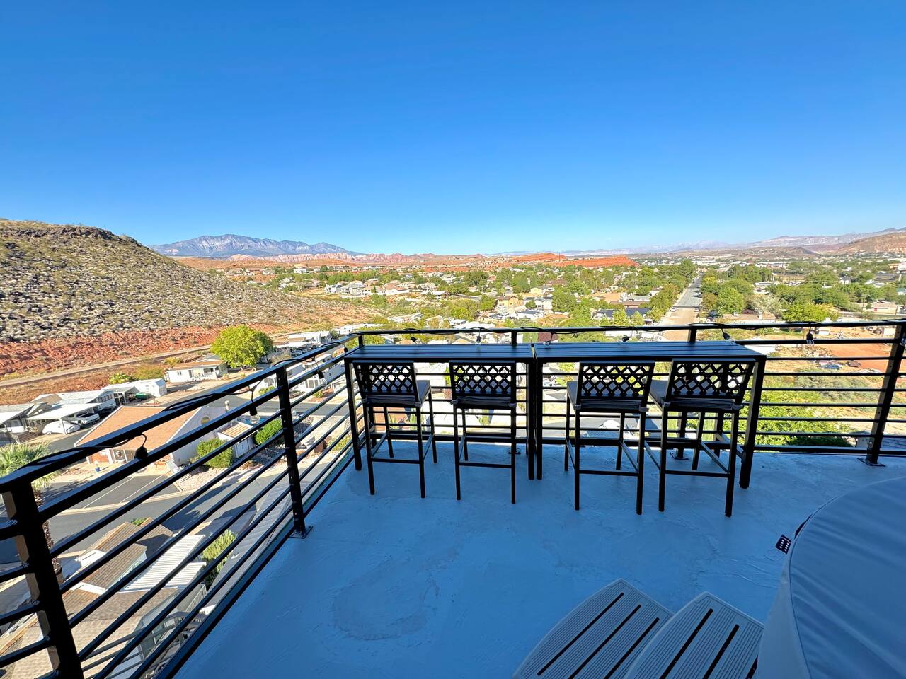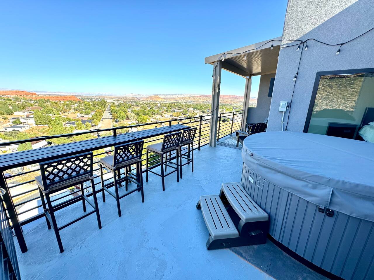 As you step into the first floor, you're greeted with stylish entry mats that set the tone for your stay. You'll find a fully stocked laundry room, making it easy to handle any washing needs during your visit. This floor also features a cozy bedroom with two queen beds, perfect for accommodating multiple guests comfortably. This bedroom has its own private bathroom for added convenience and privacy. The second floor boasts a spacious and combined kitchen, living, and dining area. The kitchen is fully equipped with all essentials, plus a blender, waffle iron, and crockpot. You'll also have your own personal Keurig coffee station. Enjoy your morning brew on the balcony overlooking the stunning Pine Valley Mountains. The living area features a huge modular couch that can be rearranged into one giant piece, like a bed. For your entertainment, there's a 120-inch projector screen that offers a home cinema experience, complete with extra cozy blankets and popcorn buckets. The dining area includes an 8-person counter-height table, perfect for meals and games. Off the living area, the balcony seats seven and features a fire table, making it the perfect spot to relax and unwind while enjoying the beautiful views. Additionally, the second floor includes a master bedroom with an ensuite bathroom, all designed in a modern boho theme, providing a luxurious and cozy atmosphere. On your way up to the third floor, you'll discover a cozy reading nook with deluxe chairs and abstract art above a personal work station, creating a perfect spot for relaxation or productivity. On the third floor, you'll find a game table that seats 8, perfect for game nights with friends and family. Play Texas Hold'em, Poker, Blackjack, Giant Jenga, or any other game you fancy. Plus, there's a large HD flat-screen TV and a mini bar stocked with everything you need for delicious cocktails and mocktails. It's a blast and promises a fun time for everyone! The rooftop patio is the perfect spot to unwind. It features a hot tub, bar height table overlooking the city, ideal for enjoying the view with friends or family and adirondack chairs are available for a relaxing and comfortable experience. Enjoy the serene atmosphere and take in the beautiful surroundings! The third master suite, conveniently located off the game area on the third floor, offers an incredible view from floor to ceiling windows. It features a luxurious modern theme, full-length mirror, and both the bed and dresser are enhanced with LED lighting to create a relaxing ambiance. The attached ensuite bathroom is well-appointed with double sinks, a walk-in closet, and a storage closet, ensuring ample space for all your needs. This stunning property is the perfect blend of luxury and comfort, offering spacious master suites, modern amenities, and breathtaking views. Whether you're relaxing in the game area, enjoying the deluxe bedrooms, or unwinding in the elegant ensuite bathrooms, every detail has been thoughtfully designed to provide an unforgettable stay. With a rooftop spa for ultimate relaxation and a home cinema for cozy movie nights, this getaway promises to be extraordinary. Book now and experience the ultimate retreat!