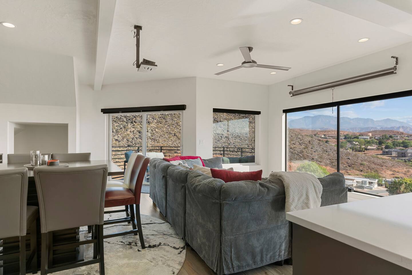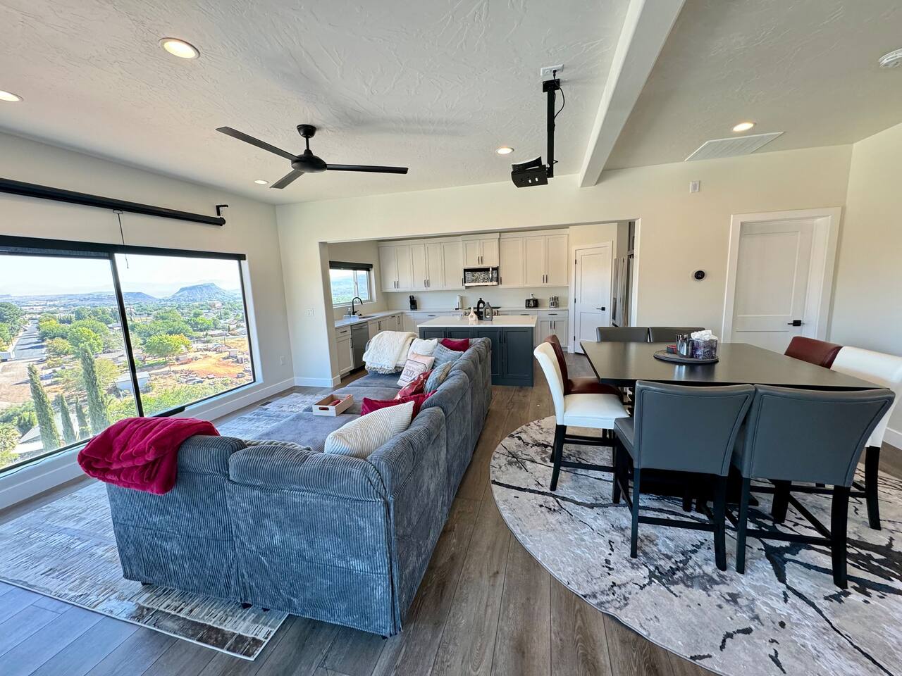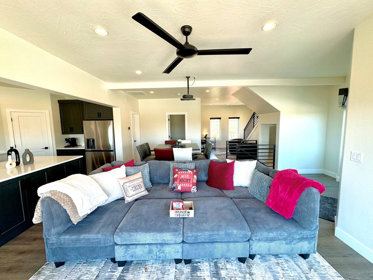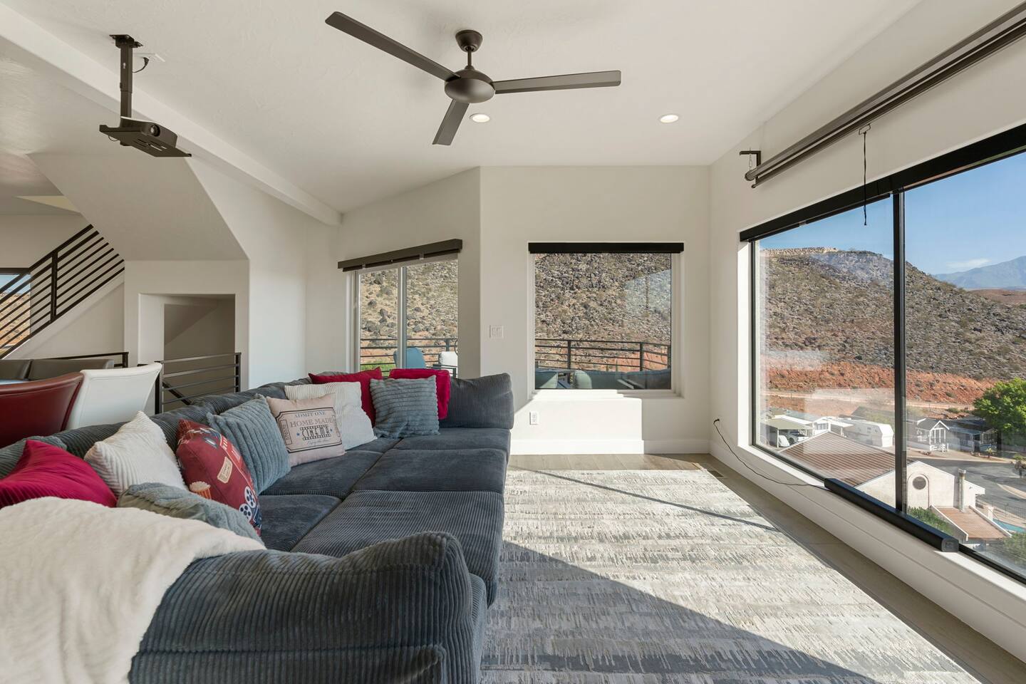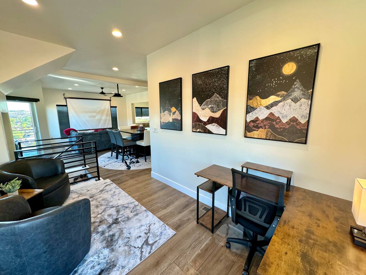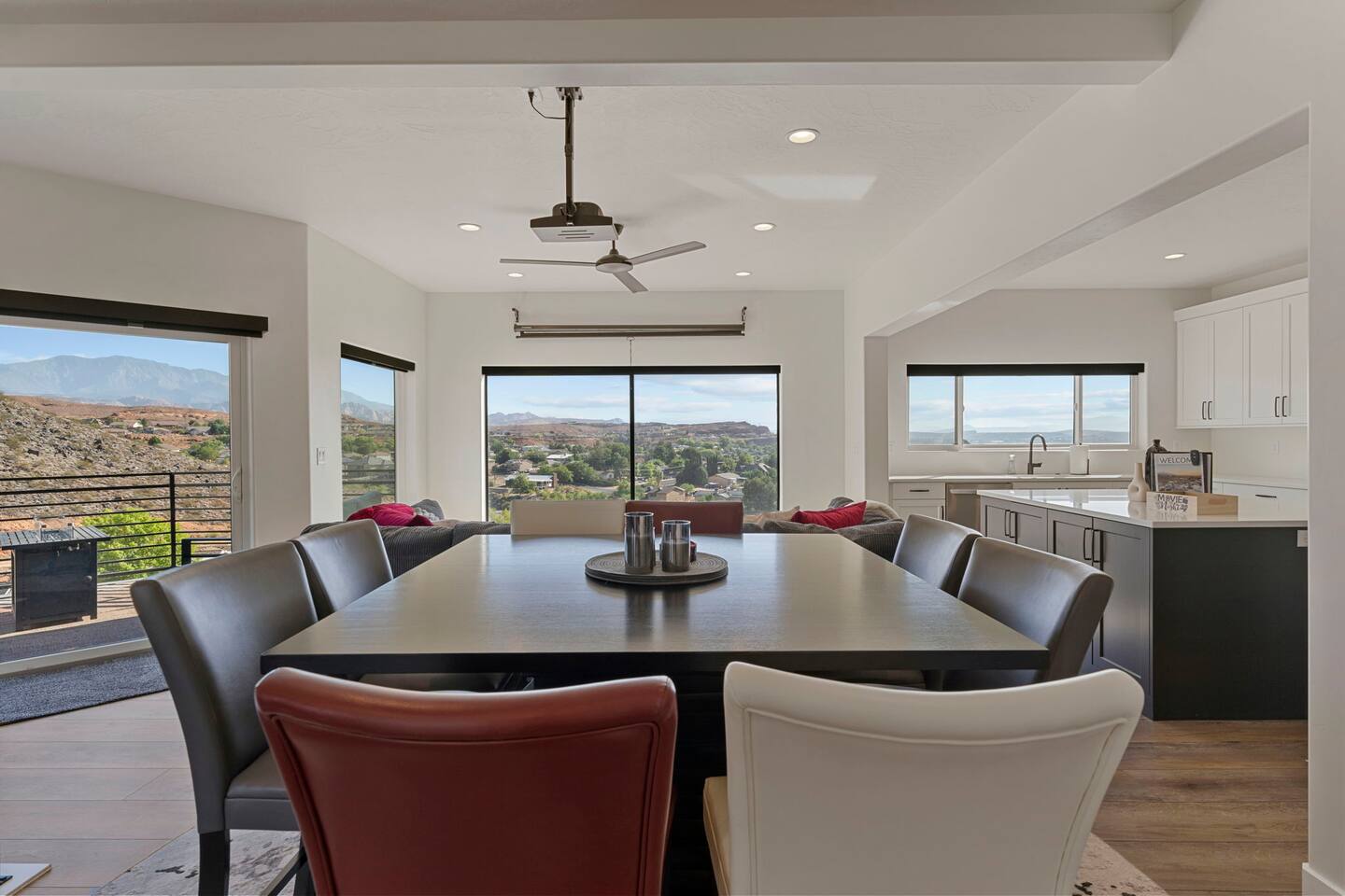 As you step into the first floor, you're greeted with stylish entry mats that set the tone for your stay. You'll find a fully stocked laundry room, making it easy to handle any washing needs during your visit. This floor also features a cozy bedroom with two queen beds, perfect for accommodating multiple guests comfortably. This bedroom has its own private bathroom for added convenience and privacy. The second floor boasts a spacious and combined kitchen, living, and dining area. The kitchen is fully equipped with all essentials, plus a blender, waffle iron, and crockpot. You'll also have your own personal Keurig coffee station. Enjoy your morning brew on the balcony overlooking the stunning Pine Valley Mountains. The living area features a huge modular couch that can be rearranged into one giant piece, like a bed. For your entertainment, there's a 120-inch projector screen that offers a home cinema experience, complete with extra cozy blankets and popcorn buckets. The dining area includes an 8-person counter-height table, perfect for meals and games. Off the living area, the balcony seats seven and features a fire table, making it the perfect spot to relax and unwind while enjoying the beautiful views. Additionally, the second floor includes a master bedroom with an ensuite bathroom, all designed in a modern boho theme, providing a luxurious and cozy atmosphere. On your way up to the third floor, you'll discover a cozy reading nook with deluxe chairs and abstract art above a personal work station, creating a perfect spot for relaxation or productivity. On the third floor, you'll find a game table that seats 8, perfect for game nights with friends and family. Play Texas Hold'em, Poker, Blackjack, Giant Jenga, or any other game you fancy. Plus, there's a large HD flat-screen TV and a mini bar stocked with everything you need for delicious cocktails and mocktails. It's a blast and promises a fun time for everyone! The rooftop patio is the perfect spot to unwind. It features a hot tub, bar height table overlooking the city, ideal for enjoying the view with friends or family and adirondack chairs are available for a relaxing and comfortable experience. Enjoy the serene atmosphere and take in the beautiful surroundings! The third master suite, conveniently located off the game area on the third floor, offers an incredible view from floor to ceiling windows. It features a luxurious modern theme, full-length mirror, and both the bed and dresser are enhanced with LED lighting to create a relaxing ambiance. The attached ensuite bathroom is well-appointed with double sinks, a walk-in closet, and a storage closet, ensuring ample space for all your needs. This stunning property is the perfect blend of luxury and comfort, offering spacious master suites, modern amenities, and breathtaking views. Whether you're relaxing in the game area, enjoying the deluxe bedrooms, or unwinding in the elegant ensuite bathrooms, every detail has been thoughtfully designed to provide an unforgettable stay. With a rooftop spa for ultimate relaxation and a home cinema for cozy movie nights, this getaway promises to be extraordinary. Book now and experience the ultimate retreat!