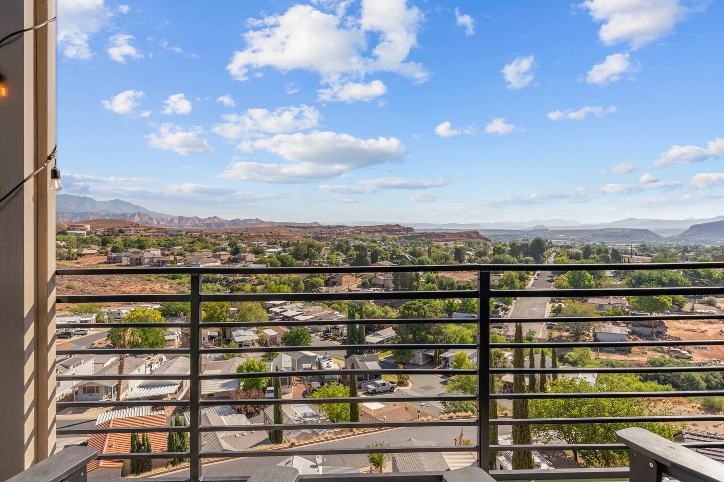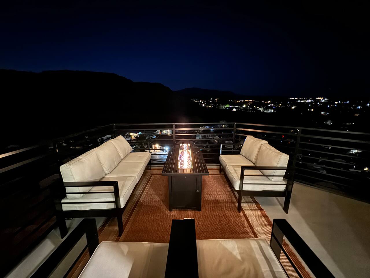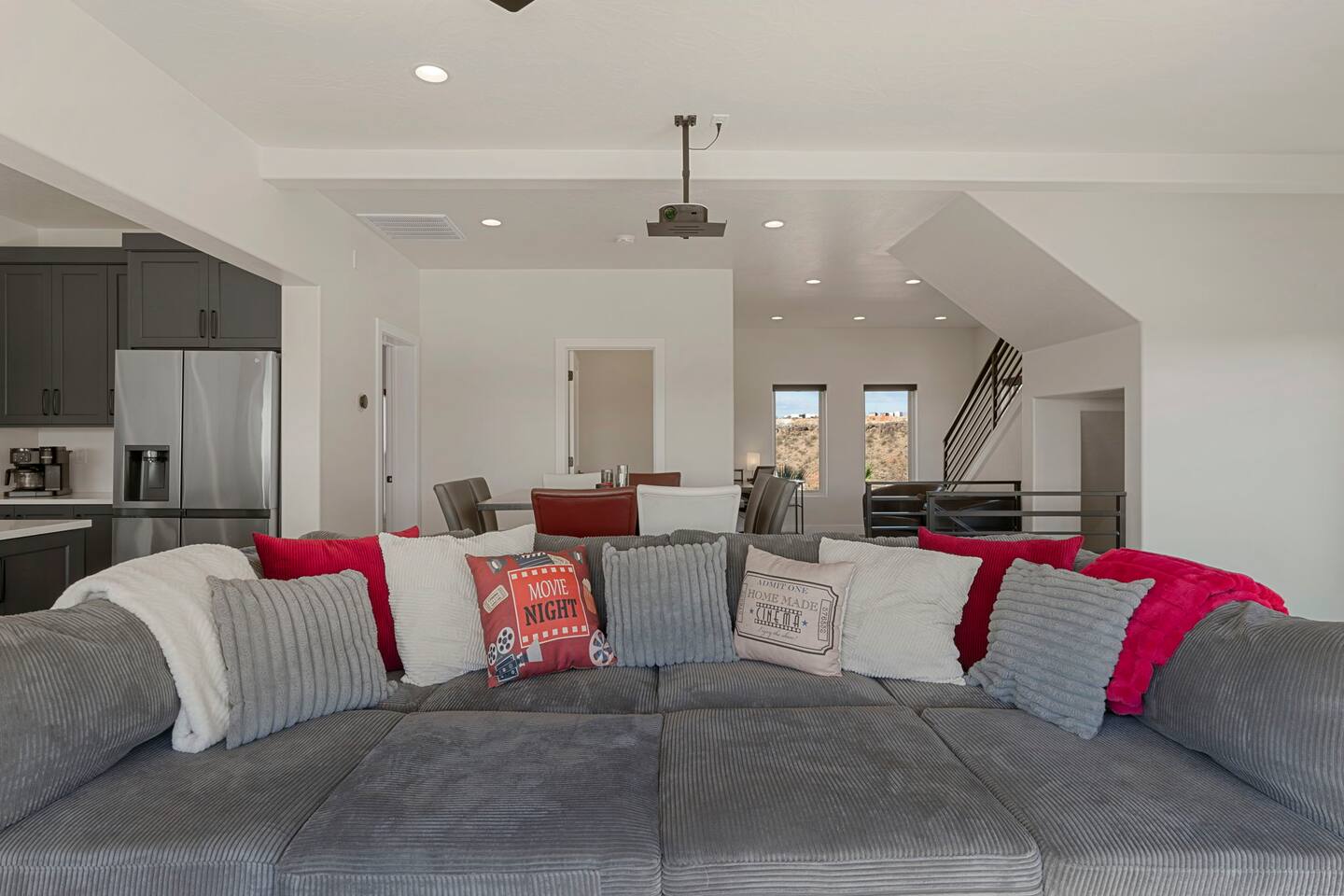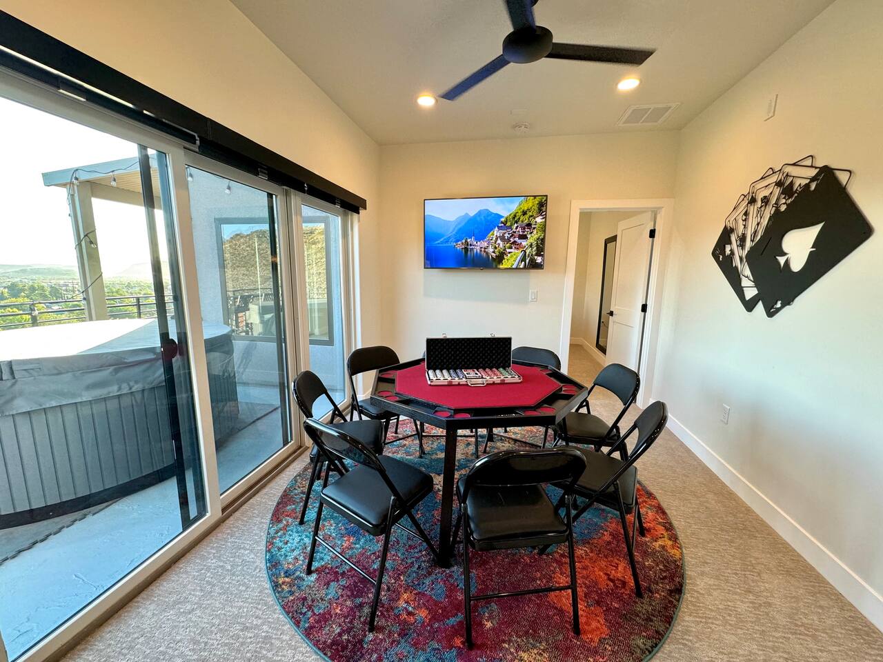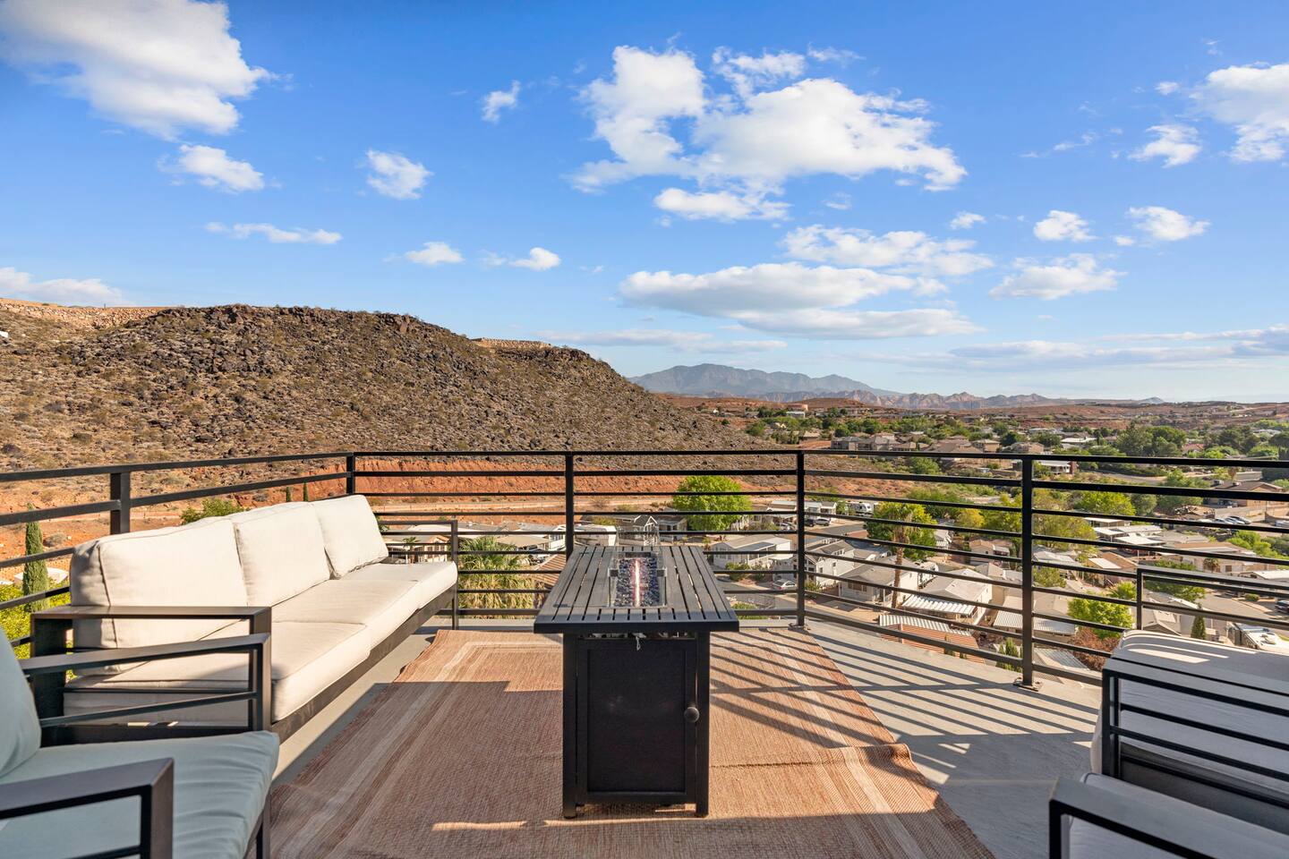 As you step into the first floor, you're greeted with stylish entry mats that set the tone for your stay. You'll find a fully stocked laundry room, making it easy to handle any washing needs during your visit. This floor also features a cozy bedroom with two queen beds, perfect for accommodating multiple guests comfortably. This bedroom has its own private bathroom for added convenience and privacy. The second floor boasts a spacious and combined kitchen, living, and dining area. The kitchen is fully equipped with all essentials, plus a blender, waffle iron, and crockpot. You'll also have your own personal Keurig coffee station. Enjoy your morning brew on the balcony overlooking the stunning Pine Valley Mountains. The living area features a huge modular couch that can be rearranged into one giant piece, like a bed. For your entertainment, there's a 120-inch projector screen that offers a home cinema experience, complete with extra cozy blankets and popcorn buckets. The dining area includes an 8-person counter-height table, perfect for meals and games. Off the living area, the balcony seats seven and features a fire table, making it the perfect spot to relax and unwind while enjoying the beautiful views. Additionally, the second floor includes a master bedroom with an ensuite bathroom, all designed in a modern boho theme, providing a luxurious and cozy atmosphere. On your way up to the third floor, you'll discover a cozy reading nook with deluxe chairs and abstract art above a personal work station, creating a perfect spot for relaxation or productivity. On the third floor, you'll find a game table that seats 8, perfect for game nights with friends and family. Play Texas Hold'em, Poker, Blackjack, Giant Jenga, or any other game you fancy. Plus, there's a large HD flat-screen TV and a mini bar stocked with everything you need for delicious cocktails and mocktails. It's a blast and promises a fun time for everyone! The rooftop patio is the perfect spot to unwind. It features a hot tub, bar height table overlooking the city, ideal for enjoying the view with friends or family and adirondack chairs are available for a relaxing and comfortable experience. Enjoy the serene atmosphere and take in the beautiful surroundings! The third master suite, conveniently located off the game area on the third floor, offers an incredible view from floor to ceiling windows. It features a luxurious modern theme, full-length mirror, and both the bed and dresser are enhanced with LED lighting to create a relaxing ambiance. The attached ensuite bathroom is well-appointed with double sinks, a walk-in closet, and a storage closet, ensuring ample space for all your needs. This stunning property is the perfect blend of luxury and comfort, offering spacious master suites, modern amenities, and breathtaking views. Whether you're relaxing in the game area, enjoying the deluxe bedrooms, or unwinding in the elegant ensuite bathrooms, every detail has been thoughtfully designed to provide an unforgettable stay. With a rooftop spa for ultimate relaxation and a home cinema for cozy movie nights, this getaway promises to be extraordinary. Book now and experience the ultimate retreat!