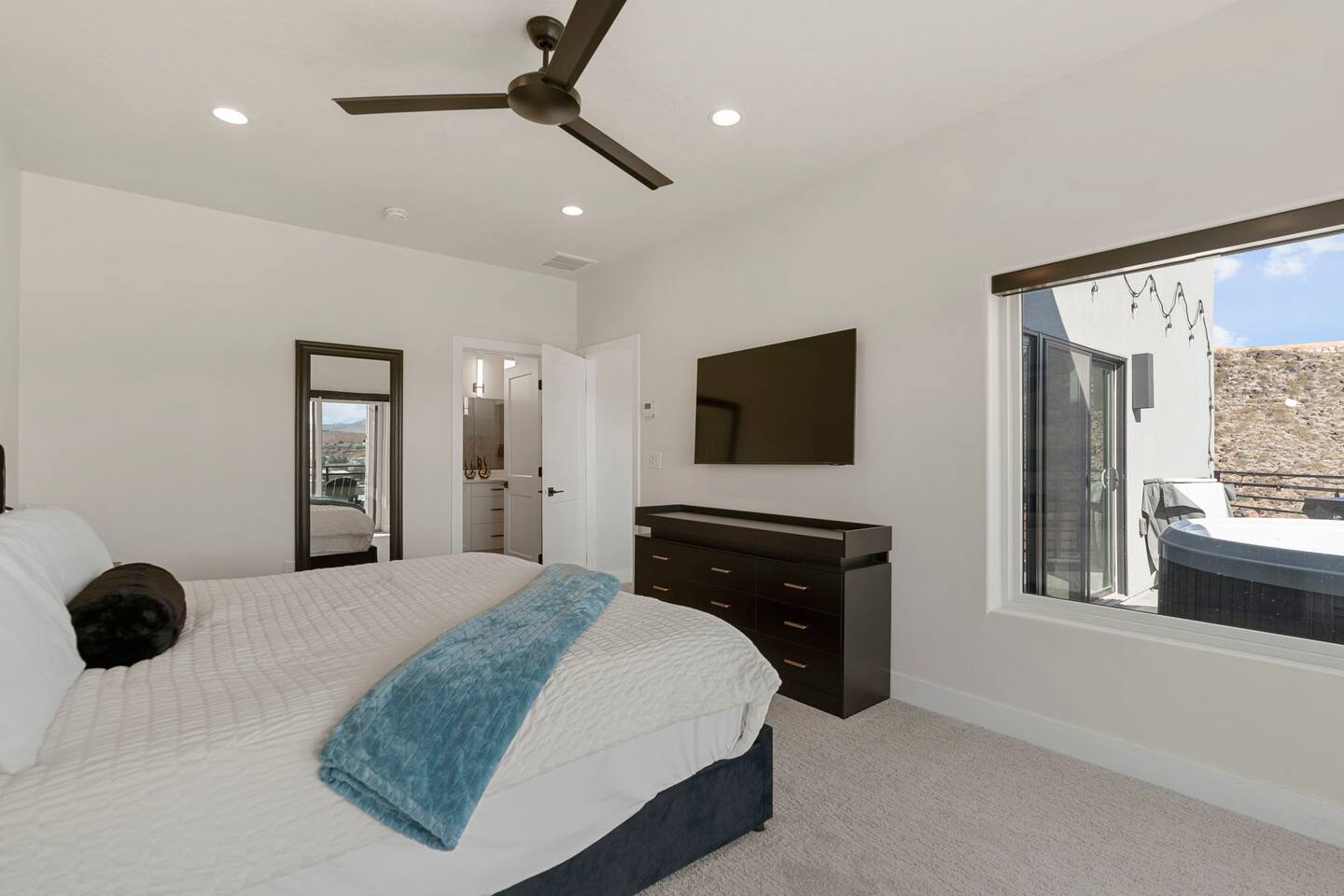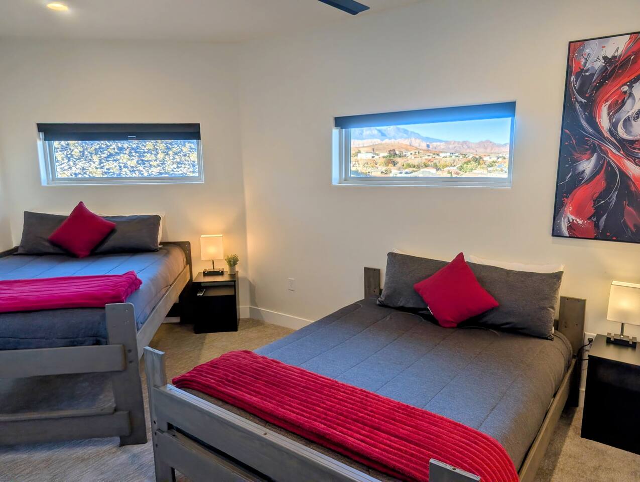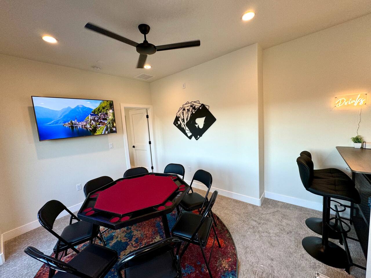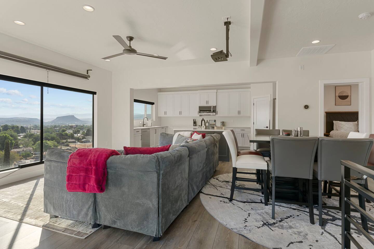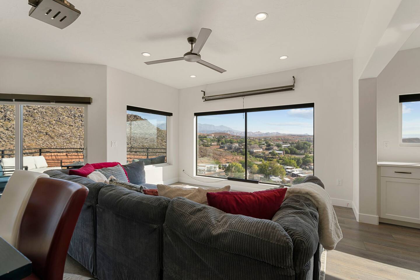 As you step into the first floor, you're greeted with stylish entry mats that set the tone for your stay. You'll find a fully stocked laundry room, making it easy to handle any washing needs during your visit. This floor also features a cozy bedroom with two queen beds, perfect for accommodating multiple guests comfortably. This bedroom has its own private bathroom for added convenience and privacy. The second floor boasts a spacious and combined kitchen, living, and dining area. The kitchen is fully equipped with all essentials, plus a blender, waffle iron, and crockpot. You'll also have your own personal Keurig coffee station. Enjoy your morning brew on the balcony overlooking the stunning Pine Valley Mountains. The living area features a huge modular couch that can be rearranged into one giant piece, like a bed. For your entertainment, there's a 120-inch projector screen that offers a home cinema experience, complete with extra cozy blankets and popcorn buckets. The dining area includes an 8-person counter-height table, perfect for meals and games. Off the living area, the balcony seats seven and features a fire table, making it the perfect spot to relax and unwind while enjoying the beautiful views. Additionally, the second floor includes a master bedroom with an ensuite bathroom, all designed in a modern boho theme, providing a luxurious and cozy atmosphere. On your way up to the third floor, you'll discover a cozy reading nook with deluxe chairs and abstract art above a personal work station, creating a perfect spot for relaxation or productivity. On the third floor, you'll find a game table that seats 8, perfect for game nights with friends and family. Play Texas Hold'em, Poker, Blackjack, Giant Jenga, or any other game you fancy. Plus, there's a large HD flat-screen TV and a mini bar stocked with everything you need for delicious cocktails and mocktails. It's a blast and promises a fun time for everyone! The rooftop patio is the perfect spot to unwind. It features a hot tub, bar height table overlooking the city, ideal for enjoying the view with friends or family and adirondack chairs are available for a relaxing and comfortable experience. Enjoy the serene atmosphere and take in the beautiful surroundings! The third master suite, conveniently located off the game area on the third floor, offers an incredible view from floor to ceiling windows. It features a luxurious modern theme, full-length mirror, and both the bed and dresser are enhanced with LED lighting to create a relaxing ambiance. The attached ensuite bathroom is well-appointed with double sinks, a walk-in closet, and a storage closet, ensuring ample space for all your needs. This stunning property is the perfect blend of luxury and comfort, offering spacious master suites, modern amenities, and breathtaking views. Whether you're relaxing in the game area, enjoying the deluxe bedrooms, or unwinding in the elegant ensuite bathrooms, every detail has been thoughtfully designed to provide an unforgettable stay. With a rooftop spa for ultimate relaxation and a home cinema for cozy movie nights, this getaway promises to be extraordinary. Book now and experience the ultimate retreat!