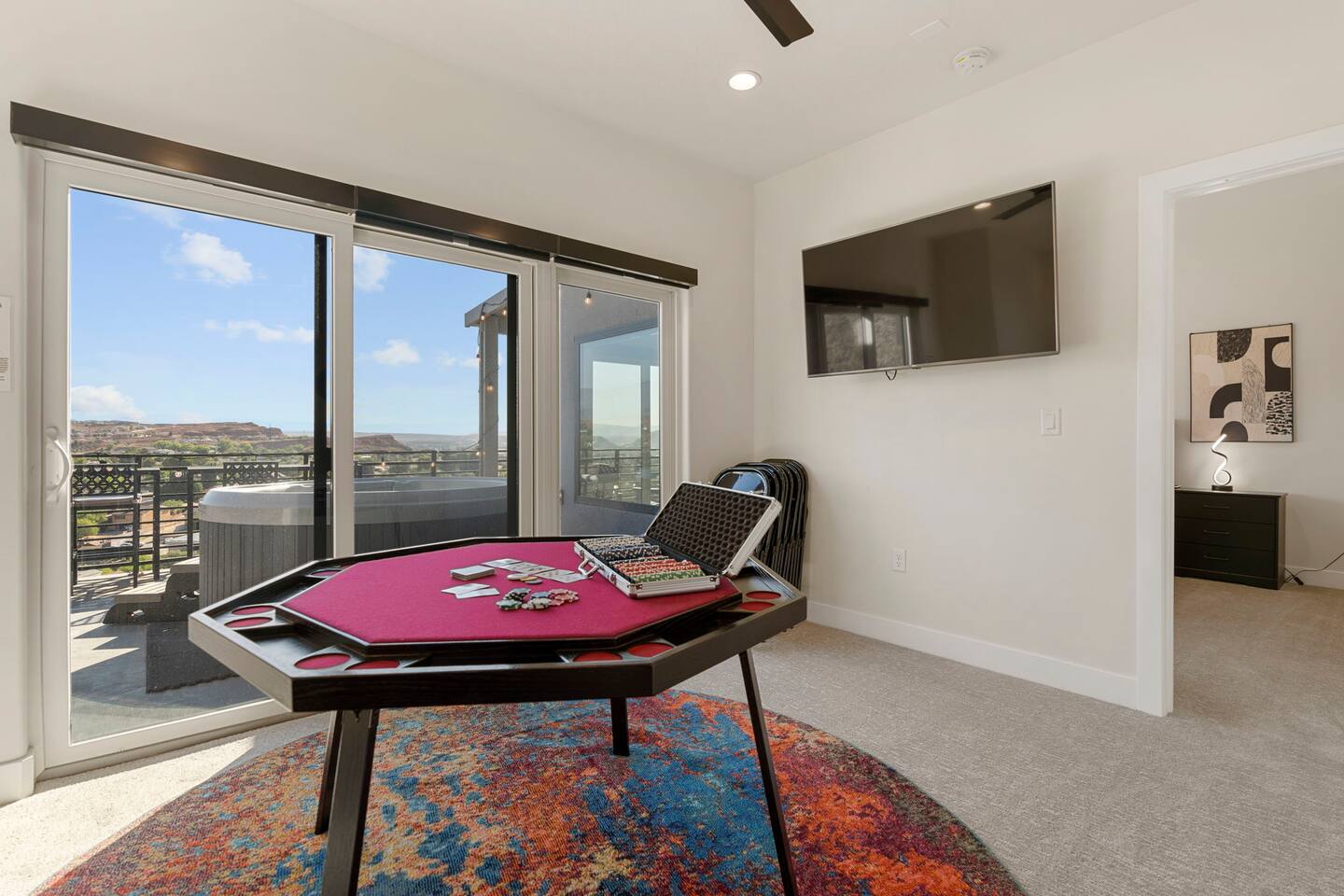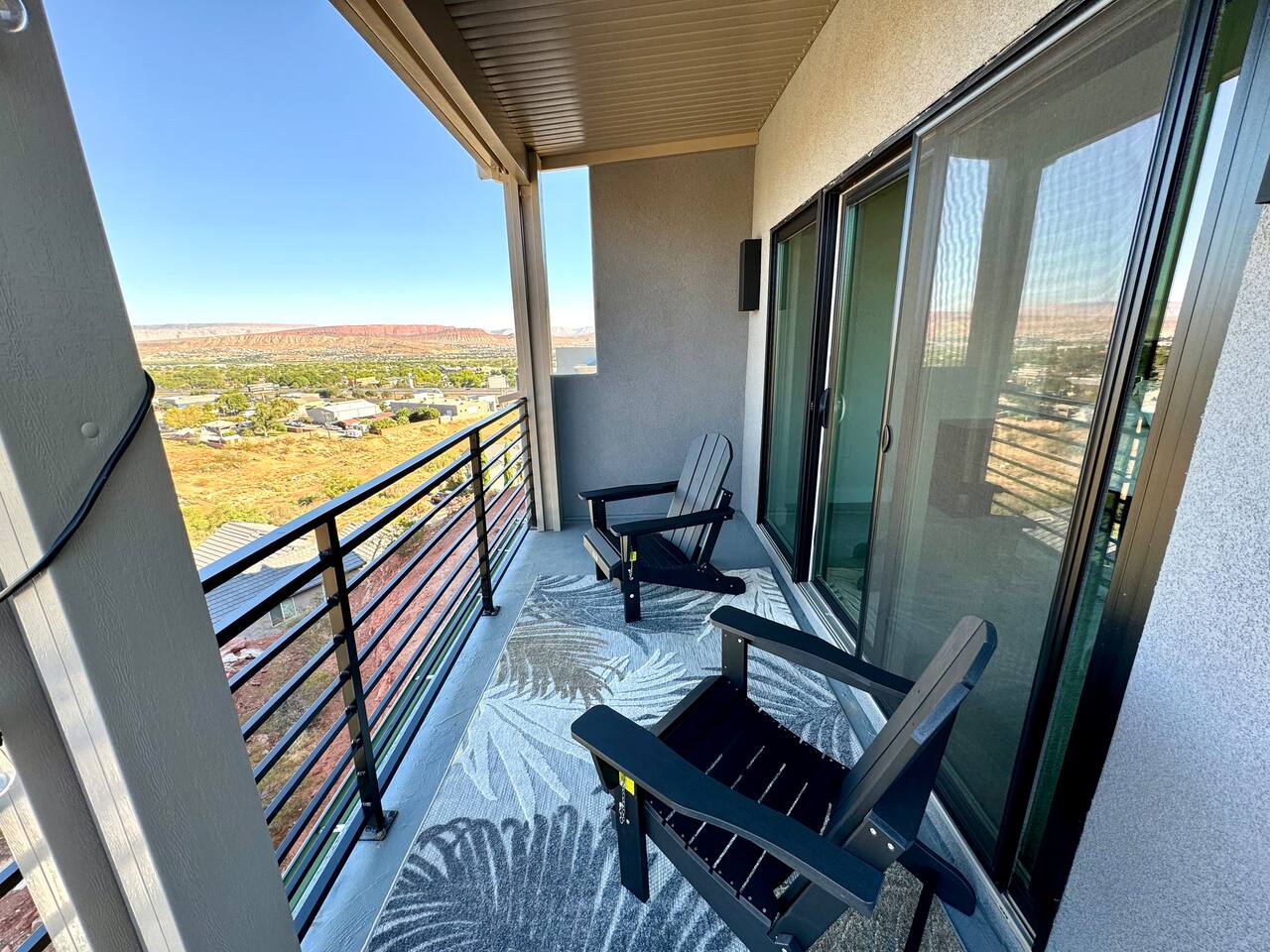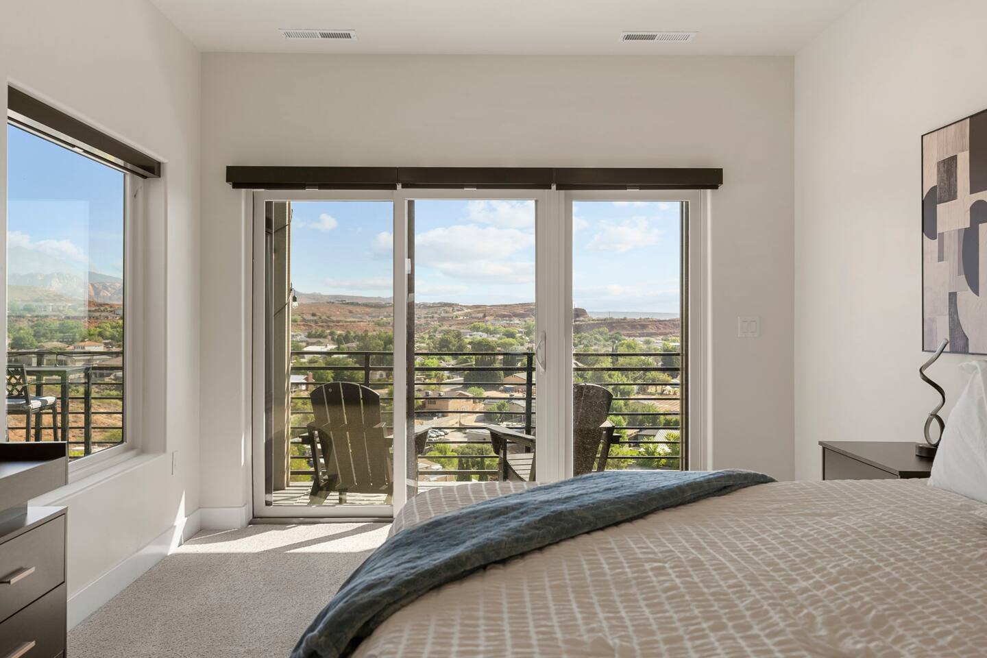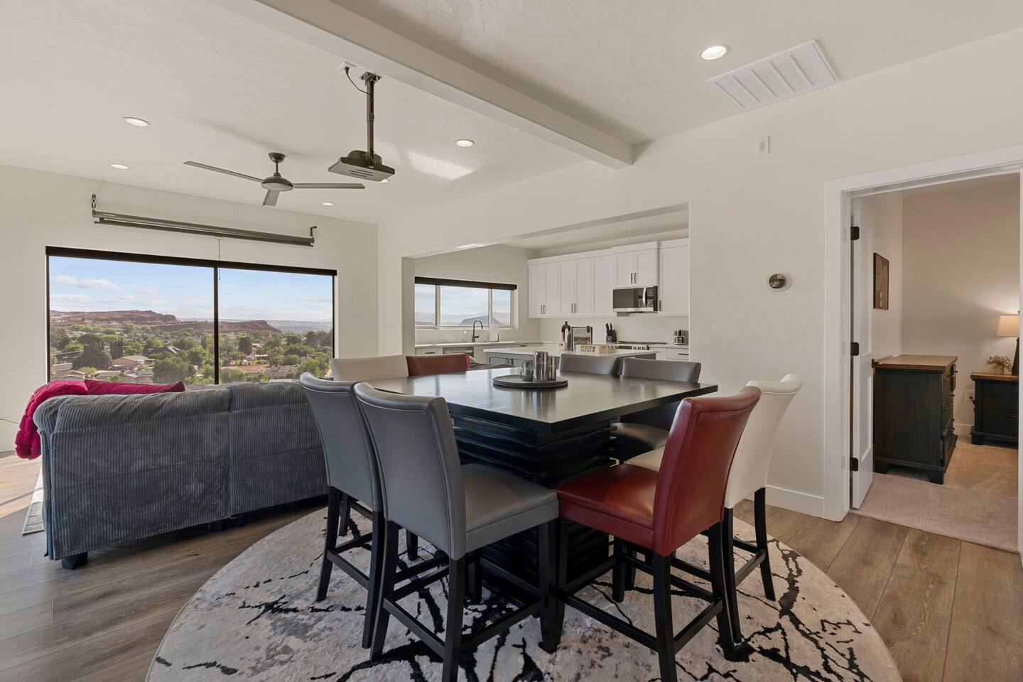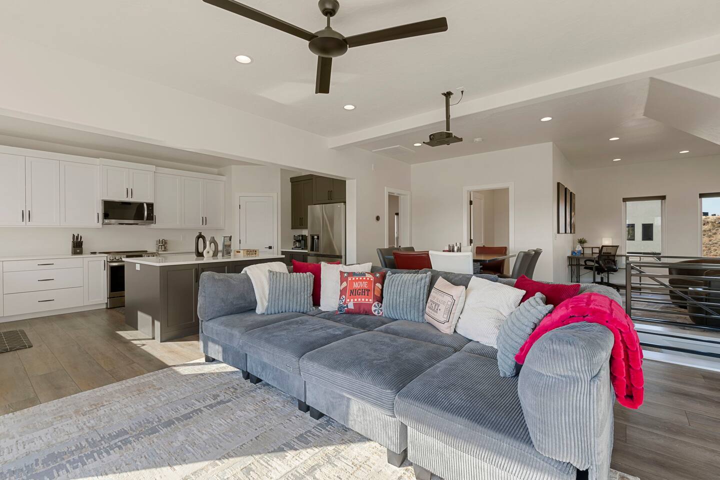 As you step into the first floor, you're greeted with stylish entry mats that set the tone for your stay. You'll find a fully stocked laundry room, making it easy to handle any washing needs during your visit. This floor also features a cozy bedroom with two queen beds, perfect for accommodating multiple guests comfortably. This bedroom has its own private bathroom for added convenience and privacy. The second floor boasts a spacious and combined kitchen, living, and dining area. The kitchen is fully equipped with all essentials, plus a blender, waffle iron, and crockpot. You'll also have your own personal Keurig coffee station. Enjoy your morning brew on the balcony overlooking the stunning Pine Valley Mountains. The living area features a huge modular couch that can be rearranged into one giant piece, like a bed. For your entertainment, there's a 120-inch projector screen that offers a home cinema experience, complete with extra cozy blankets and popcorn buckets. The dining area includes an 8-person counter-height table, perfect for meals and games. Off the living area, the balcony seats seven and features a fire table, making it the perfect spot to relax and unwind while enjoying the beautiful views. Additionally, the second floor includes a master bedroom with an ensuite bathroom, all designed in a modern boho theme, providing a luxurious and cozy atmosphere. On your way up to the third floor, you'll discover a cozy reading nook with deluxe chairs and abstract art above a personal work station, creating a perfect spot for relaxation or productivity. On the third floor, you'll find a game table that seats 8, perfect for game nights with friends and family. Play Texas Hold'em, Poker, Blackjack, Giant Jenga, or any other game you fancy. Plus, there's a large HD flat-screen TV and a mini bar stocked with everything you need for delicious cocktails and mocktails. It's a blast and promises a fun time for everyone! The rooftop patio is the perfect spot to unwind. It features a hot tub, bar height table overlooking the city, ideal for enjoying the view with friends or family and adirondack chairs are available for a relaxing and comfortable experience. Enjoy the serene atmosphere and take in the beautiful surroundings! The third master suite, conveniently located off the game area on the third floor, offers an incredible view from floor to ceiling windows. It features a luxurious modern theme, full-length mirror, and both the bed and dresser are enhanced with LED lighting to create a relaxing ambiance. The attached ensuite bathroom is well-appointed with double sinks, a walk-in closet, and a storage closet, ensuring ample space for all your needs. This stunning property is the perfect blend of luxury and comfort, offering spacious master suites, modern amenities, and breathtaking views. Whether you're relaxing in the game area, enjoying the deluxe bedrooms, or unwinding in the elegant ensuite bathrooms, every detail has been thoughtfully designed to provide an unforgettable stay. With a rooftop spa for ultimate relaxation and a home cinema for cozy movie nights, this getaway promises to be extraordinary. Book now and experience the ultimate retreat!