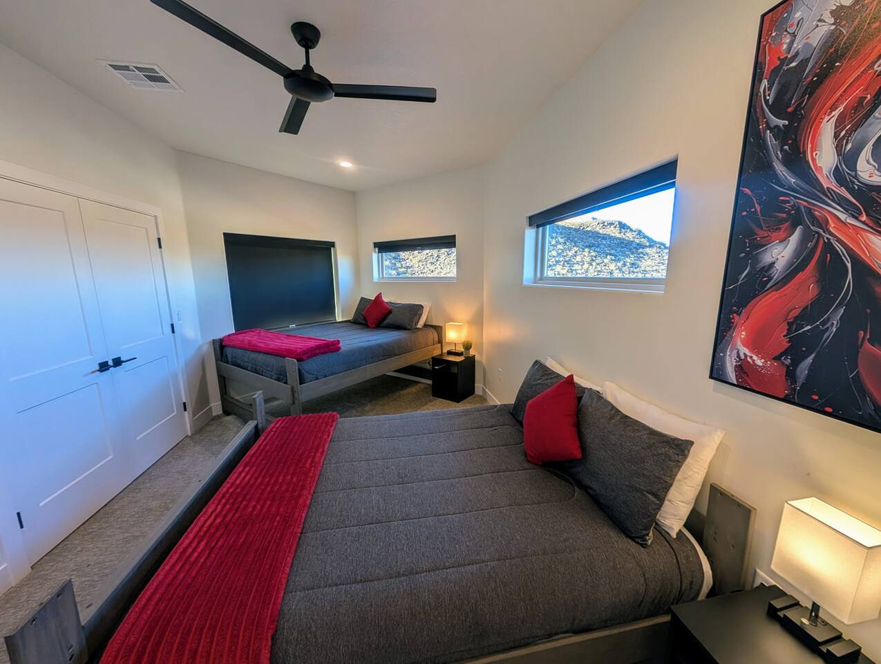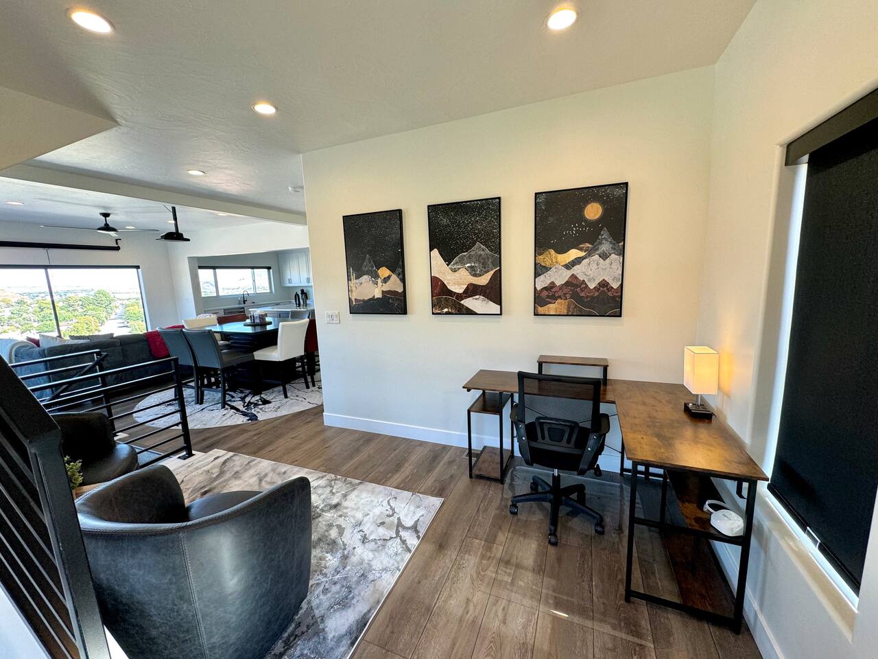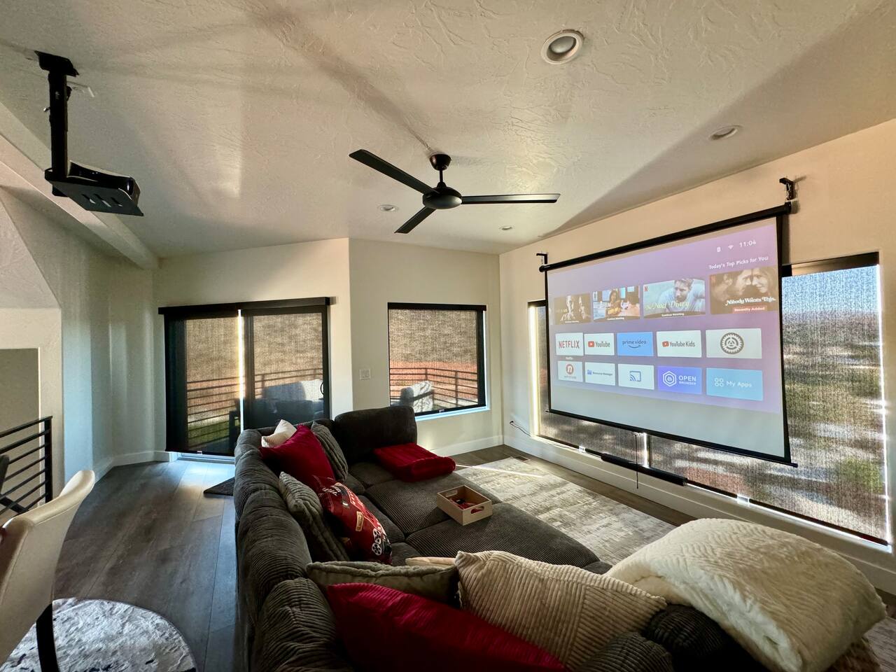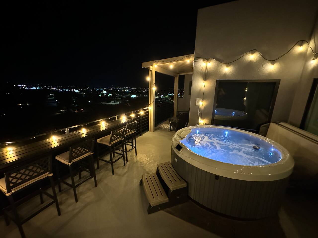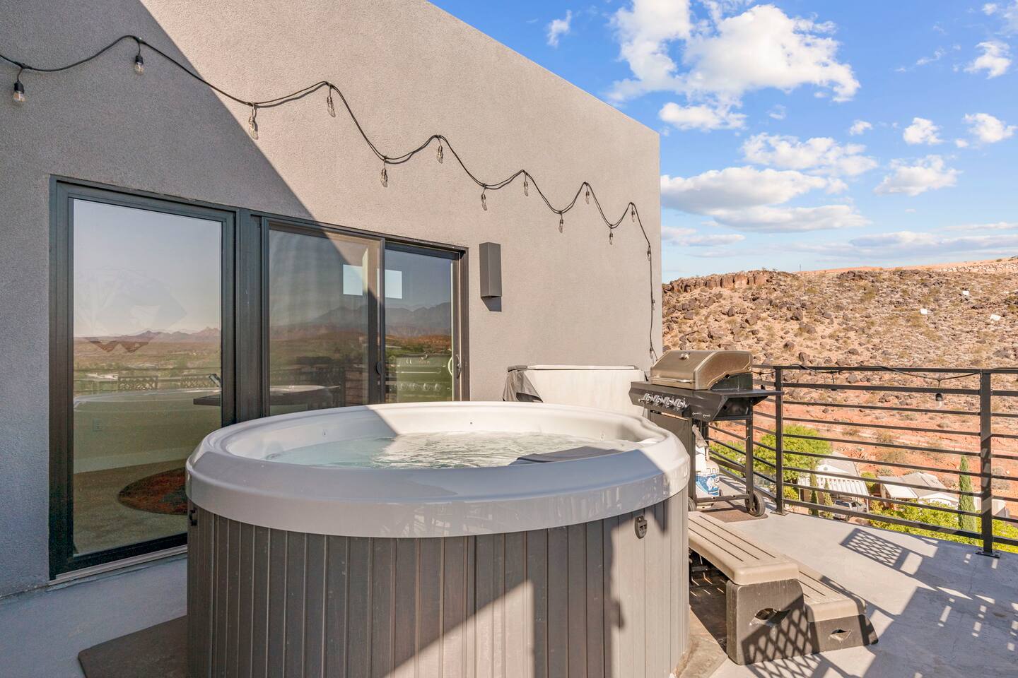 As you step into the first floor, you're greeted with stylish entry mats that set the tone for your stay. You'll find a fully stocked laundry room, making it easy to handle any washing needs during your visit. This floor also features a cozy bedroom with two queen beds, perfect for accommodating multiple guests comfortably. This bedroom has its own private bathroom for added convenience and privacy. The second floor boasts a spacious and combined kitchen, living, and dining area. The kitchen is fully equipped with all essentials, plus a blender, waffle iron, and crockpot. You'll also have your own personal Keurig coffee station. Enjoy your morning brew on the balcony overlooking the stunning Pine Valley Mountains. The living area features a huge modular couch that can be rearranged into one giant piece, like a bed. For your entertainment, there's a 120-inch projector screen that offers a home cinema experience, complete with extra cozy blankets and popcorn buckets. The dining area includes an 8-person counter-height table, perfect for meals and games. Off the living area, the balcony seats seven and features a fire table, making it the perfect spot to relax and unwind while enjoying the beautiful views. Additionally, the second floor includes a master bedroom with an ensuite bathroom, all designed in a modern boho theme, providing a luxurious and cozy atmosphere. On your way up to the third floor, you'll discover a cozy reading nook with deluxe chairs and abstract art above a personal work station, creating a perfect spot for relaxation or productivity. On the third floor, you'll find a game table that seats 8, perfect for game nights with friends and family. Play Texas Hold'em, Poker, Blackjack, Giant Jenga, or any other game you fancy. Plus, there's a large HD flat-screen TV and a mini bar stocked with everything you need for delicious cocktails and mocktails. It's a blast and promises a fun time for everyone! The rooftop patio is the perfect spot to unwind. It features a hot tub, bar height table overlooking the city, ideal for enjoying the view with friends or family and adirondack chairs are available for a relaxing and comfortable experience. Enjoy the serene atmosphere and take in the beautiful surroundings! The third master suite, conveniently located off the game area on the third floor, offers an incredible view from floor to ceiling windows. It features a luxurious modern theme, full-length mirror, and both the bed and dresser are enhanced with LED lighting to create a relaxing ambiance. The attached ensuite bathroom is well-appointed with double sinks, a walk-in closet, and a storage closet, ensuring ample space for all your needs. This stunning property is the perfect blend of luxury and comfort, offering spacious master suites, modern amenities, and breathtaking views. Whether you're relaxing in the game area, enjoying the deluxe bedrooms, or unwinding in the elegant ensuite bathrooms, every detail has been thoughtfully designed to provide an unforgettable stay. With a rooftop spa for ultimate relaxation and a home cinema for cozy movie nights, this getaway promises to be extraordinary. Book now and experience the ultimate retreat!