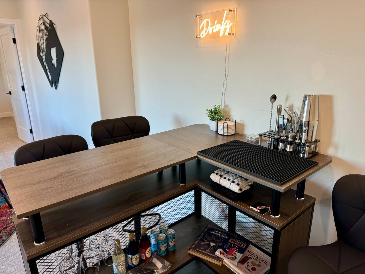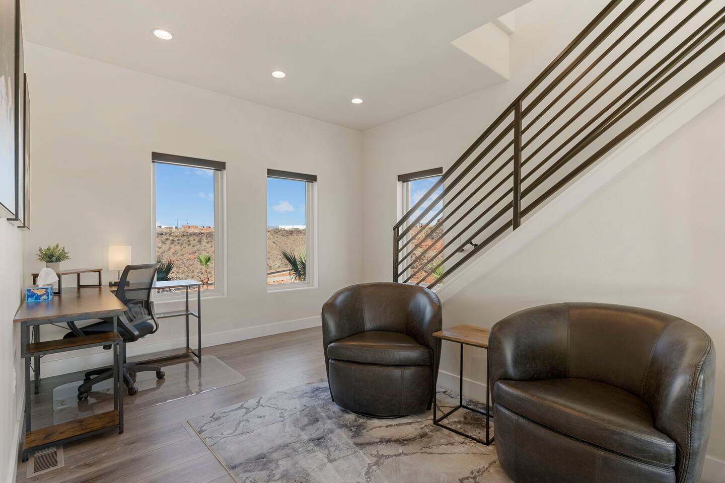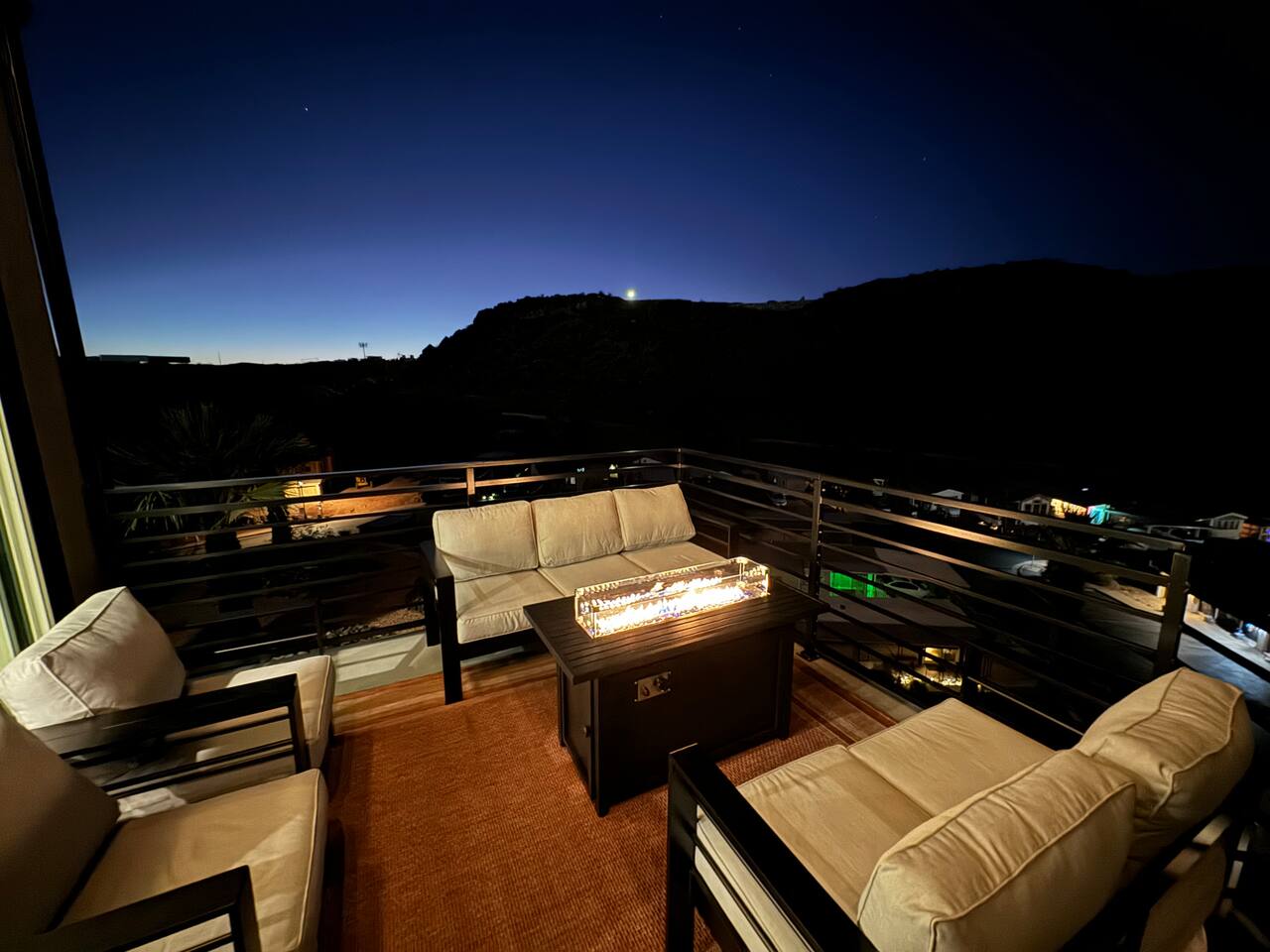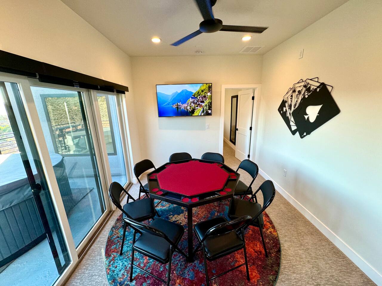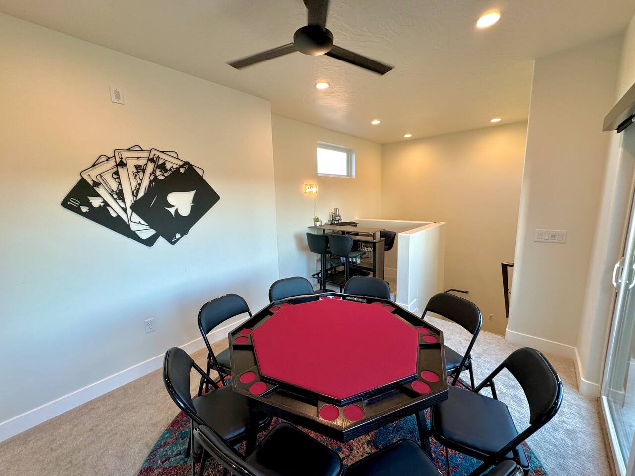 As you step into the first floor, you're greeted with stylish entry mats that set the tone for your stay. You'll find a fully stocked laundry room, making it easy to handle any washing needs during your visit. This floor also features a cozy bedroom with two queen beds, perfect for accommodating multiple guests comfortably. This bedroom has its own private bathroom for added convenience and privacy. The second floor boasts a spacious and combined kitchen, living, and dining area. The kitchen is fully equipped with all essentials, plus a blender, waffle iron, and crockpot. You'll also have your own personal Keurig coffee station. Enjoy your morning brew on the balcony overlooking the stunning Pine Valley Mountains. The living area features a huge modular couch that can be rearranged into one giant piece, like a bed. For your entertainment, there's a 120-inch projector screen that offers a home cinema experience, complete with extra cozy blankets and popcorn buckets. The dining area includes an 8-person counter-height table, perfect for meals and games. Off the living area, the balcony seats seven and features a fire table, making it the perfect spot to relax and unwind while enjoying the beautiful views. Additionally, the second floor includes a master bedroom with an ensuite bathroom, all designed in a modern boho theme, providing a luxurious and cozy atmosphere. On your way up to the third floor, you'll discover a cozy reading nook with deluxe chairs and abstract art above a personal work station, creating a perfect spot for relaxation or productivity. On the third floor, you'll find a game table that seats 8, perfect for game nights with friends and family. Play Texas Hold'em, Poker, Blackjack, Giant Jenga, or any other game you fancy. Plus, there's a large HD flat-screen TV and a mini bar stocked with everything you need for delicious cocktails and mocktails. It's a blast and promises a fun time for everyone! The rooftop patio is the perfect spot to unwind. It features a hot tub, bar height table overlooking the city, ideal for enjoying the view with friends or family and adirondack chairs are available for a relaxing and comfortable experience. Enjoy the serene atmosphere and take in the beautiful surroundings! The third master suite, conveniently located off the game area on the third floor, offers an incredible view from floor to ceiling windows. It features a luxurious modern theme, full-length mirror, and both the bed and dresser are enhanced with LED lighting to create a relaxing ambiance. The attached ensuite bathroom is well-appointed with double sinks, a walk-in closet, and a storage closet, ensuring ample space for all your needs. This stunning property is the perfect blend of luxury and comfort, offering spacious master suites, modern amenities, and breathtaking views. Whether you're relaxing in the game area, enjoying the deluxe bedrooms, or unwinding in the elegant ensuite bathrooms, every detail has been thoughtfully designed to provide an unforgettable stay. With a rooftop spa for ultimate relaxation and a home cinema for cozy movie nights, this getaway promises to be extraordinary. Book now and experience the ultimate retreat!