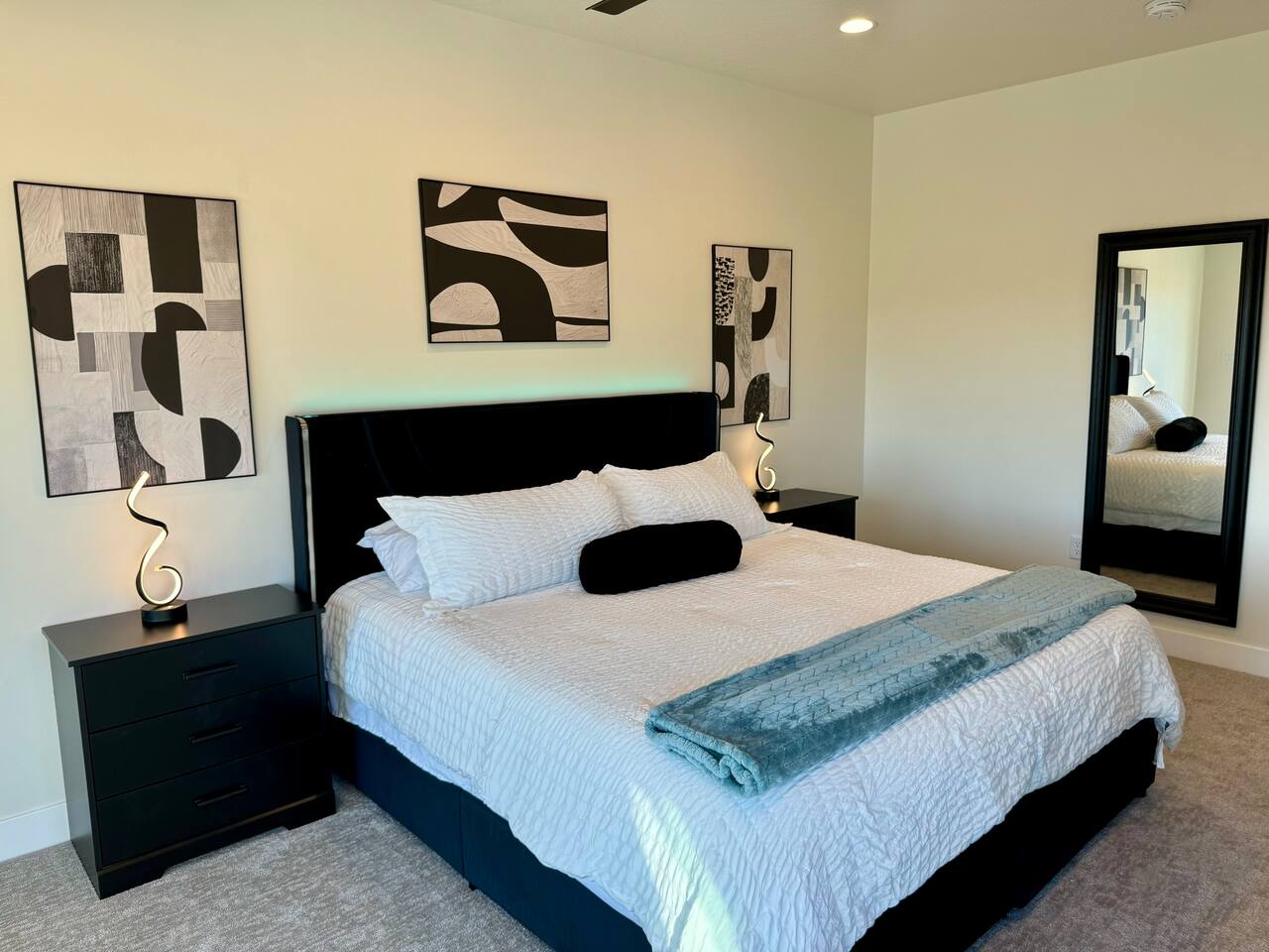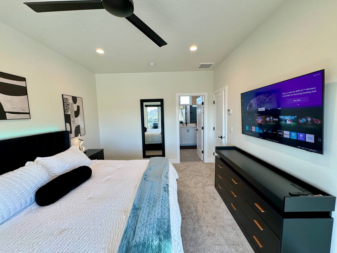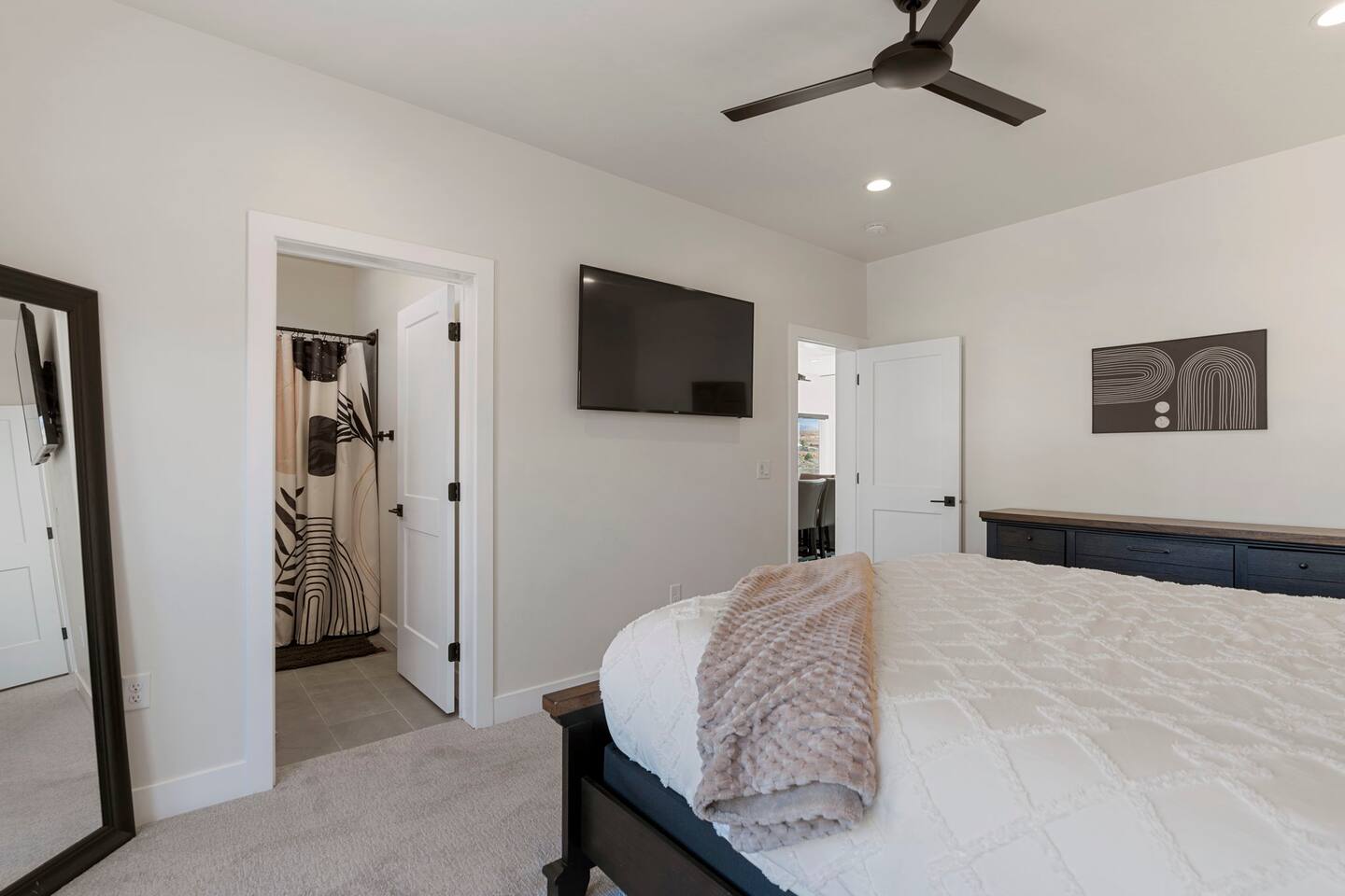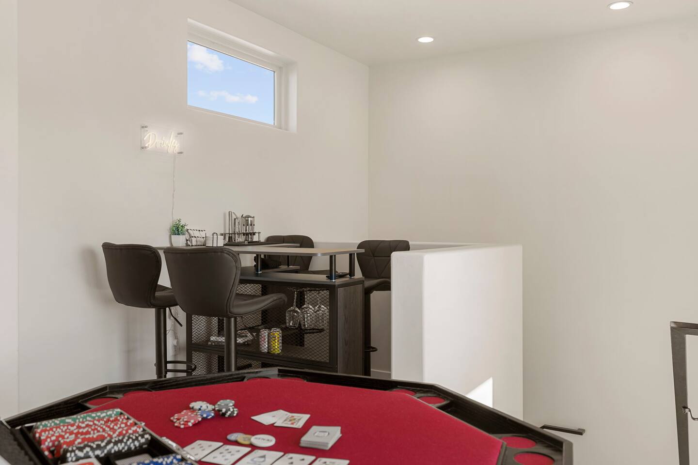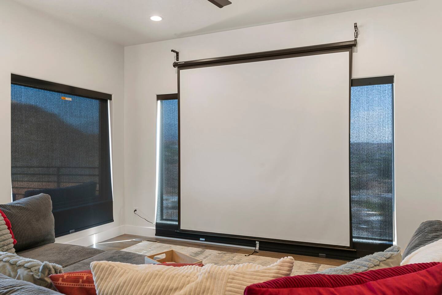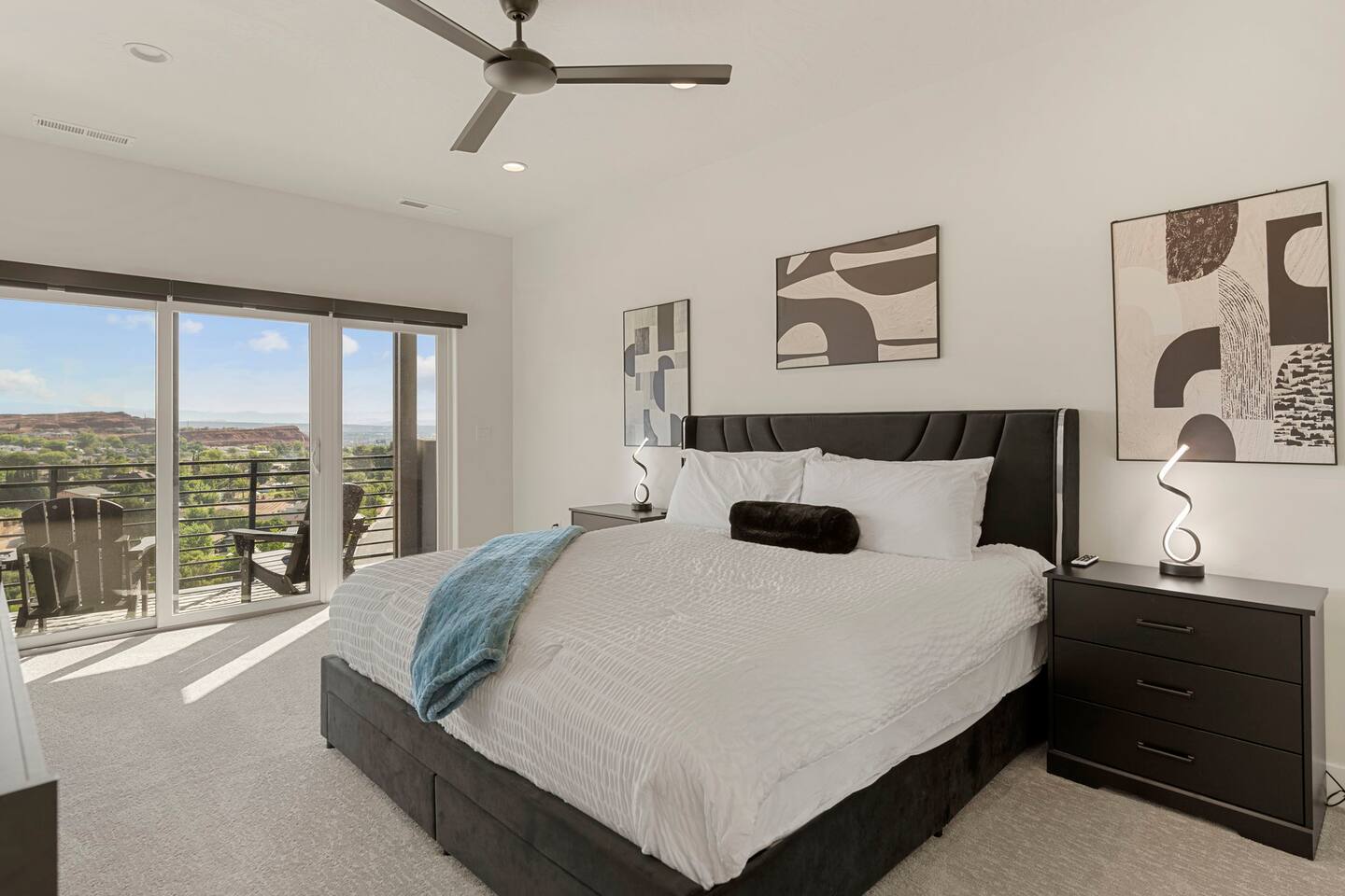 As you step into the first floor, you're greeted with stylish entry mats that set the tone for your stay. You'll find a fully stocked laundry room, making it easy to handle any washing needs during your visit. This floor also features a cozy bedroom with two queen beds, perfect for accommodating multiple guests comfortably. This bedroom has its own private bathroom for added convenience and privacy. The second floor boasts a spacious and combined kitchen, living, and dining area. The kitchen is fully equipped with all essentials, plus a blender, waffle iron, and crockpot. You'll also have your own personal Keurig coffee station. Enjoy your morning brew on the balcony overlooking the stunning Pine Valley Mountains. The living area features a huge modular couch that can be rearranged into one giant piece, like a bed. For your entertainment, there's a 120-inch projector screen that offers a home cinema experience, complete with extra cozy blankets and popcorn buckets. The dining area includes an 8-person counter-height table, perfect for meals and games. Off the living area, the balcony seats seven and features a fire table, making it the perfect spot to relax and unwind while enjoying the beautiful views. Additionally, the second floor includes a master bedroom with an ensuite bathroom, all designed in a modern boho theme, providing a luxurious and cozy atmosphere. On your way up to the third floor, you'll discover a cozy reading nook with deluxe chairs and abstract art above a personal work station, creating a perfect spot for relaxation or productivity. On the third floor, you'll find a game table that seats 8, perfect for game nights with friends and family. Play Texas Hold'em, Poker, Blackjack, Giant Jenga, or any other game you fancy. Plus, there's a large HD flat-screen TV and a mini bar stocked with everything you need for delicious cocktails and mocktails. It's a blast and promises a fun time for everyone! The rooftop patio is the perfect spot to unwind. It features a hot tub, bar height table overlooking the city, ideal for enjoying the view with friends or family and adirondack chairs are available for a relaxing and comfortable experience. Enjoy the serene atmosphere and take in the beautiful surroundings! The third master suite, conveniently located off the game area on the third floor, offers an incredible view from floor to ceiling windows. It features a luxurious modern theme, full-length mirror, and both the bed and dresser are enhanced with LED lighting to create a relaxing ambiance. The attached ensuite bathroom is well-appointed with double sinks, a walk-in closet, and a storage closet, ensuring ample space for all your needs. This stunning property is the perfect blend of luxury and comfort, offering spacious master suites, modern amenities, and breathtaking views. Whether you're relaxing in the game area, enjoying the deluxe bedrooms, or unwinding in the elegant ensuite bathrooms, every detail has been thoughtfully designed to provide an unforgettable stay. With a rooftop spa for ultimate relaxation and a home cinema for cozy movie nights, this getaway promises to be extraordinary. Book now and experience the ultimate retreat!