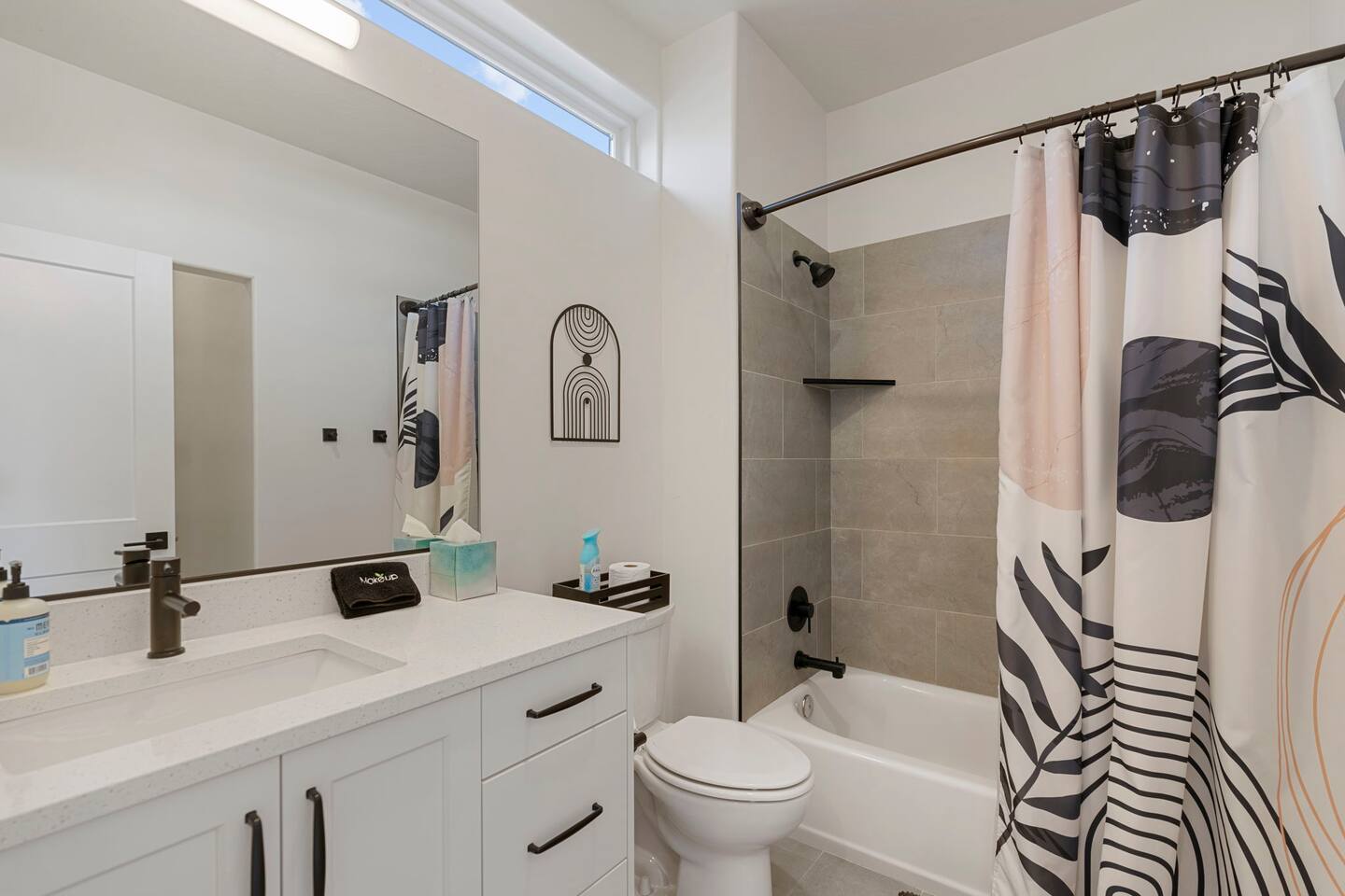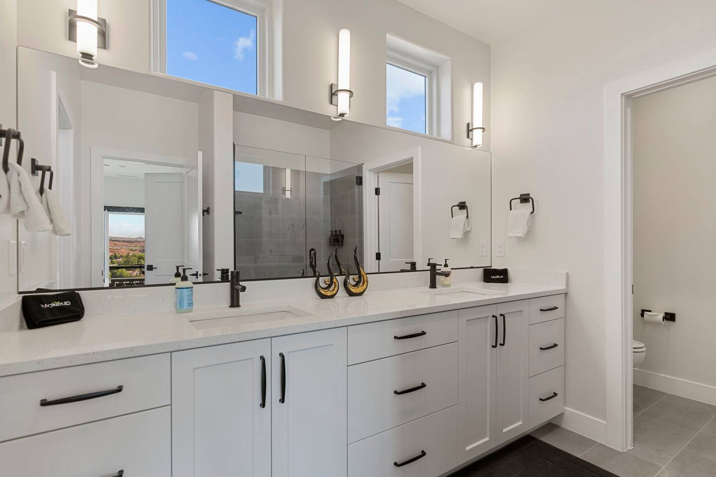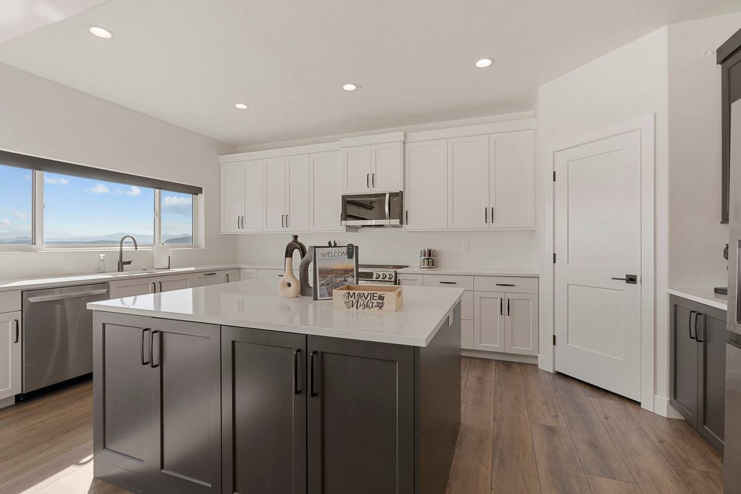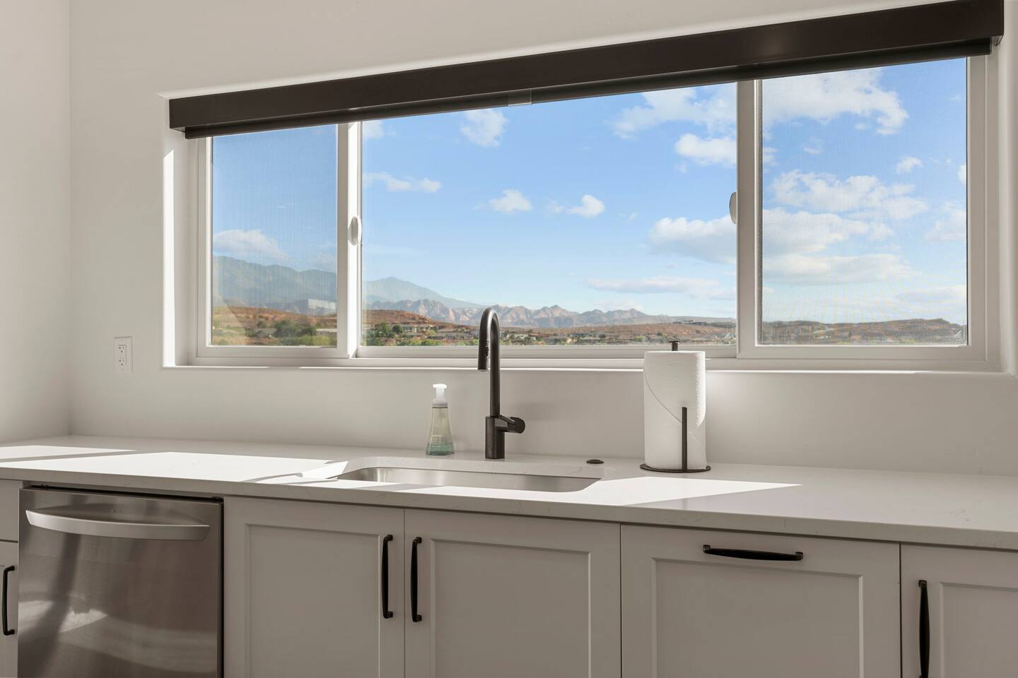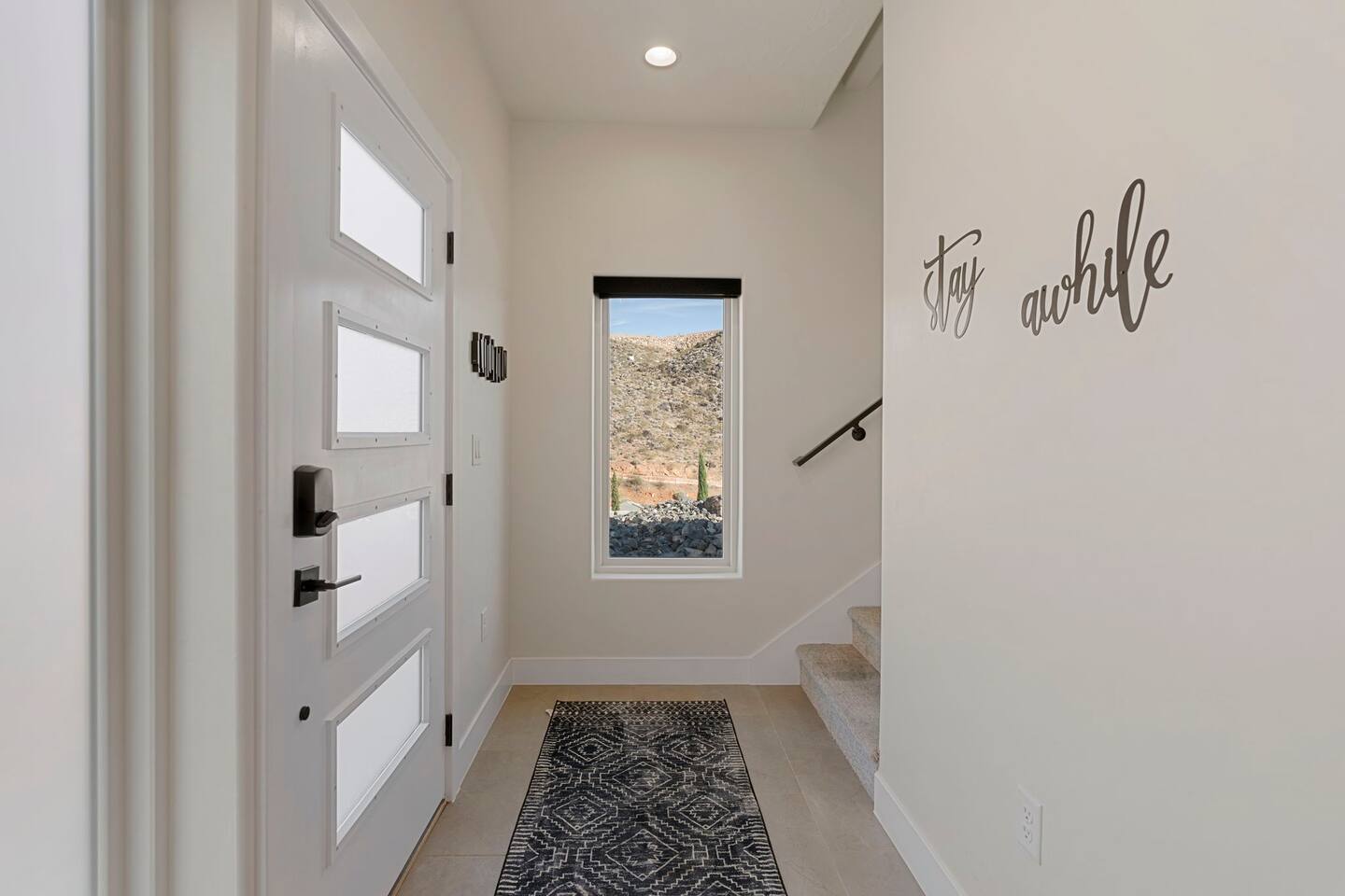As you step into the first floor, you're greeted with stylish entry mats that set the tone for your stay. You'll find a fully stocked laundry room, making it easy to handle any washing needs during your visit. This floor also features a cozy bedroom with two queen beds, perfect for accommodating multiple guests comfortably. This bedroom has its own private bathroom for added convenience and privacy. The second floor boasts a spacious and combined kitchen, living, and dining area. The kitchen is fully equipped with all essentials, plus a blender, waffle iron, and crockpot. You'll also have your own personal Keurig coffee station. Enjoy your morning brew on the balcony overlooking the stunning Pine Valley Mountains. The living area features a huge modular couch that can be rearranged into one giant piece, like a bed. For your entertainment, there's a 120-inch projector screen that offers a home cinema experience, complete with extra cozy blankets and popcorn buckets. The dining area includes an 8-person counter-height table, perfect for meals and games. Off the living area, the balcony seats seven and features a fire table, making it the perfect spot to relax and unwind while enjoying the beautiful views. Additionally, the second floor includes a master bedroom with an ensuite bathroom, all designed in a modern boho theme, providing a luxurious and cozy atmosphere. On your way up to the third floor, you'll discover a cozy reading nook with deluxe chairs and abstract art above a personal work station, creating a perfect spot for relaxation or productivity. On the third floor, you'll find a game table that seats 8, perfect for game nights with friends and family. Play Texas Hold'em, Poker, Blackjack, Giant Jenga, or any other game you fancy. Plus, there's a large HD flat-screen TV and a mini bar stocked with everything you need for delicious cocktails and mocktails. It's a blast and promises a fun time for everyone! The rooftop patio is the perfect spot to unwind. It features a hot tub, bar height table overlooking the city, ideal for enjoying the view with friends or family and adirondack chairs are available for a relaxing and comfortable experience. Enjoy the serene atmosphere and take in the beautiful surroundings! The third master suite, conveniently located off the game area on the third floor, offers an incredible view from floor to ceiling windows. It features a luxurious modern theme, full-length mirror, and both the bed and dresser are enhanced with LED lighting to create a relaxing ambiance. The attached ensuite bathroom is well-appointed with double sinks, a walk-in closet, and a storage closet, ensuring ample space for all your needs. This stunning property is the perfect blend of luxury and comfort, offering spacious master suites, modern amenities, and breathtaking views. Whether you're relaxing in the game area, enjoying the deluxe bedrooms, or unwinding in the elegant ensuite bathrooms, every detail has been thoughtfully designed to provide an unforgettable stay. With a rooftop spa for ultimate relaxation and a home cinema for cozy movie nights, this getaway promises to be extraordinary. Book now and experience the ultimate retreat!