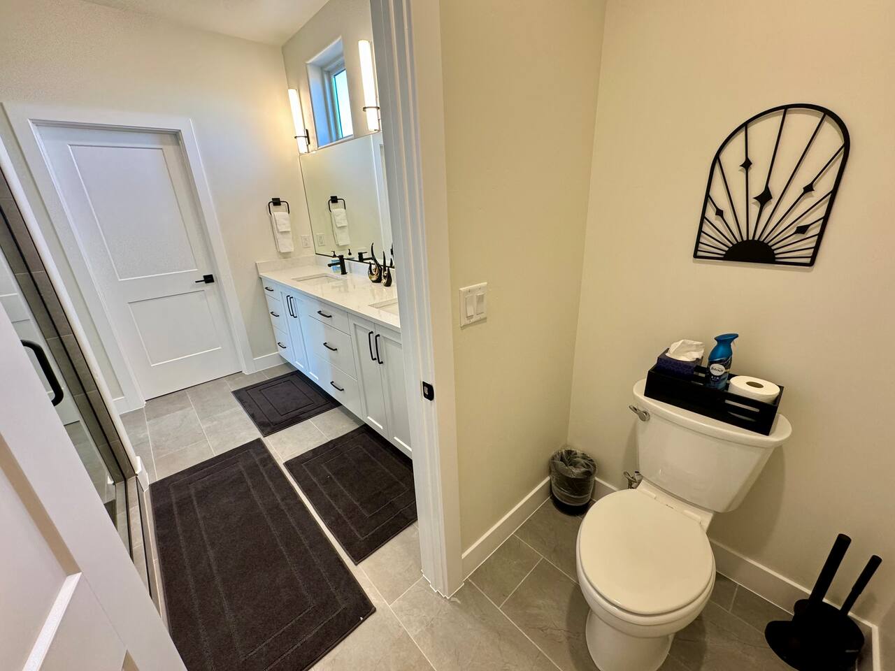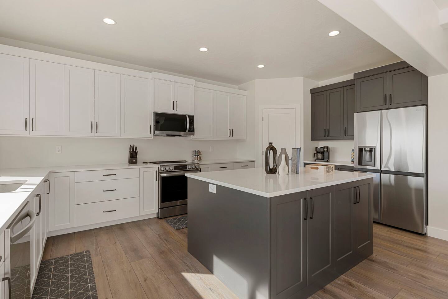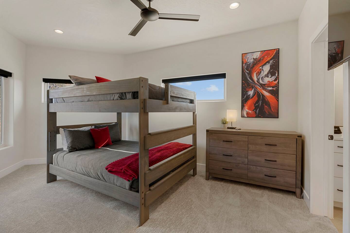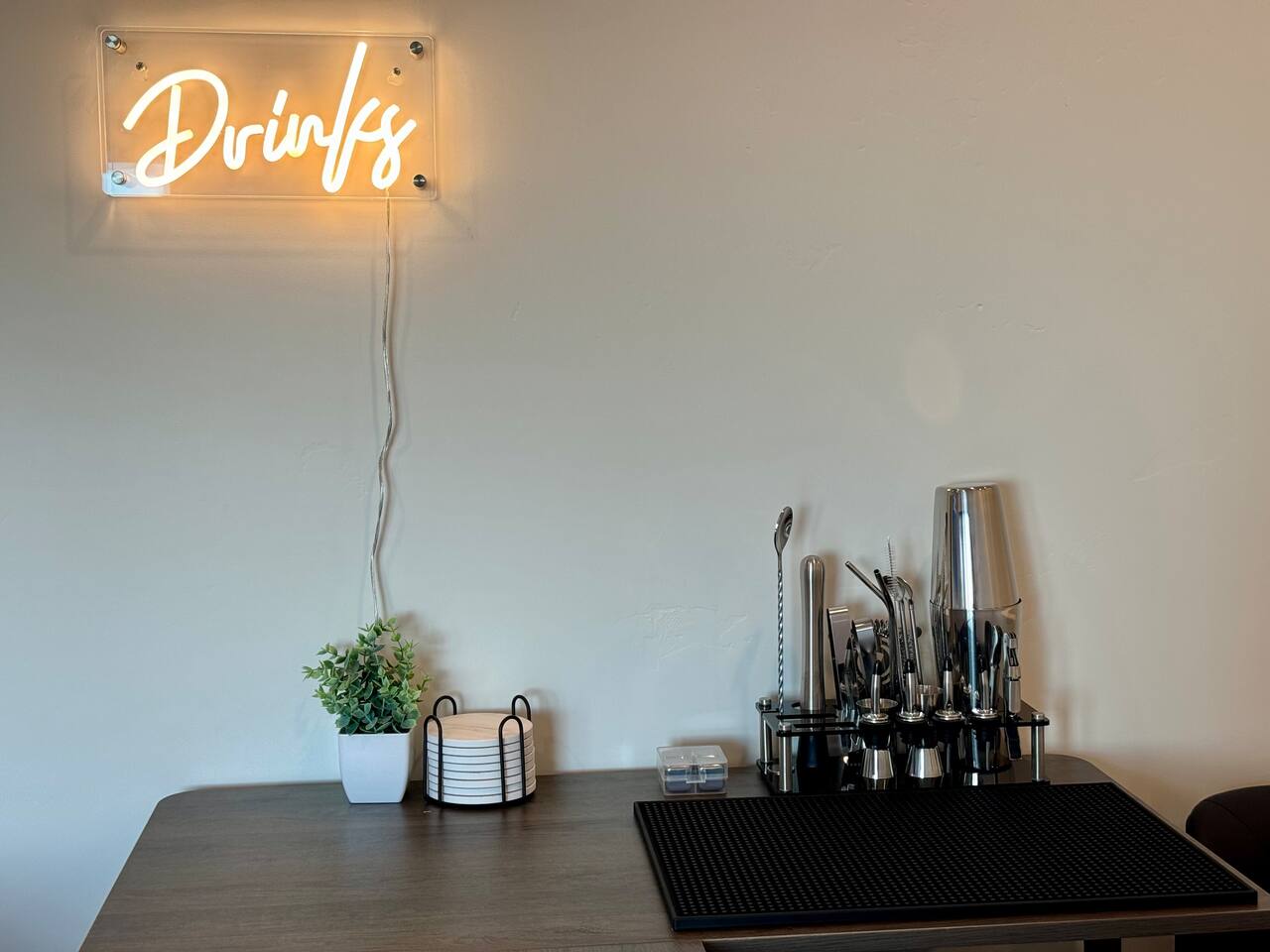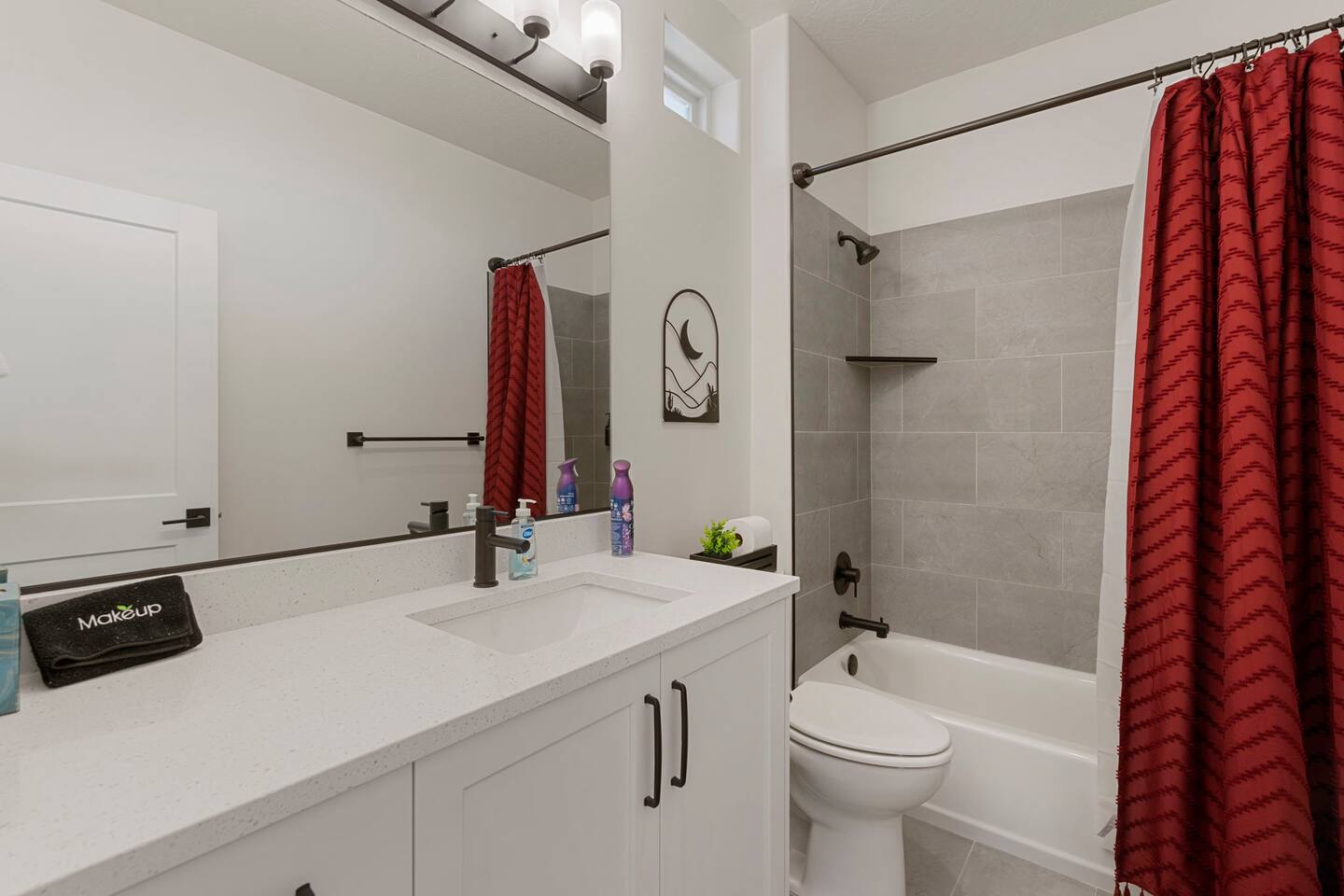As you step into the first floor, you're greeted with stylish entry mats that set the tone for your stay. You'll find a fully stocked laundry room, making it easy to handle any washing needs during your visit. This floor also features a cozy bedroom with two queen beds, perfect for accommodating multiple guests comfortably. This bedroom has its own private bathroom for added convenience and privacy. The second floor boasts a spacious and combined kitchen, living, and dining area. The kitchen is fully equipped with all essentials, plus a blender, waffle iron, and crockpot. You'll also have your own personal Keurig coffee station. Enjoy your morning brew on the balcony overlooking the stunning Pine Valley Mountains. The living area features a huge modular couch that can be rearranged into one giant piece, like a bed. For your entertainment, there's a 120-inch projector screen that offers a home cinema experience, complete with extra cozy blankets and popcorn buckets. The dining area includes an 8-person counter-height table, perfect for meals and games. Off the living area, the balcony seats seven and features a fire table, making it the perfect spot to relax and unwind while enjoying the beautiful views. Additionally, the second floor includes a master bedroom with an ensuite bathroom, all designed in a modern boho theme, providing a luxurious and cozy atmosphere. On your way up to the third floor, you'll discover a cozy reading nook with deluxe chairs and abstract art above a personal work station, creating a perfect spot for relaxation or productivity. On the third floor, you'll find a game table that seats 8, perfect for game nights with friends and family. Play Texas Hold'em, Poker, Blackjack, Giant Jenga, or any other game you fancy. Plus, there's a large HD flat-screen TV and a mini bar stocked with everything you need for delicious cocktails and mocktails. It's a blast and promises a fun time for everyone! The rooftop patio is the perfect spot to unwind. It features a hot tub, bar height table overlooking the city, ideal for enjoying the view with friends or family and adirondack chairs are available for a relaxing and comfortable experience. Enjoy the serene atmosphere and take in the beautiful surroundings! The third master suite, conveniently located off the game area on the third floor, offers an incredible view from floor to ceiling windows. It features a luxurious modern theme, full-length mirror, and both the bed and dresser are enhanced with LED lighting to create a relaxing ambiance. The attached ensuite bathroom is well-appointed with double sinks, a walk-in closet, and a storage closet, ensuring ample space for all your needs. This stunning property is the perfect blend of luxury and comfort, offering spacious master suites, modern amenities, and breathtaking views. Whether you're relaxing in the game area, enjoying the deluxe bedrooms, or unwinding in the elegant ensuite bathrooms, every detail has been thoughtfully designed to provide an unforgettable stay. With a rooftop spa for ultimate relaxation and a home cinema for cozy movie nights, this getaway promises to be extraordinary. Book now and experience the ultimate retreat!