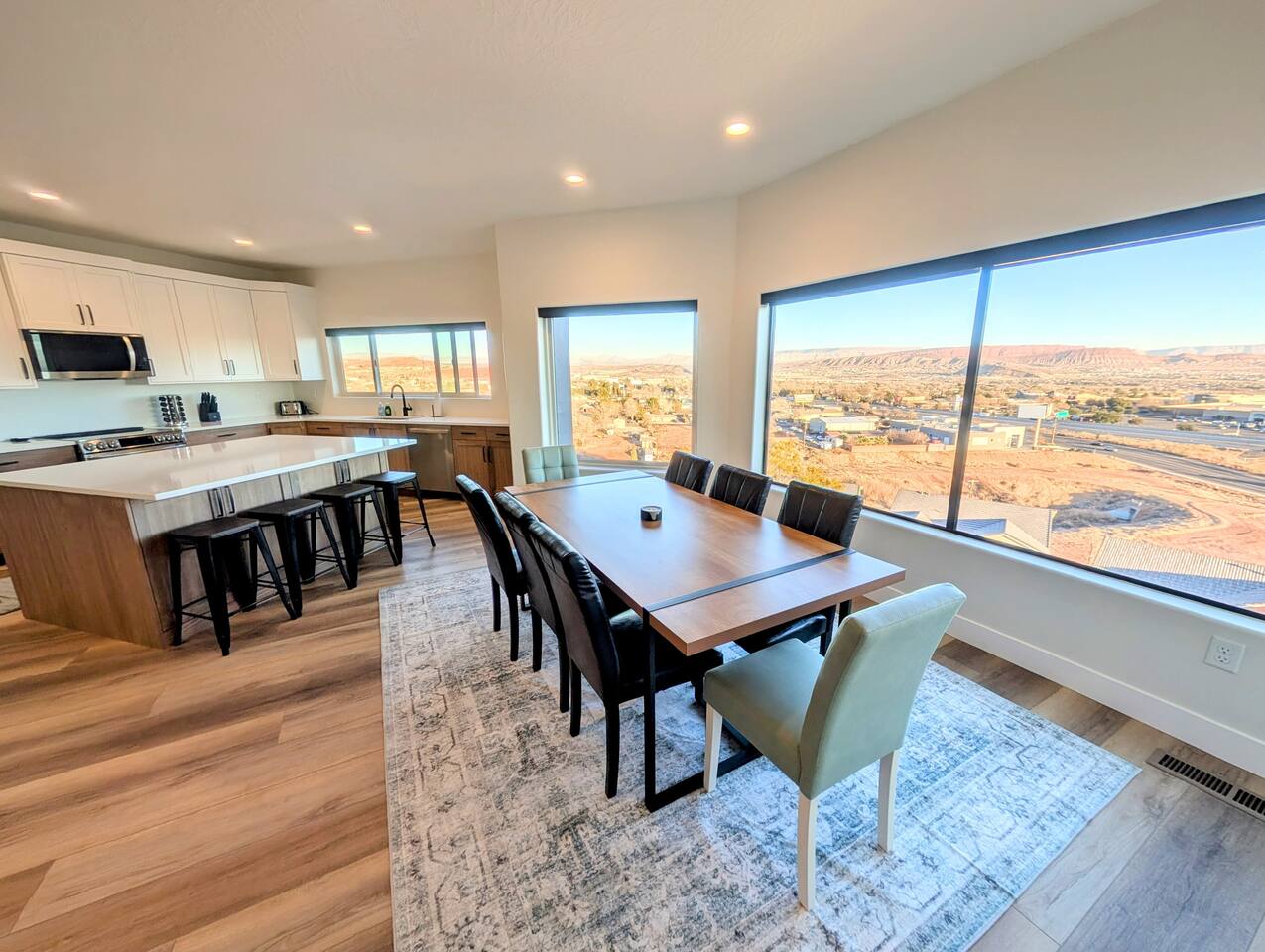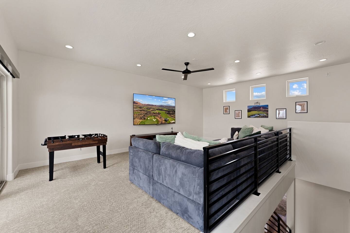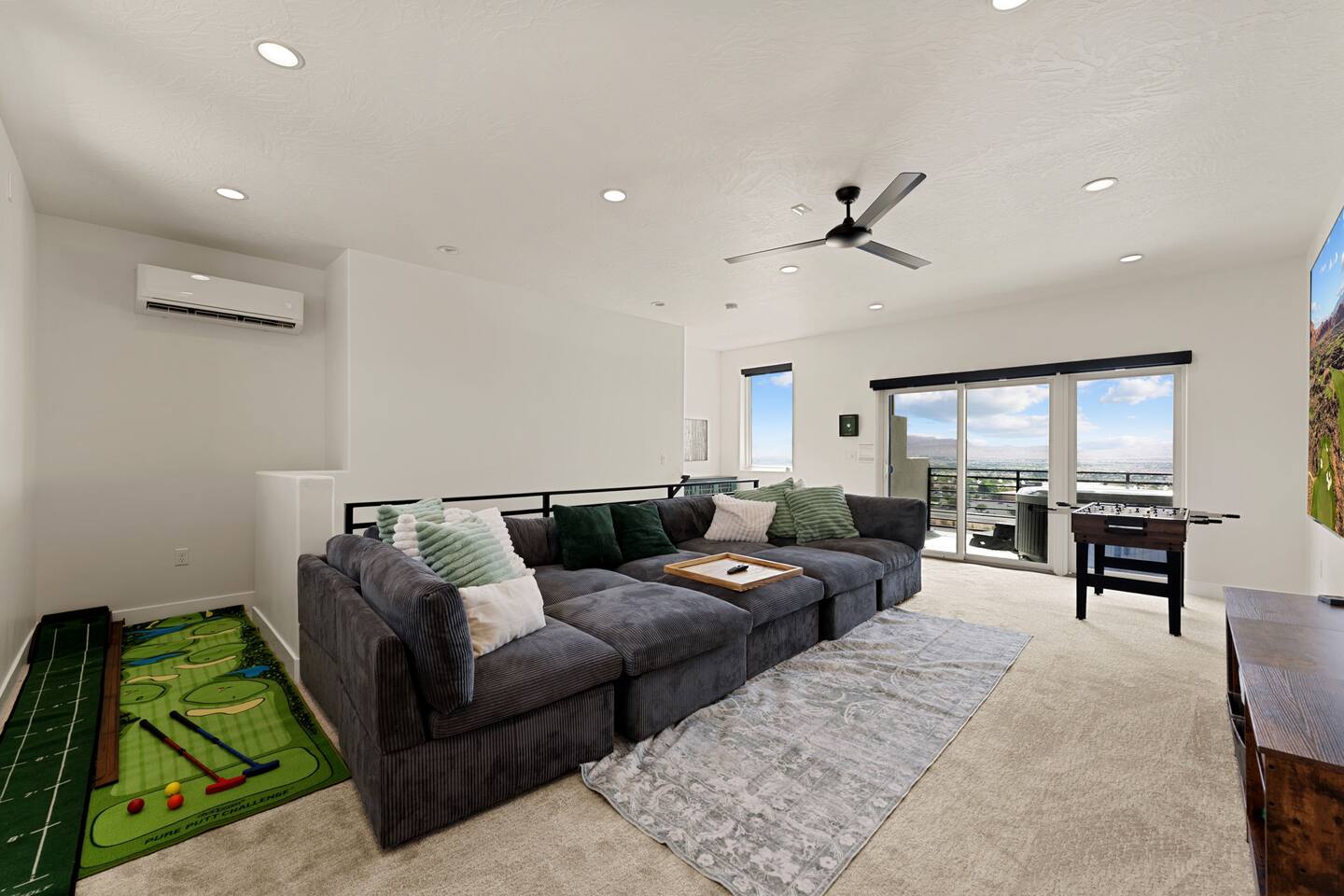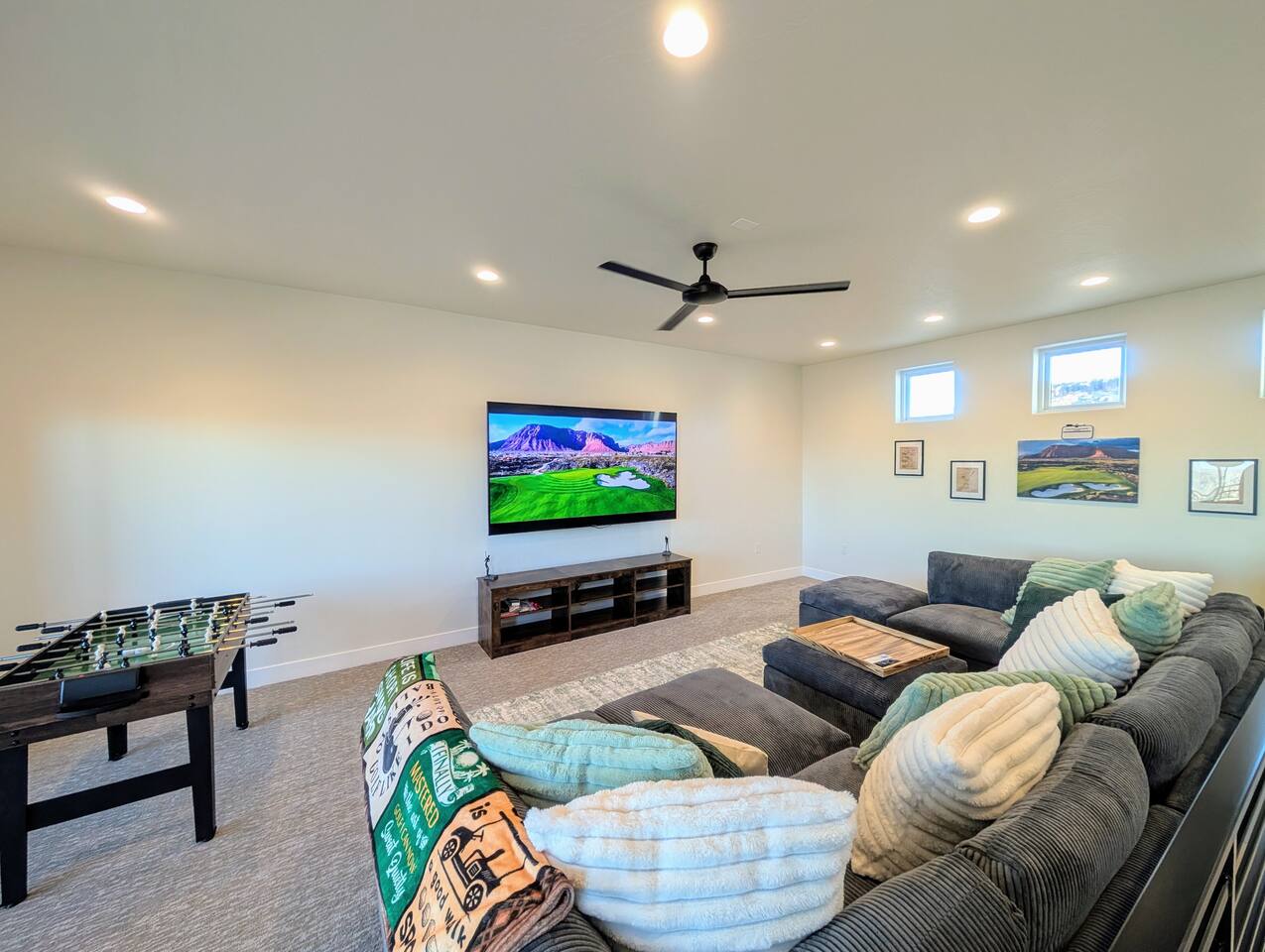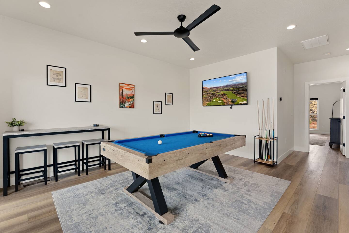 Message us for a special offer on your summer stay! As you step inside, the first floor welcomes you with a two-car deep garage equipped with an EV charger and a stylish entryway. Down the hall, you'll discover the first cozy king master bedroom with an ensuite bathroom, a plush mattress, and a flat-screen TV. Above the bed, there's a beautiful photo of Sand Hollow Golf Resort course. Continuing on, you'll find the hall bathroom, a fully stocked laundry room ready for use, and the second bedroom with queen over queen adult bunk beds, with the top bunk rated to 400 lbs and ample storage. Both bathrooms are equipped with all essential soaps and deluxe towels for your comfort. The second floor boasts a large, open-concept kitchen, dining, and game area with breathtaking 360-degree views of St. George, Zion National Park, and the mesas beyond. The kitchen is fully equipped with all the essentials, plus a blender, crockpot, and waffle iron. The island counter can accommodate 3 people, while the kitchen table comfortably seats 8. Adjacent to the kitchen is a large work station with fast WiFi. Step outside to the expansive balcony, where you'll find seating for 6 around a cozy fire table, perfect for enjoying evening sunsets. Enjoy the pool room, perfect for great billiard fun, complete with a 65-inch TV for watching the game. Off this room is a convenient half bath. The second king master bedroom features an ensuite bathroom, a flat-screen TV, and a plush mattress, adorned with art depicting the Desert Color Resort. The third floor is dedicated to fun and relaxation. It features a game cabinet filled with a variety of entertainment options, a versatile 10-in-1 foosball game table, and a spacious modular sectional that seats 10. Enjoy movie nights on the massive 86-inch TV, practice your putting skills on the indoor green, or challenge friends to a mini putt-putt golf game. The space is adorned with art from the Black Desert Golf Resort and vintage golf patent designs. Step out onto the rooftop patio to unwind in the 6-person hot tub, offering breathtaking views of the city skyline and twinkling city lights. This stunning property offers the perfect blend of luxury and entertainment, with amenities designed for both relaxation and fun. Whether you're enjoying the breathtaking views from the rooftop hot tub, hosting a movie night on the third floor, playing a game of pool, or cooking a delicious meal in the fully equipped kitchen, there's something for everyone. Don't miss out on this incredible getaway—book your stay today and experience all that this unique home has to offer!