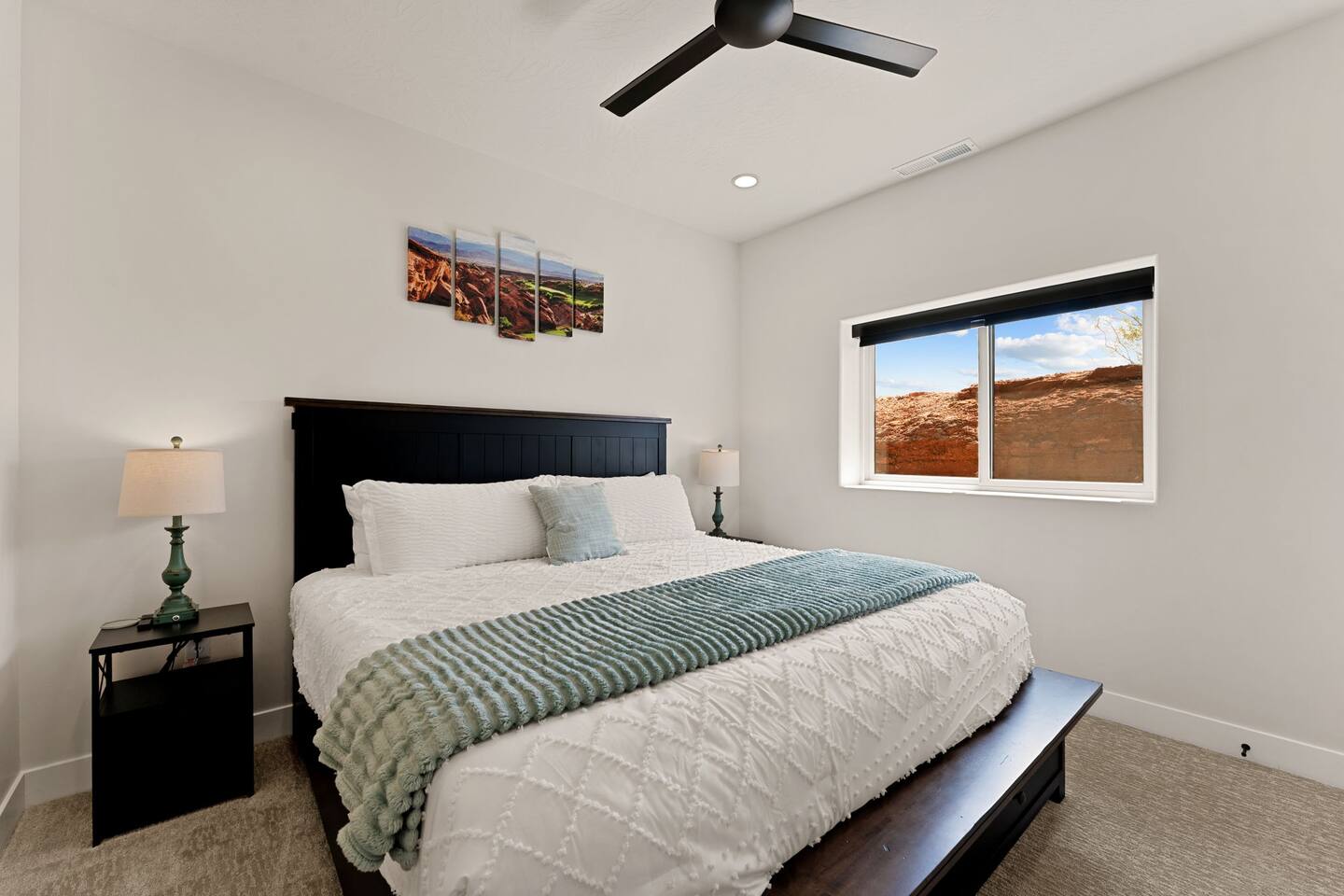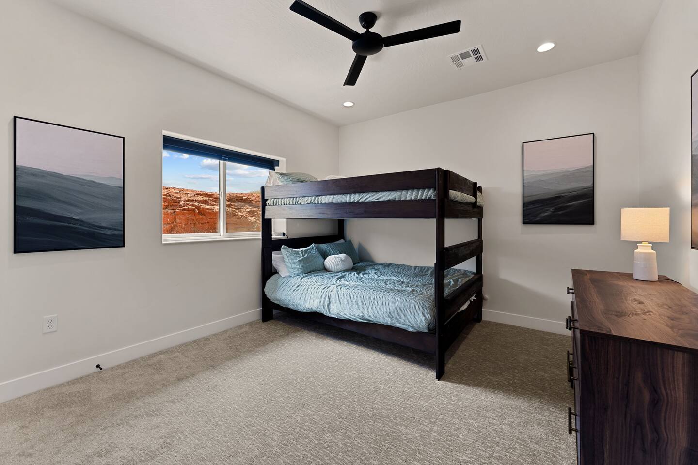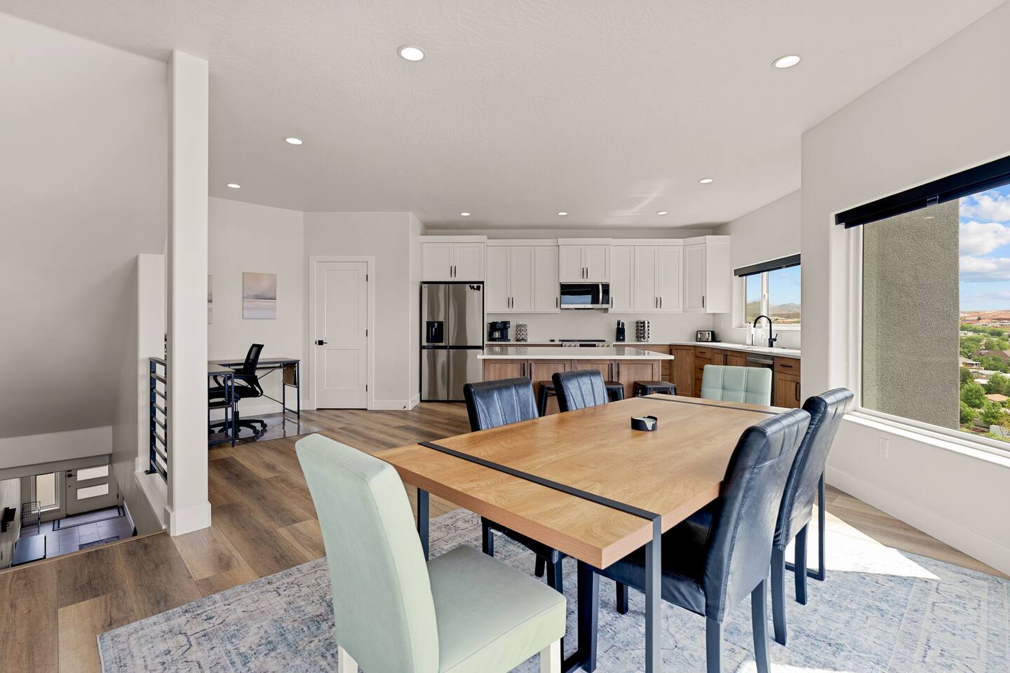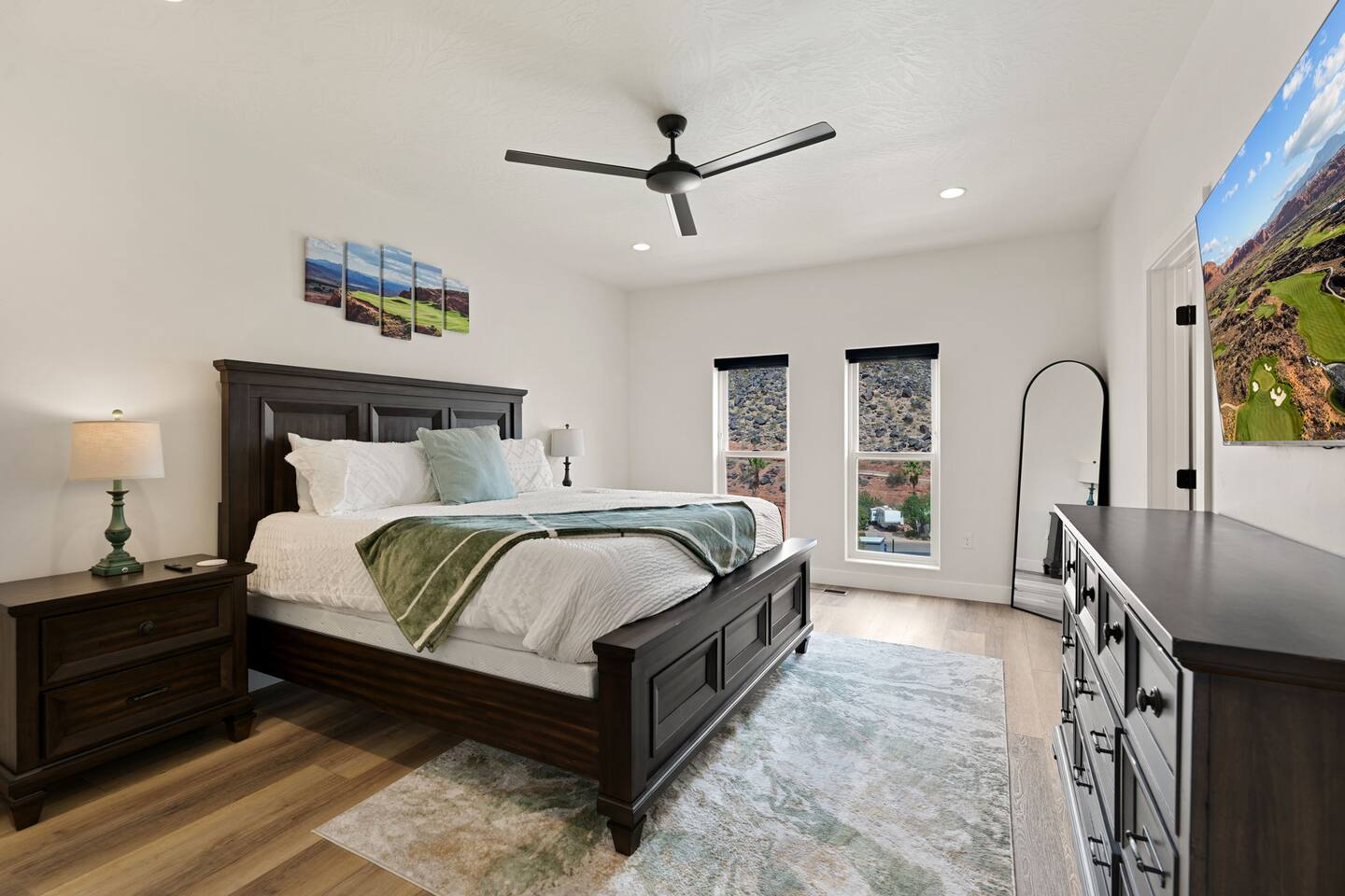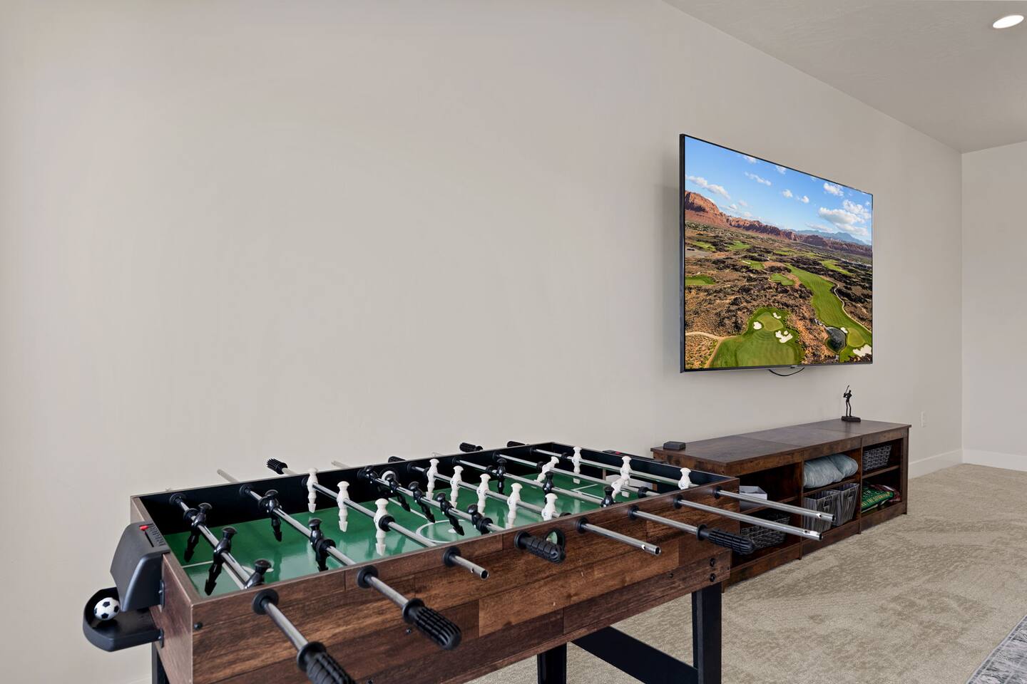 Message us for a special offer on your summer stay! As you step inside, the first floor welcomes you with a two-car deep garage equipped with an EV charger and a stylish entryway. Down the hall, you'll discover the first cozy king master bedroom with an ensuite bathroom, a plush mattress, and a flat-screen TV. Above the bed, there's a beautiful photo of Sand Hollow Golf Resort course. Continuing on, you'll find the hall bathroom, a fully stocked laundry room ready for use, and the second bedroom with queen over queen adult bunk beds, with the top bunk rated to 400 lbs and ample storage. Both bathrooms are equipped with all essential soaps and deluxe towels for your comfort. The second floor boasts a large, open-concept kitchen, dining, and game area with breathtaking 360-degree views of St. George, Zion National Park, and the mesas beyond. The kitchen is fully equipped with all the essentials, plus a blender, crockpot, and waffle iron. The island counter can accommodate 3 people, while the kitchen table comfortably seats 8. Adjacent to the kitchen is a large work station with fast WiFi. Step outside to the expansive balcony, where you'll find seating for 6 around a cozy fire table, perfect for enjoying evening sunsets. Enjoy the pool room, perfect for great billiard fun, complete with a 65-inch TV for watching the game. Off this room is a convenient half bath. The second king master bedroom features an ensuite bathroom, a flat-screen TV, and a plush mattress, adorned with art depicting the Desert Color Resort. The third floor is dedicated to fun and relaxation. It features a game cabinet filled with a variety of entertainment options, a versatile 10-in-1 foosball game table, and a spacious modular sectional that seats 10. Enjoy movie nights on the massive 86-inch TV, practice your putting skills on the indoor green, or challenge friends to a mini putt-putt golf game. The space is adorned with art from the Black Desert Golf Resort and vintage golf patent designs. Step out onto the rooftop patio to unwind in the 6-person hot tub, offering breathtaking views of the city skyline and twinkling city lights. This stunning property offers the perfect blend of luxury and entertainment, with amenities designed for both relaxation and fun. Whether you're enjoying the breathtaking views from the rooftop hot tub, hosting a movie night on the third floor, playing a game of pool, or cooking a delicious meal in the fully equipped kitchen, there's something for everyone. Don't miss out on this incredible getaway—book your stay today and experience all that this unique home has to offer!