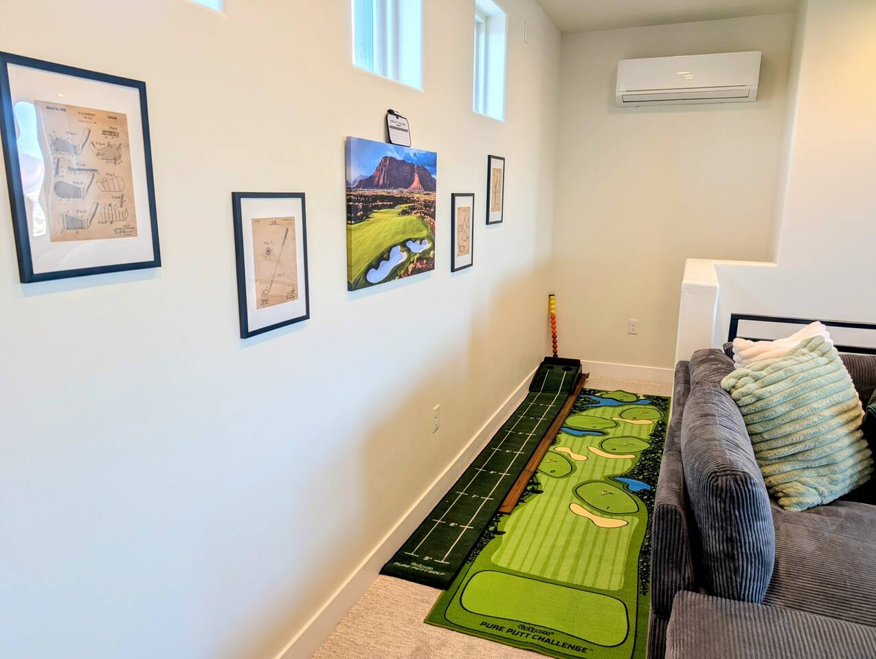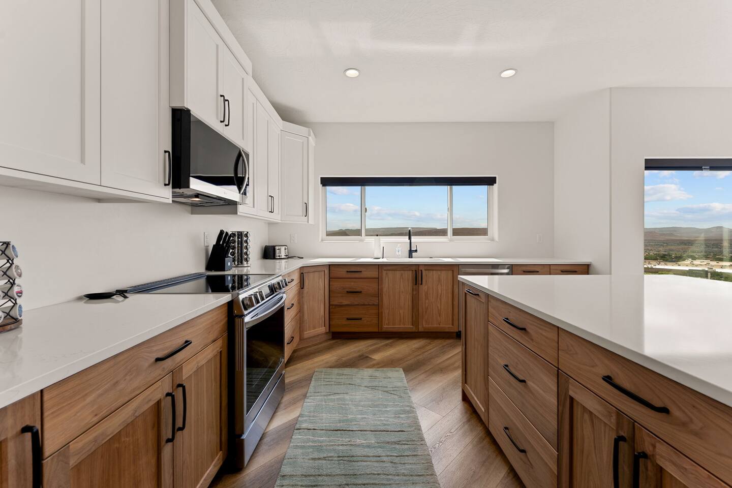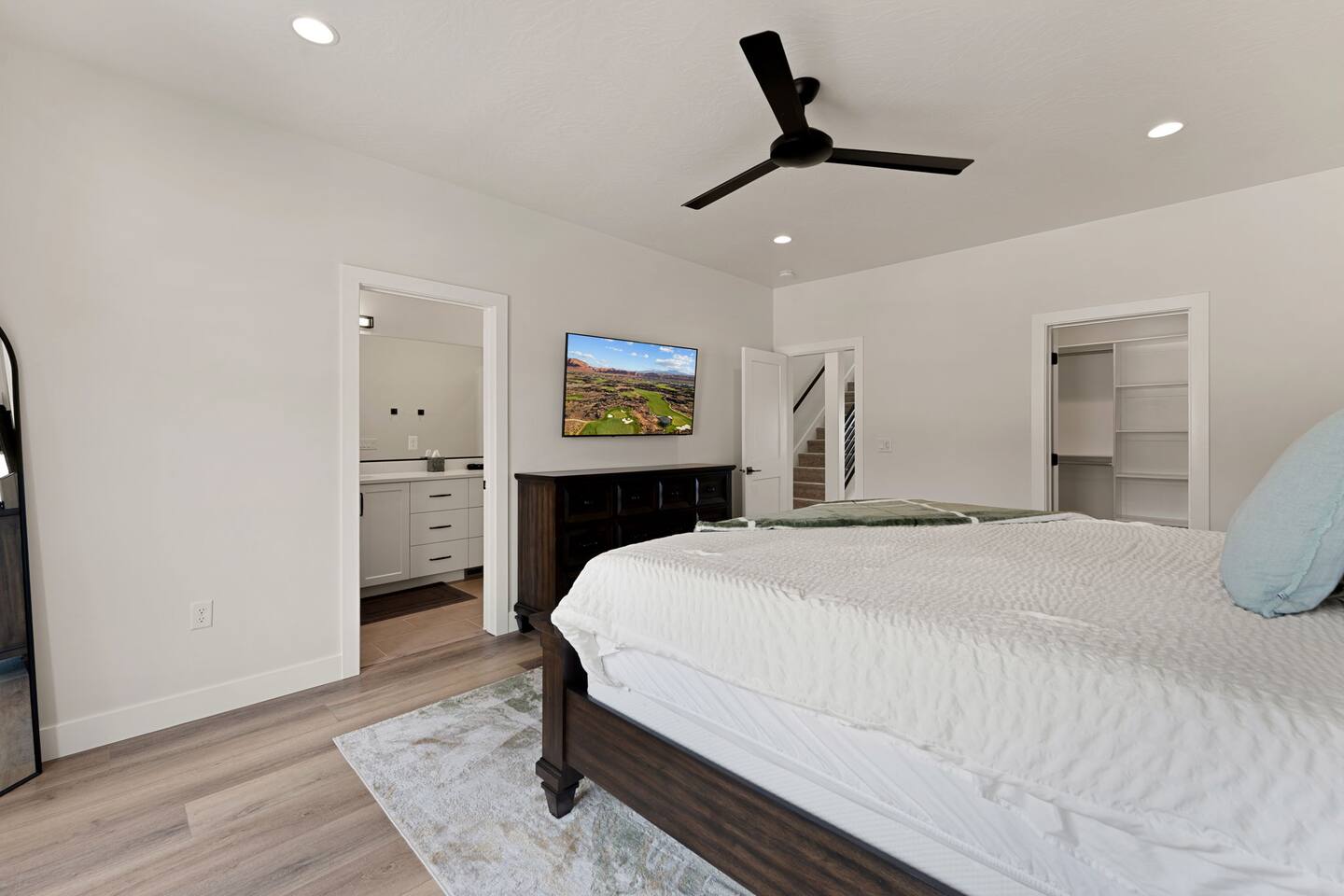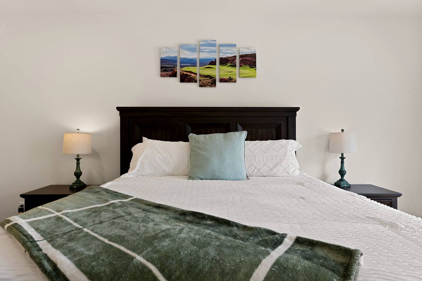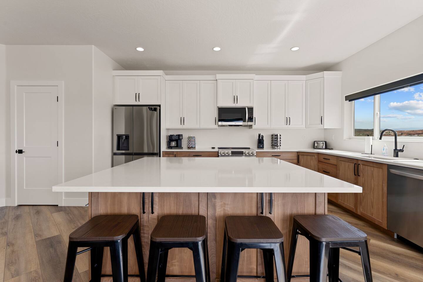 Message us for a special offer on your summer stay! As you step inside, the first floor welcomes you with a two-car deep garage equipped with an EV charger and a stylish entryway. Down the hall, you'll discover the first cozy king master bedroom with an ensuite bathroom, a plush mattress, and a flat-screen TV. Above the bed, there's a beautiful photo of Sand Hollow Golf Resort course. Continuing on, you'll find the hall bathroom, a fully stocked laundry room ready for use, and the second bedroom with queen over queen adult bunk beds, with the top bunk rated to 400 lbs and ample storage. Both bathrooms are equipped with all essential soaps and deluxe towels for your comfort. The second floor boasts a large, open-concept kitchen, dining, and game area with breathtaking 360-degree views of St. George, Zion National Park, and the mesas beyond. The kitchen is fully equipped with all the essentials, plus a blender, crockpot, and waffle iron. The island counter can accommodate 3 people, while the kitchen table comfortably seats 8. Adjacent to the kitchen is a large work station with fast WiFi. Step outside to the expansive balcony, where you'll find seating for 6 around a cozy fire table, perfect for enjoying evening sunsets. Enjoy the pool room, perfect for great billiard fun, complete with a 65-inch TV for watching the game. Off this room is a convenient half bath. The second king master bedroom features an ensuite bathroom, a flat-screen TV, and a plush mattress, adorned with art depicting the Desert Color Resort. The third floor is dedicated to fun and relaxation. It features a game cabinet filled with a variety of entertainment options, a versatile 10-in-1 foosball game table, and a spacious modular sectional that seats 10. Enjoy movie nights on the massive 86-inch TV, practice your putting skills on the indoor green, or challenge friends to a mini putt-putt golf game. The space is adorned with art from the Black Desert Golf Resort and vintage golf patent designs. Step out onto the rooftop patio to unwind in the 6-person hot tub, offering breathtaking views of the city skyline and twinkling city lights. This stunning property offers the perfect blend of luxury and entertainment, with amenities designed for both relaxation and fun. Whether you're enjoying the breathtaking views from the rooftop hot tub, hosting a movie night on the third floor, playing a game of pool, or cooking a delicious meal in the fully equipped kitchen, there's something for everyone. Don't miss out on this incredible getaway—book your stay today and experience all that this unique home has to offer!